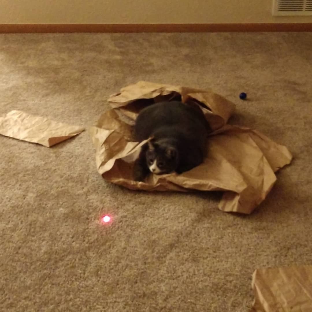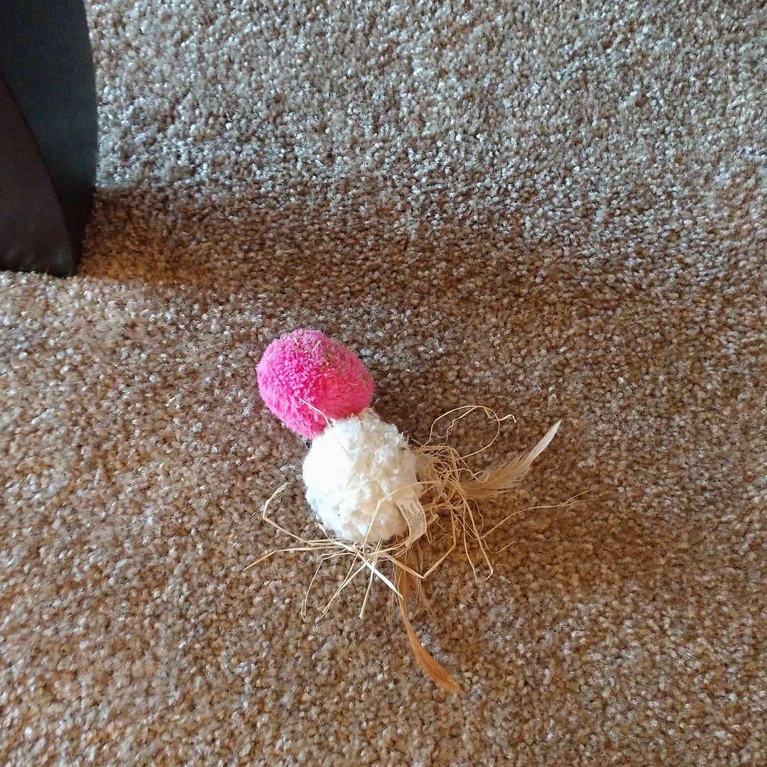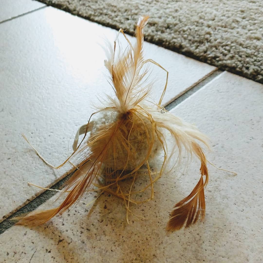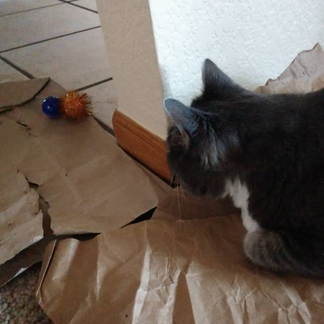 Ziggy was terrified of the white puff when it was attached to a string. But now that it is free, it is a worthy adversary! .