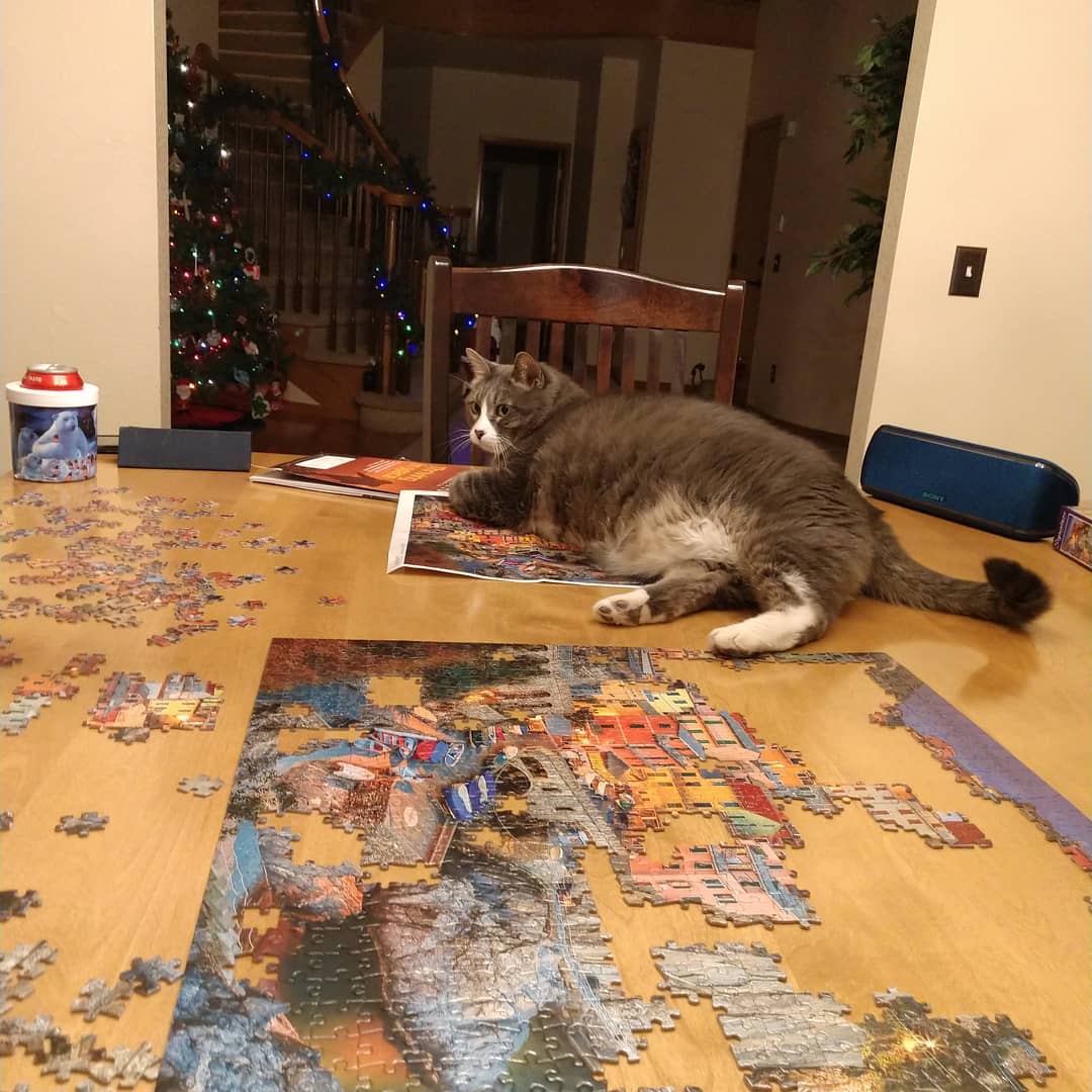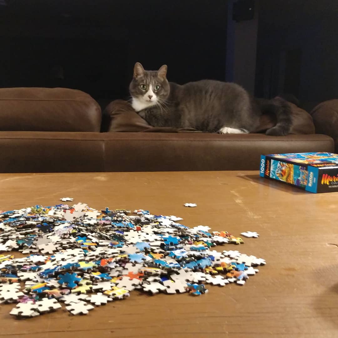 Ziggy just figured out I have set up the puzzle table in the office area. ????