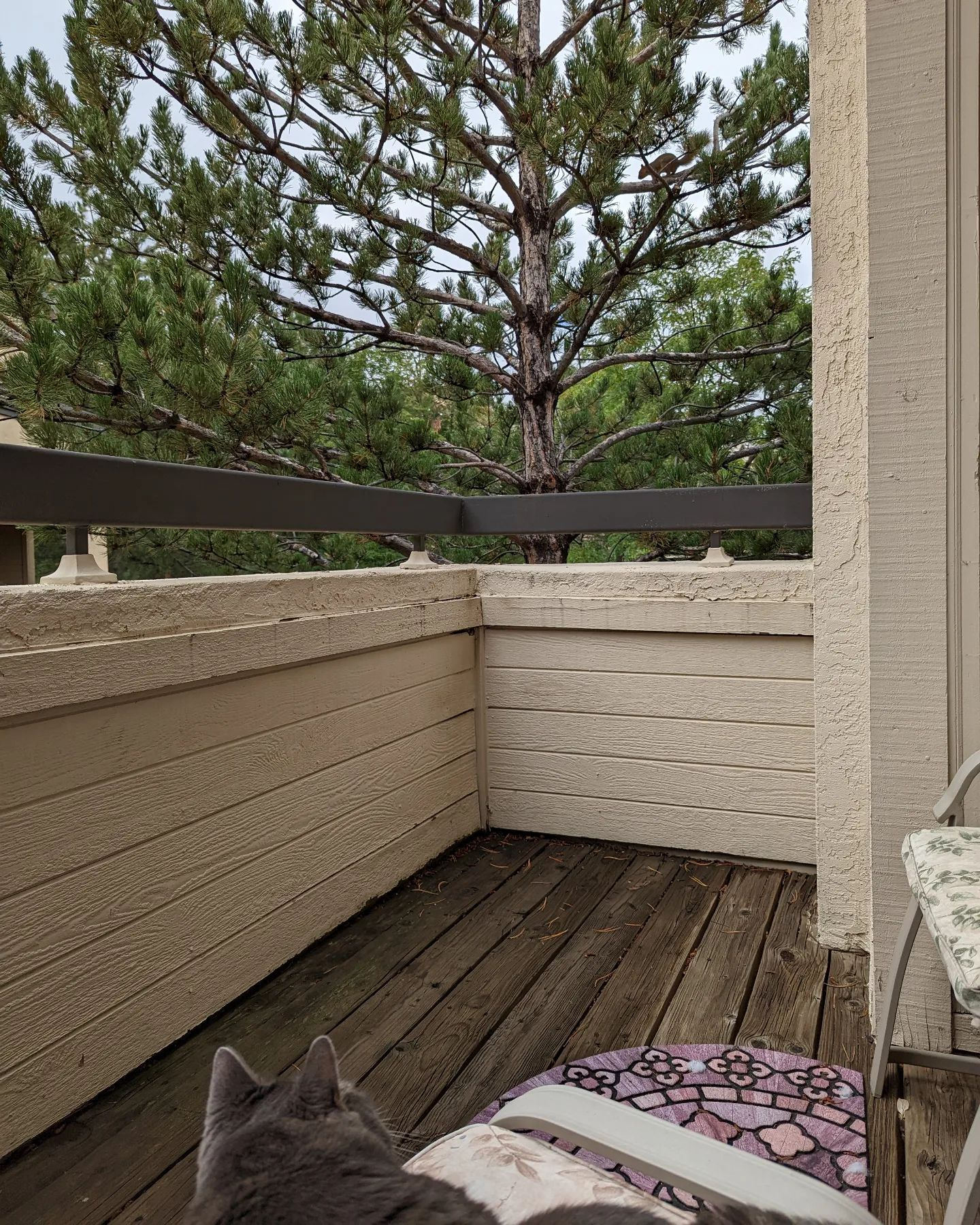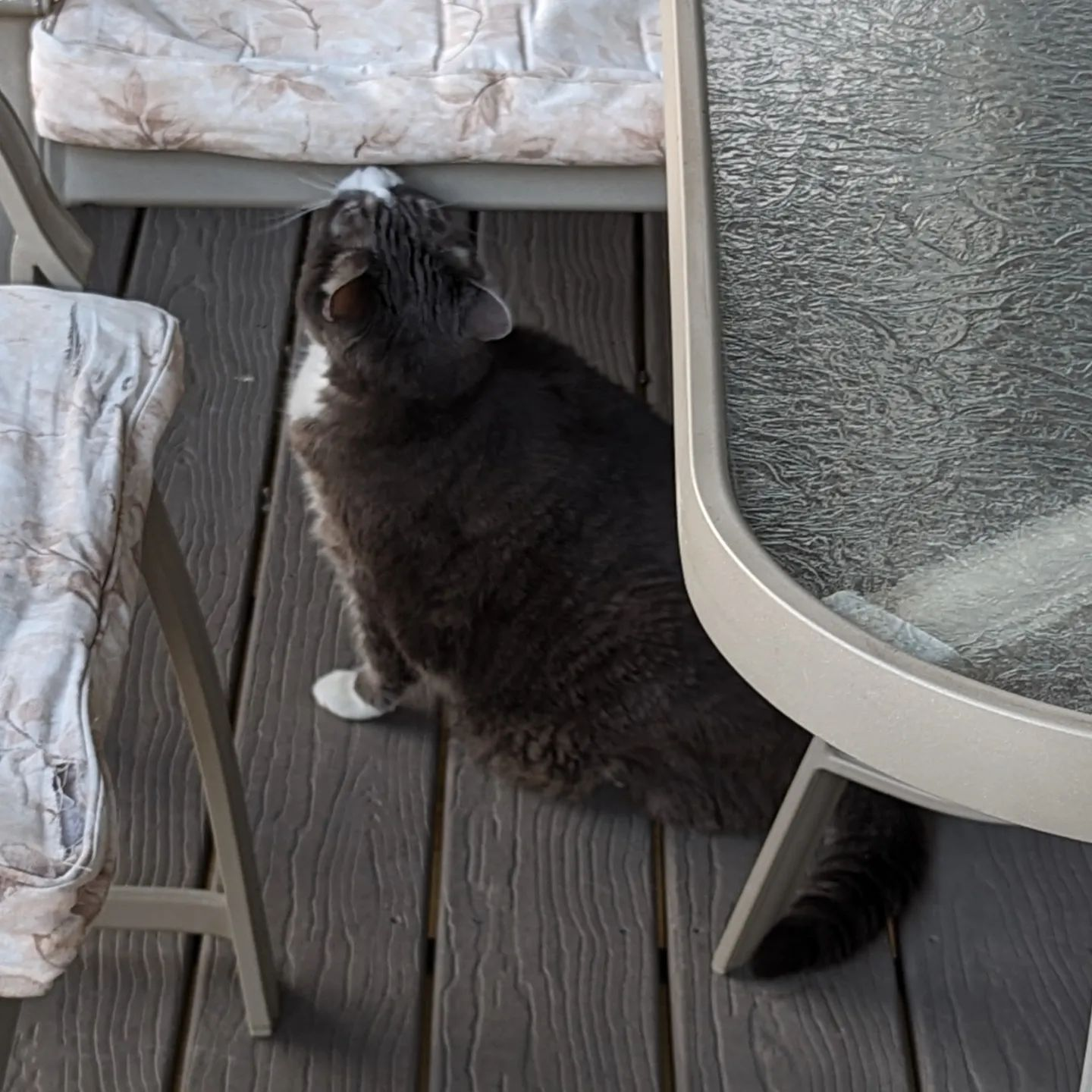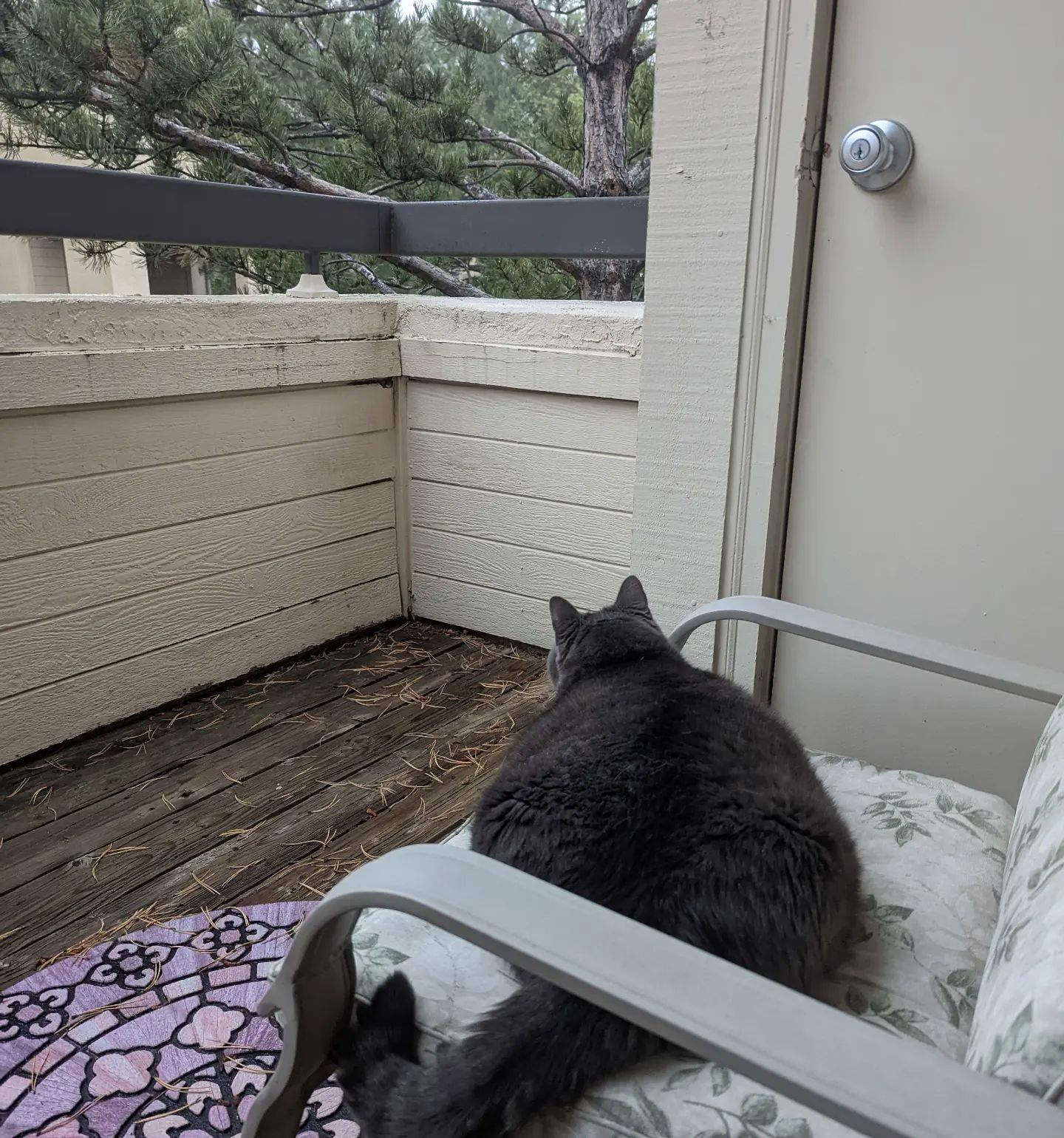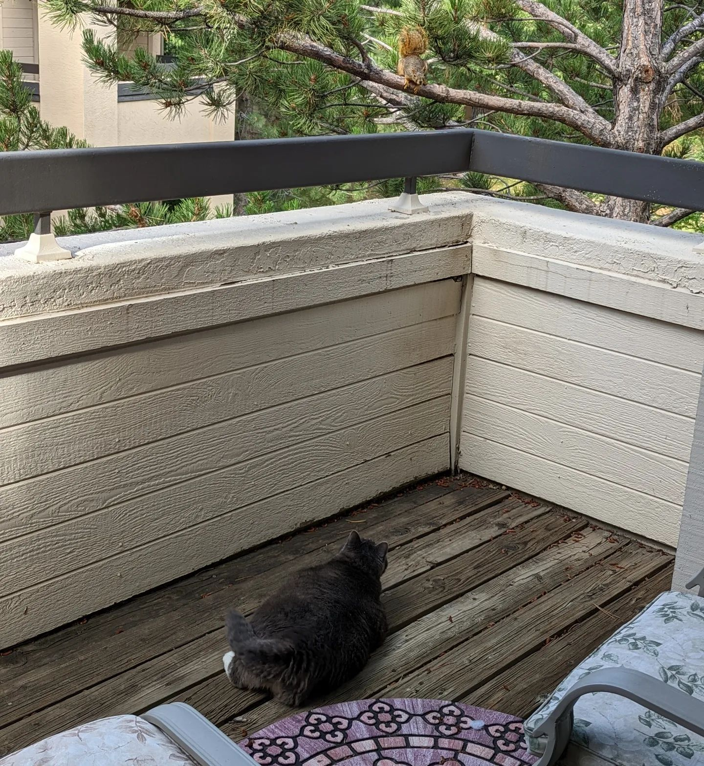 Looks like this is the guard post for the day. I messed up and hopefully we didn't wake up too many neighbors. I let Ziggy out without seeing the shy kitten was under one of the chairs in the back yard. Hissing and yeowls ensued. The kitten quickly realized that 3 feet up in a tree was sufficient to get away from Ziggy. Being reminded that she's an old lady by him sitting there looking down on her didn't make things better. But no one got hurt and the kitten was back at the front door within minutes. All part of the getting to know you process, I suppose. ?????? She's been in this spot for half an hour now.