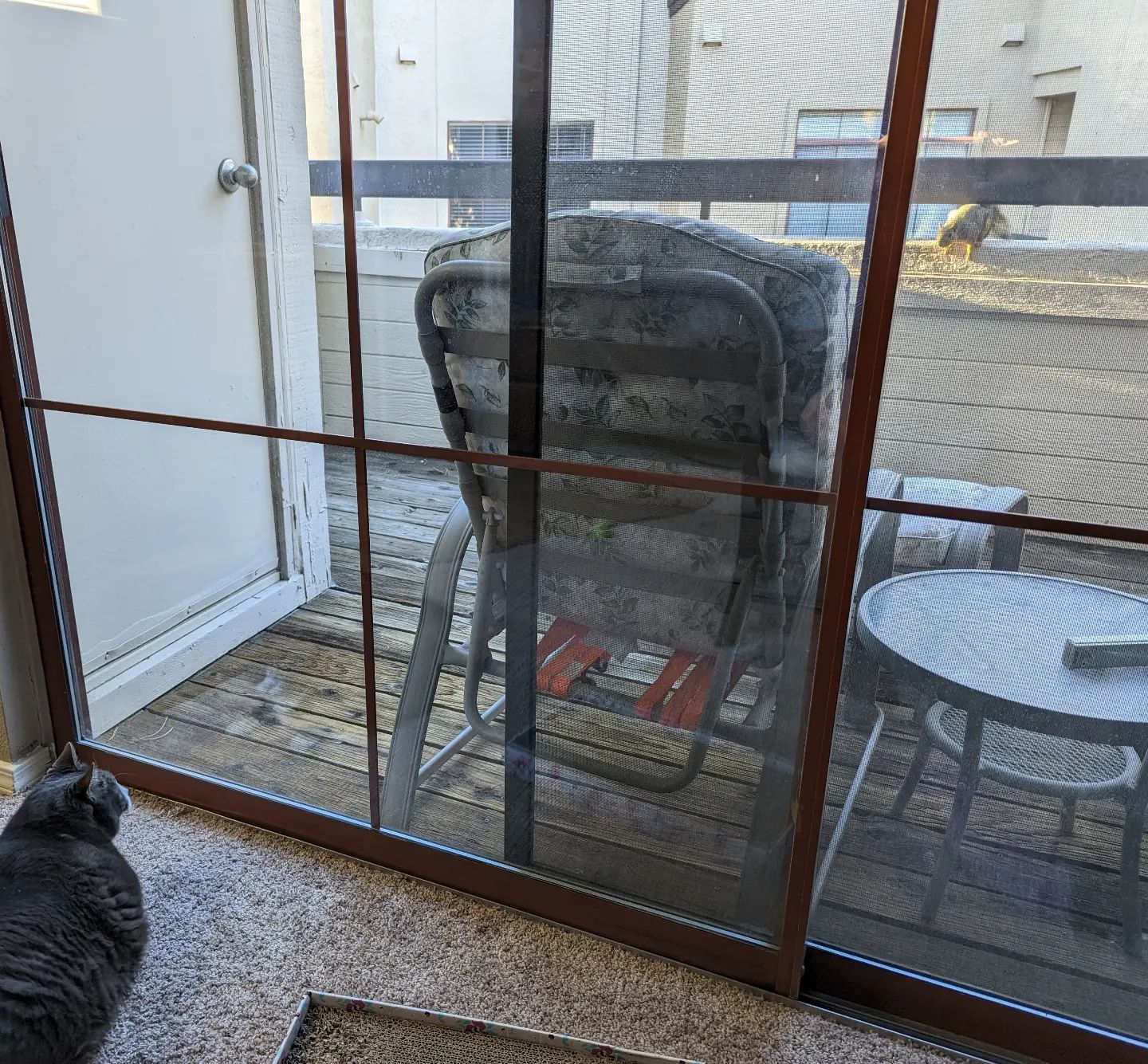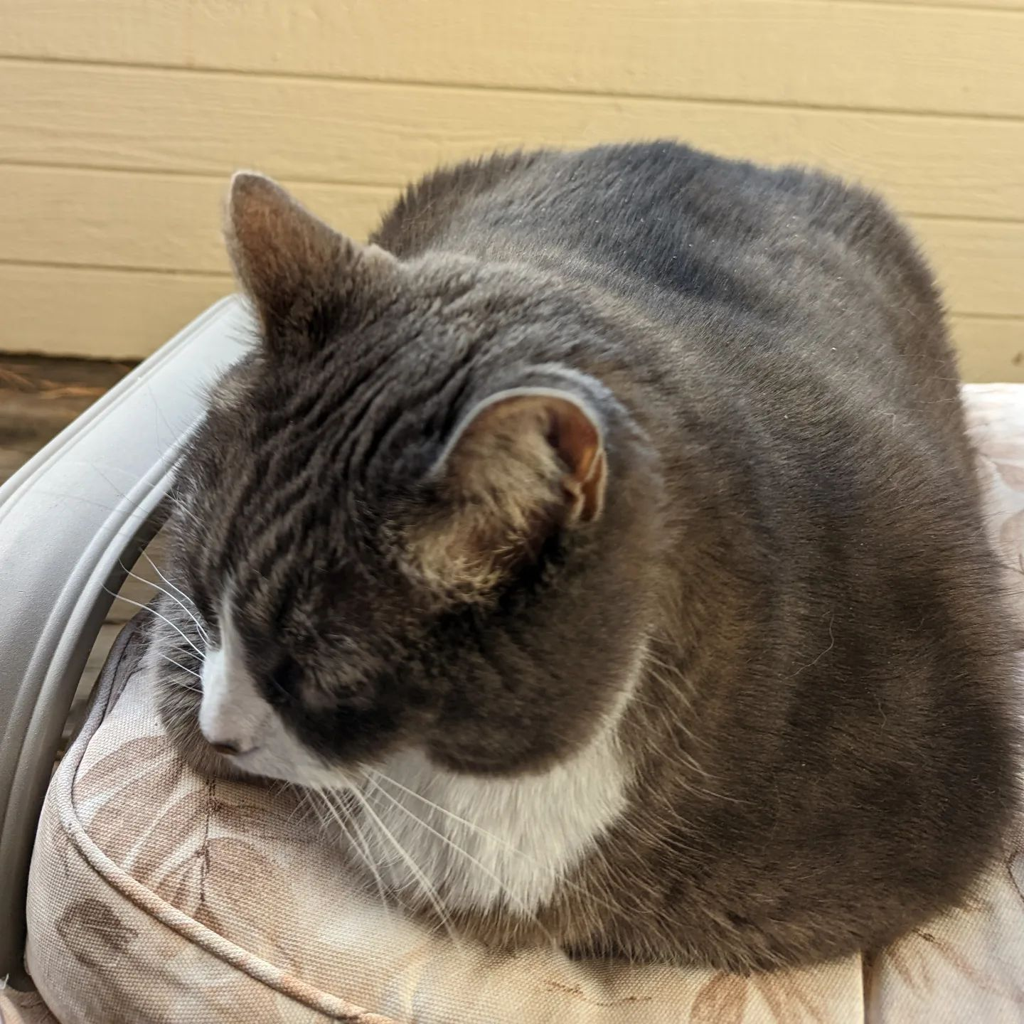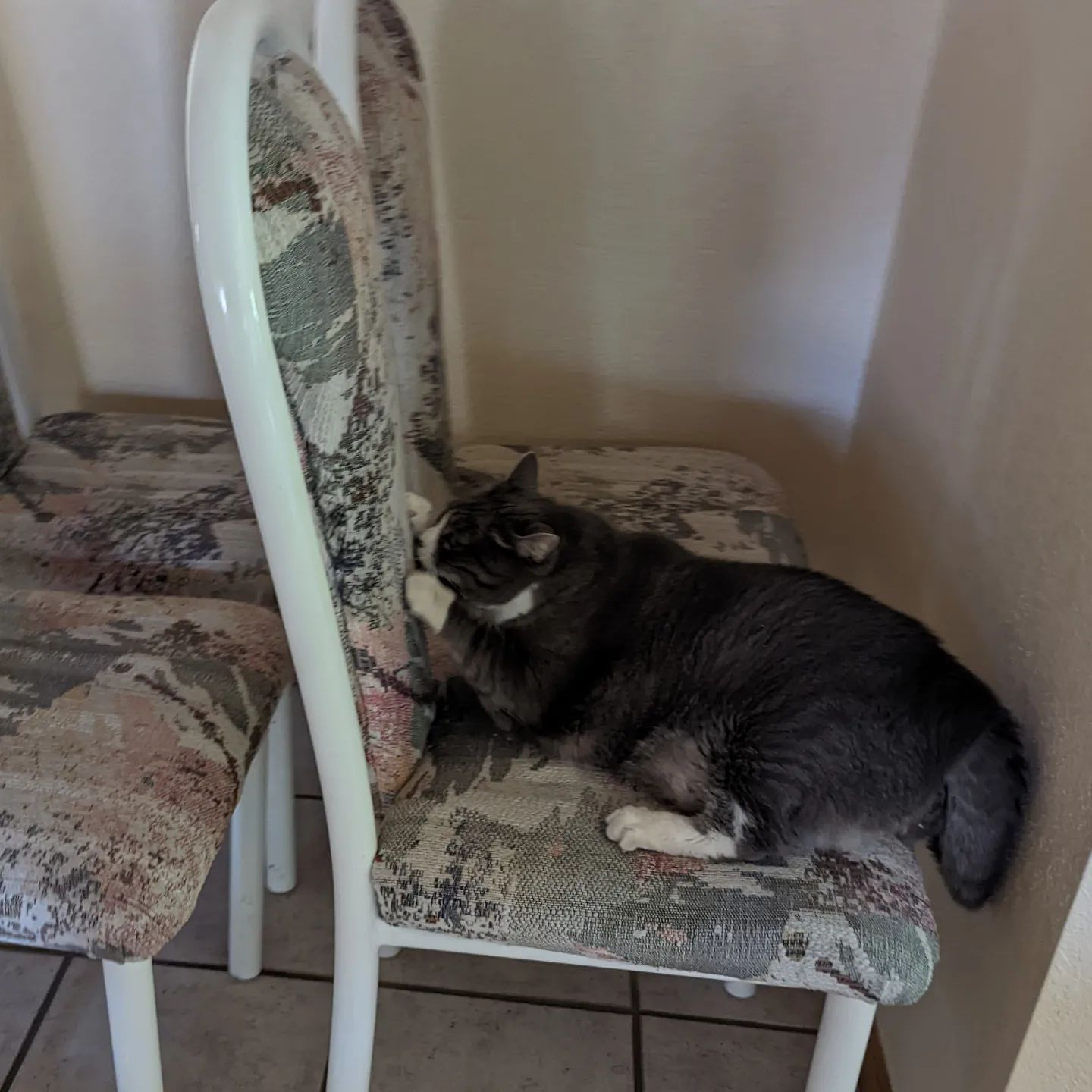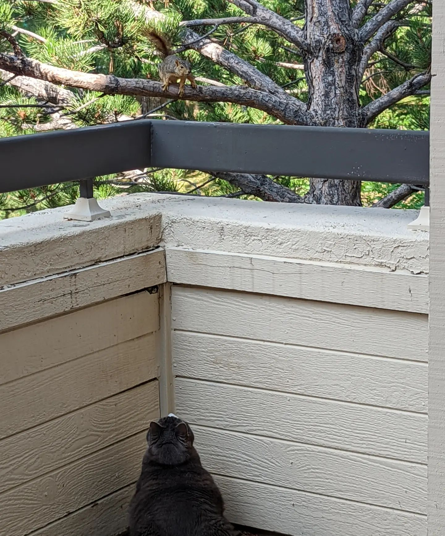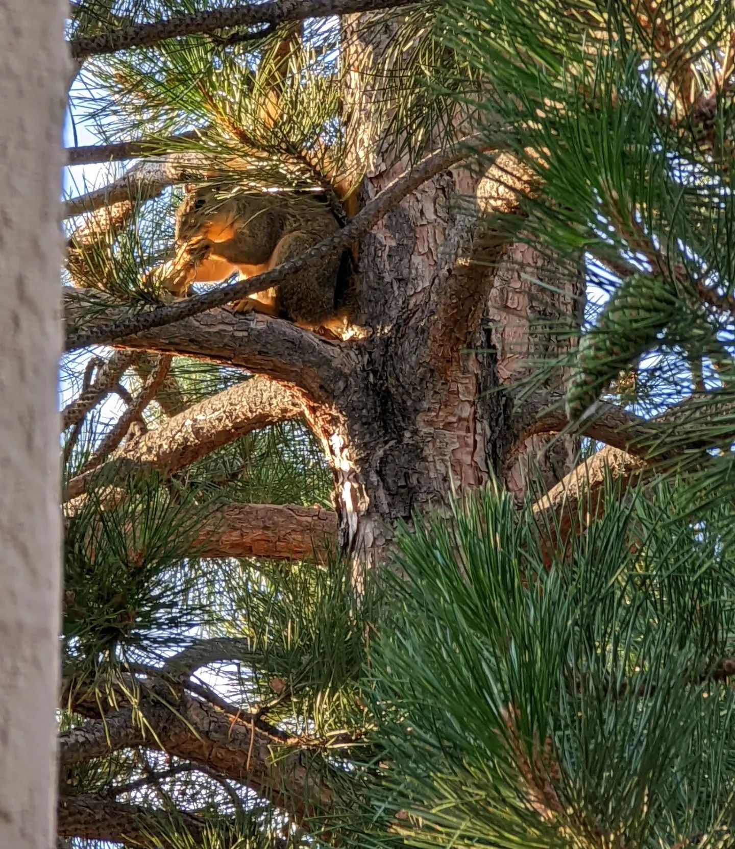 Looks like this is the guard post for the day. I messed up and hopefully we didn't wake up too many neighbors. I let Ziggy out without seeing the shy kitten was under one of the chairs in the back yard. Hissing and yeowls ensued. The kitten quickly realized that 3 feet up in a tree was sufficient to get away from Ziggy. Being reminded that she's an old lady by him sitting there looking down on her didn't make things better. But no one got hurt and the kitten was back at the front door within minutes. All part of the getting to know you process, I suppose. ?????? She's been in this spot for half an hour now.