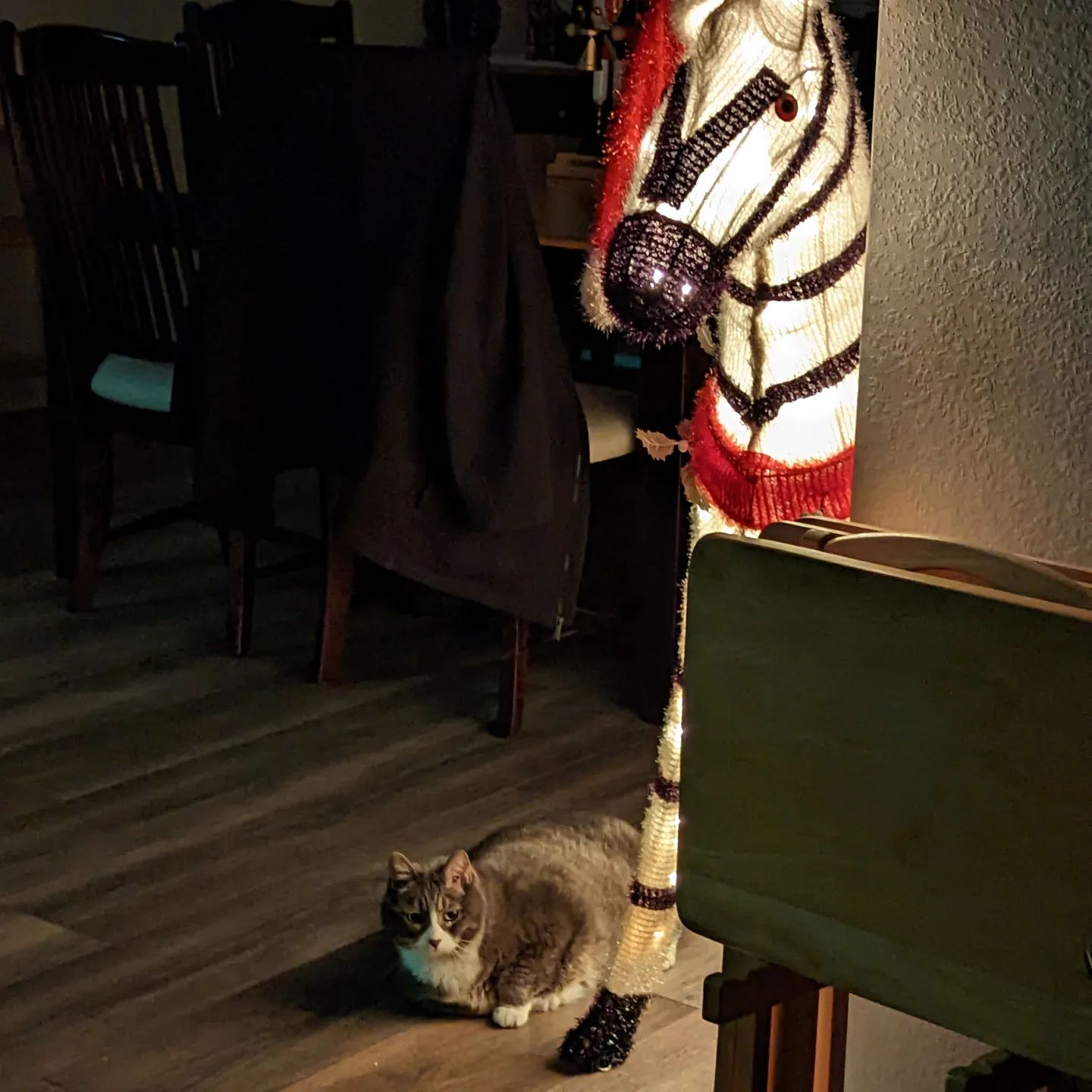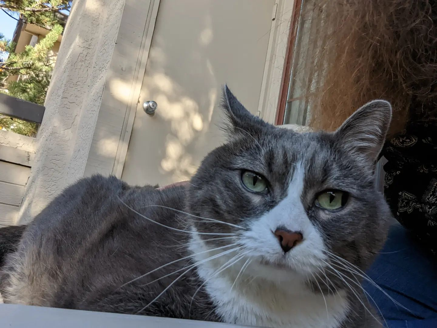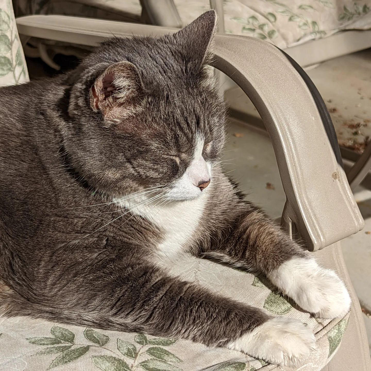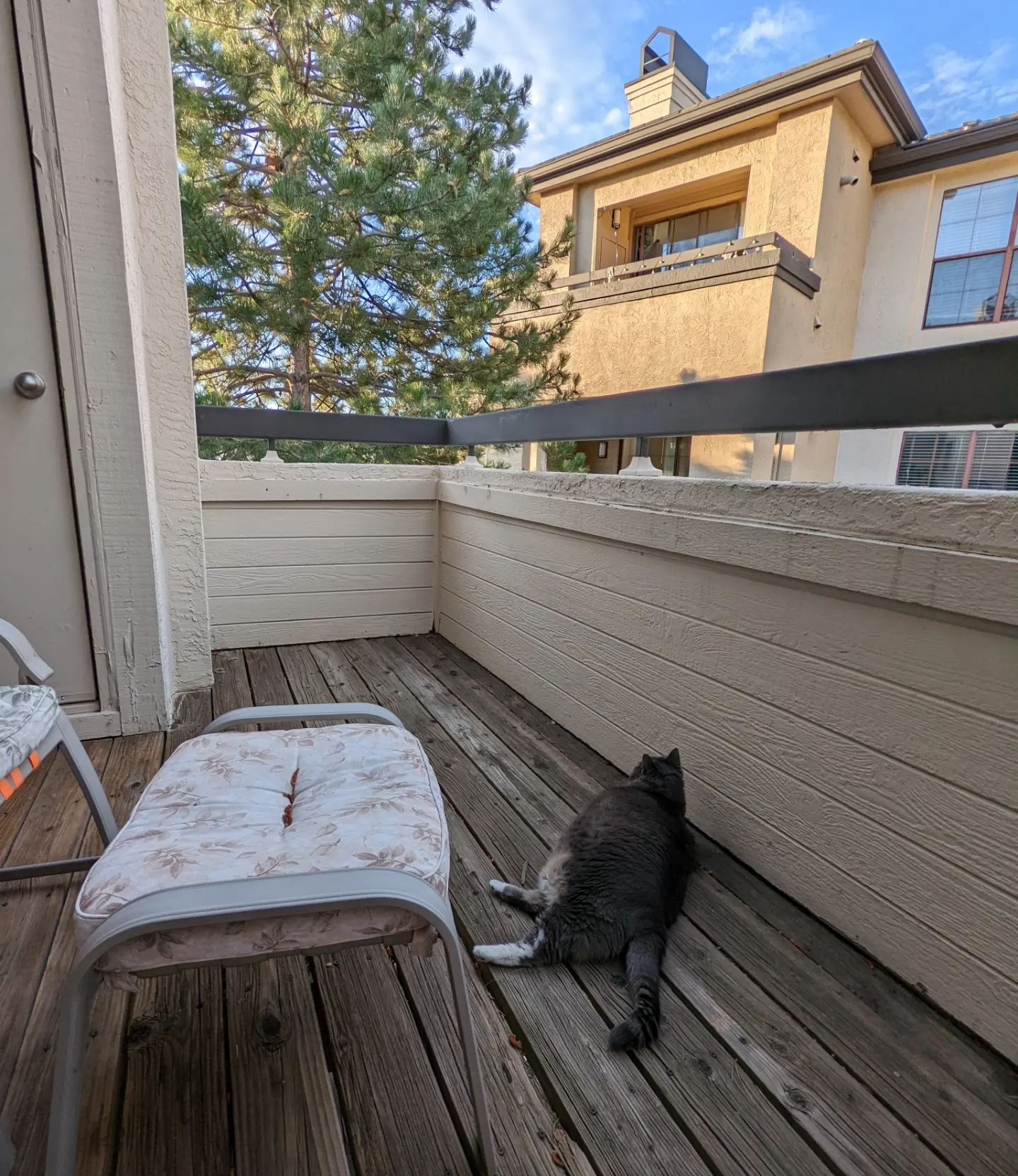 Looks like this is the guard post for the day. I messed up and hopefully we didn't wake up too many neighbors. I let Ziggy out without seeing the shy kitten was under one of the chairs in the back yard. Hissing and yeowls ensued. The kitten quickly realized that 3 feet up in a tree was sufficient to get away from Ziggy. Being reminded that she's an old lady by him sitting there looking down on her didn't make things better. But no one got hurt and the kitten was back at the front door within minutes. All part of the getting to know you process, I suppose. ?????? She's been in this spot for half an hour now.