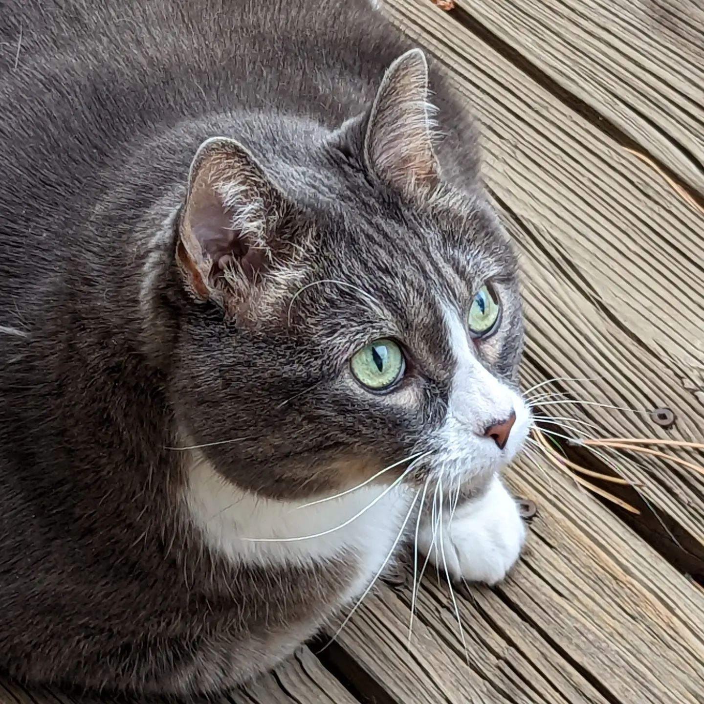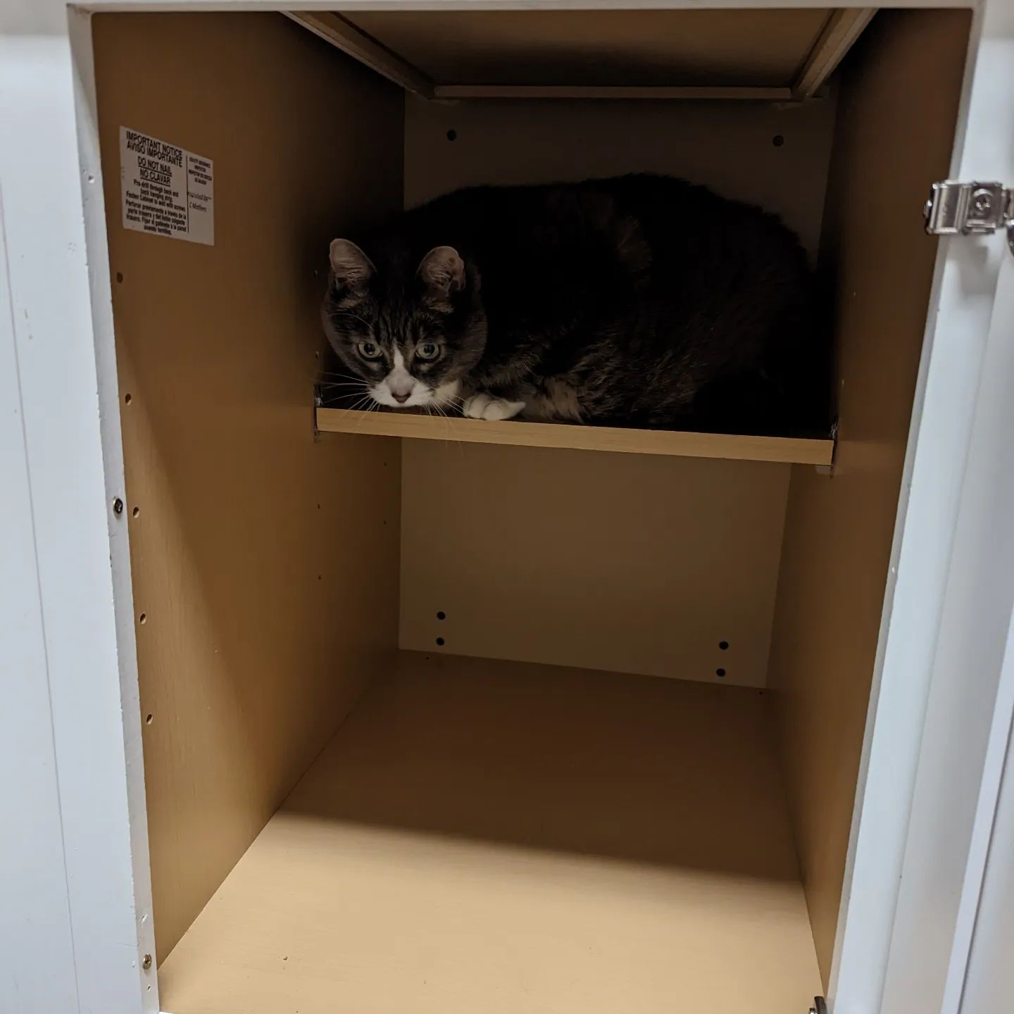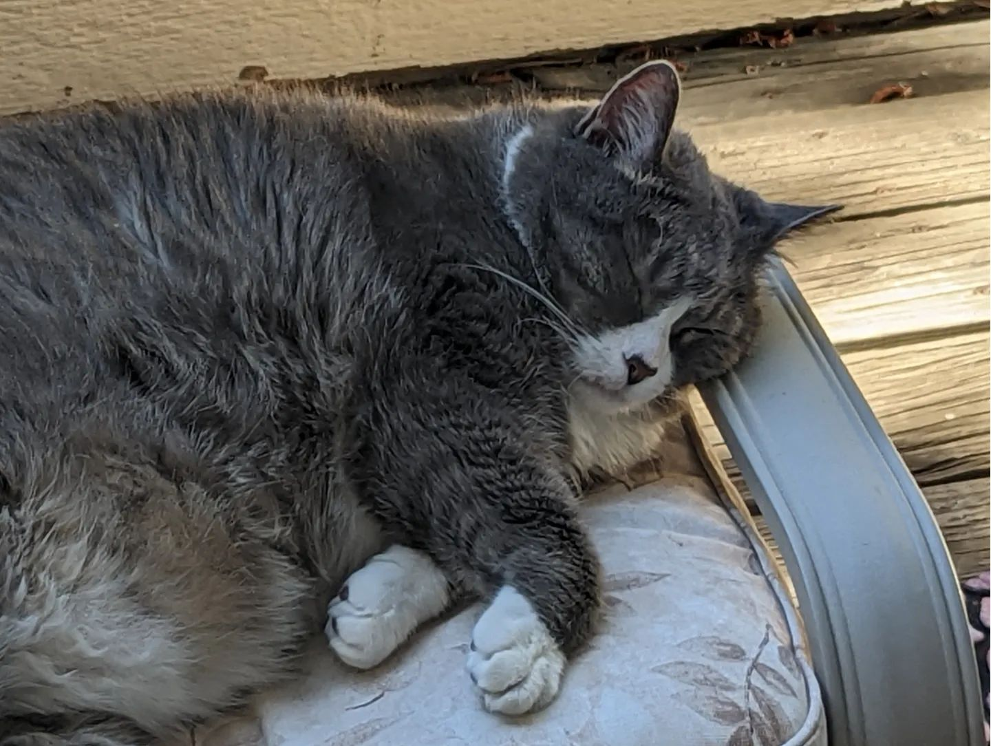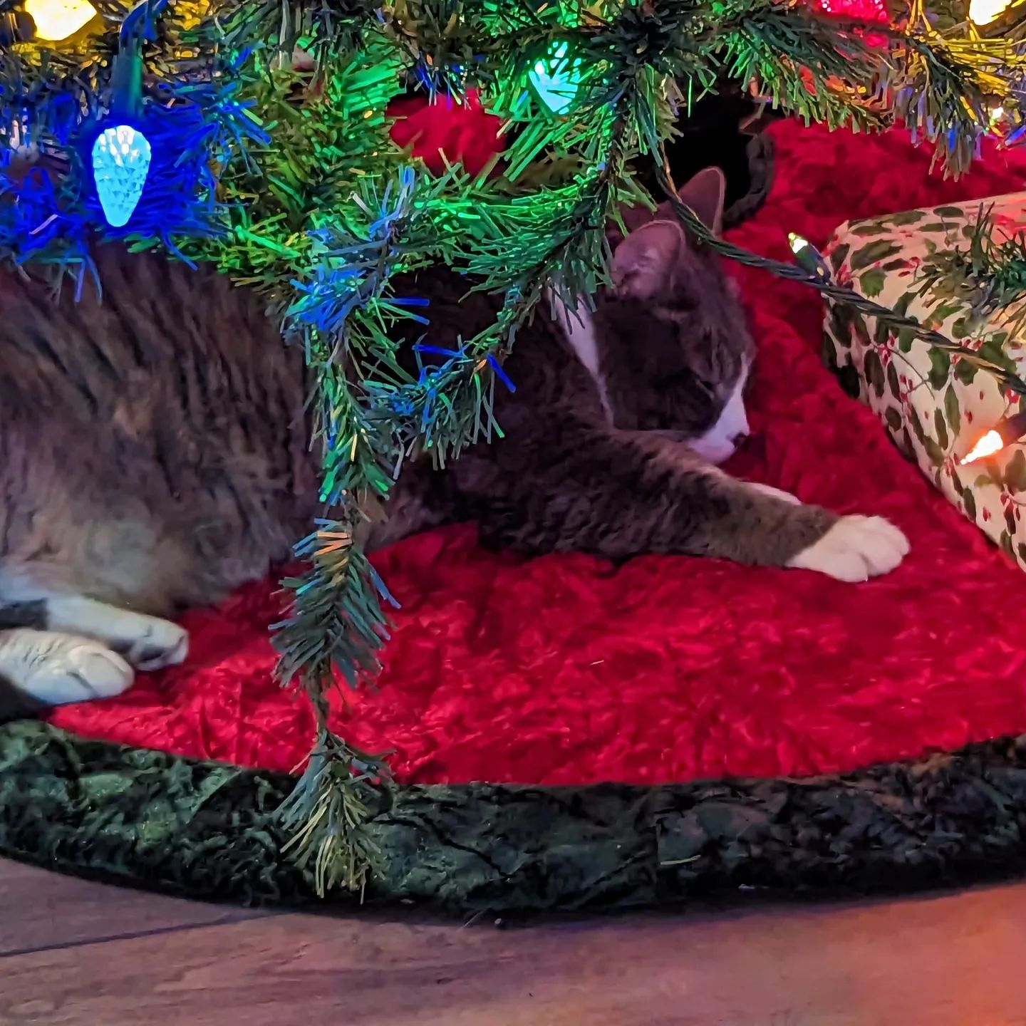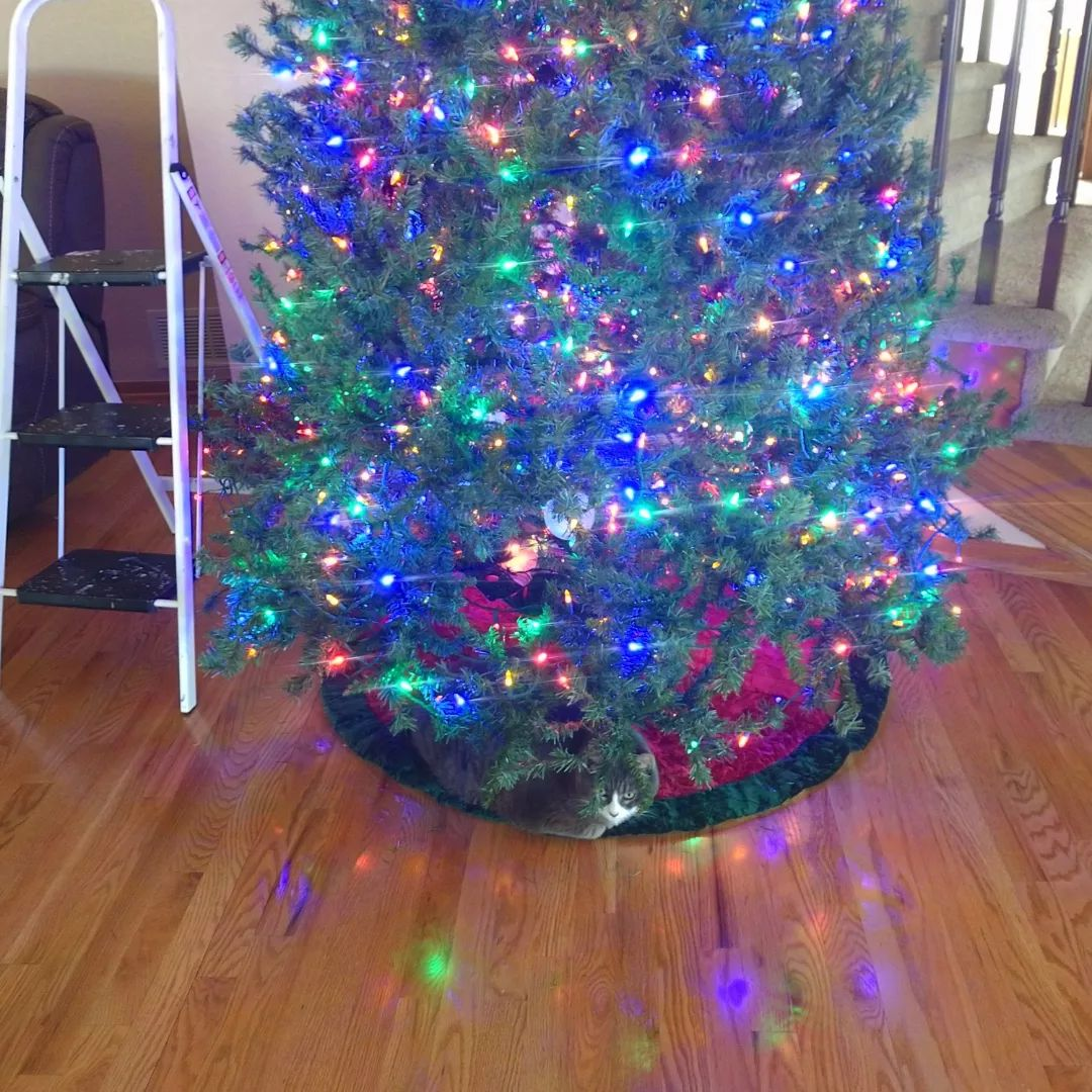 Looks like this is the guard post for the day. I messed up and hopefully we didn't wake up too many neighbors. I let Ziggy out without seeing the shy kitten was under one of the chairs in the back yard. Hissing and yeowls ensued. The kitten quickly realized that 3 feet up in a tree was sufficient to get away from Ziggy. Being reminded that she's an old lady by him sitting there looking down on her didn't make things better. But no one got hurt and the kitten was back at the front door within minutes. All part of the getting to know you process, I suppose. ?????? She's been in this spot for half an hour now.
