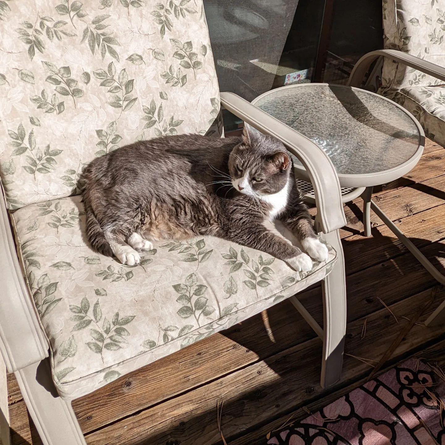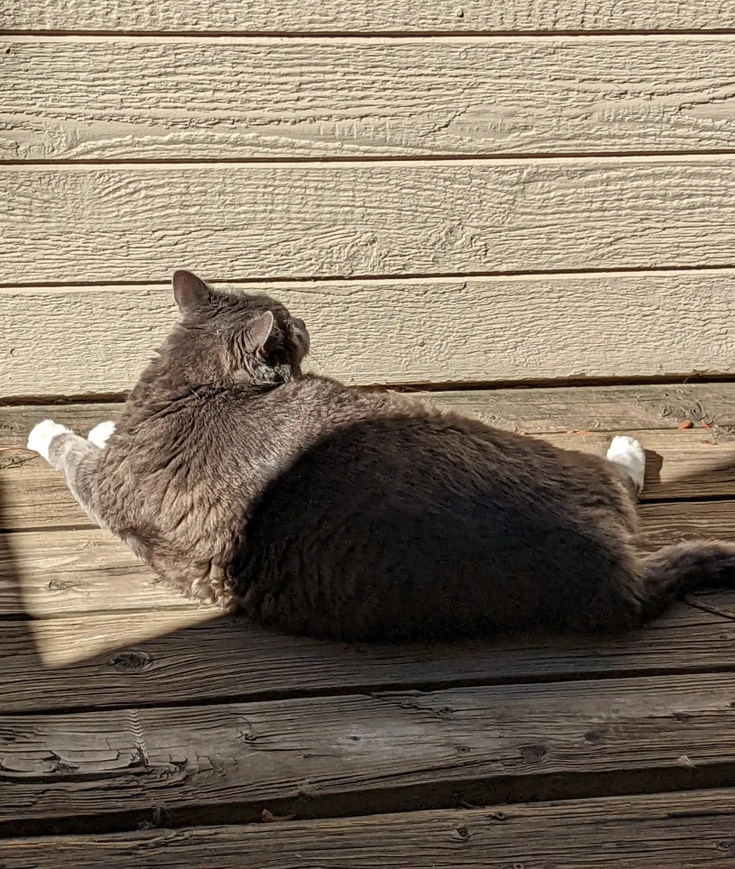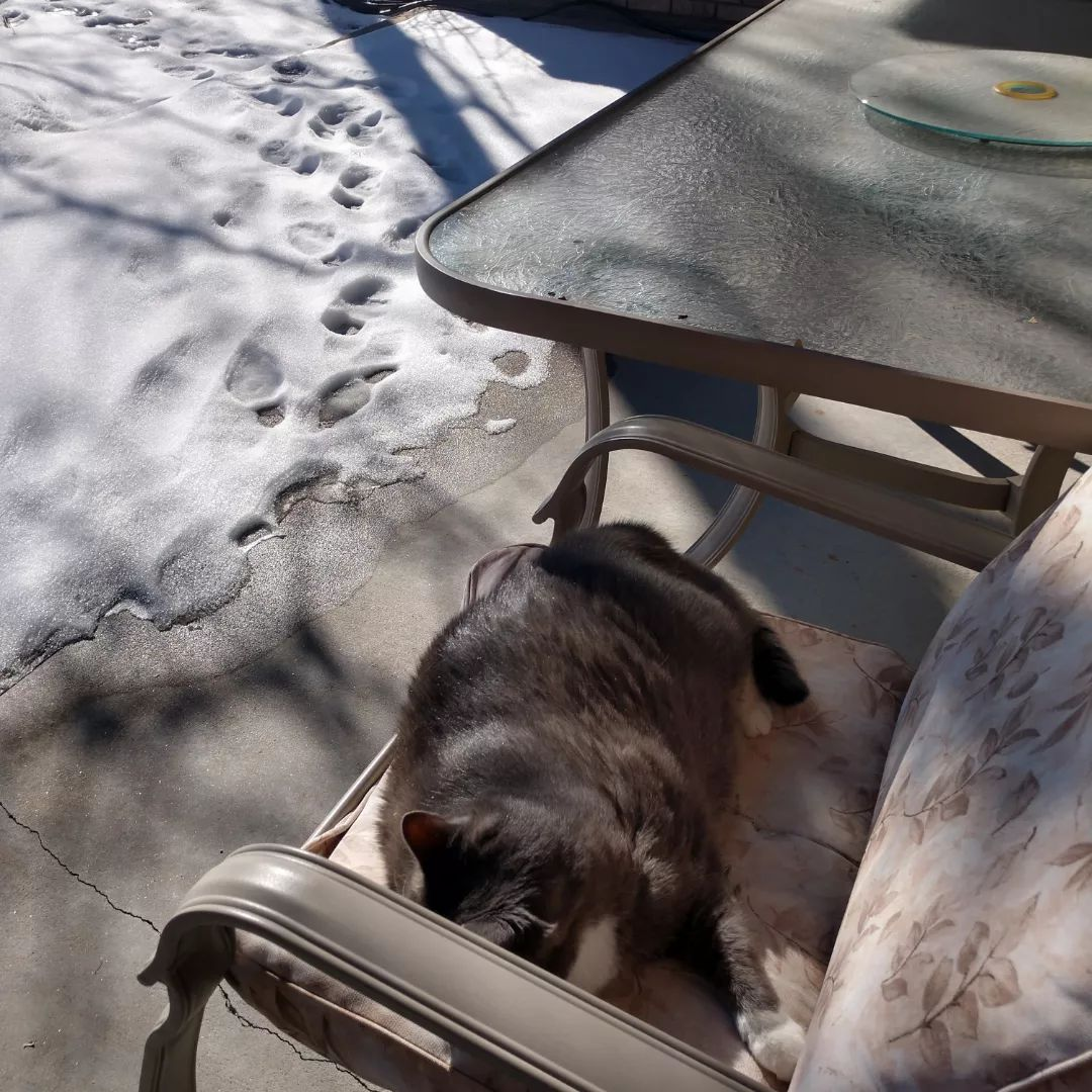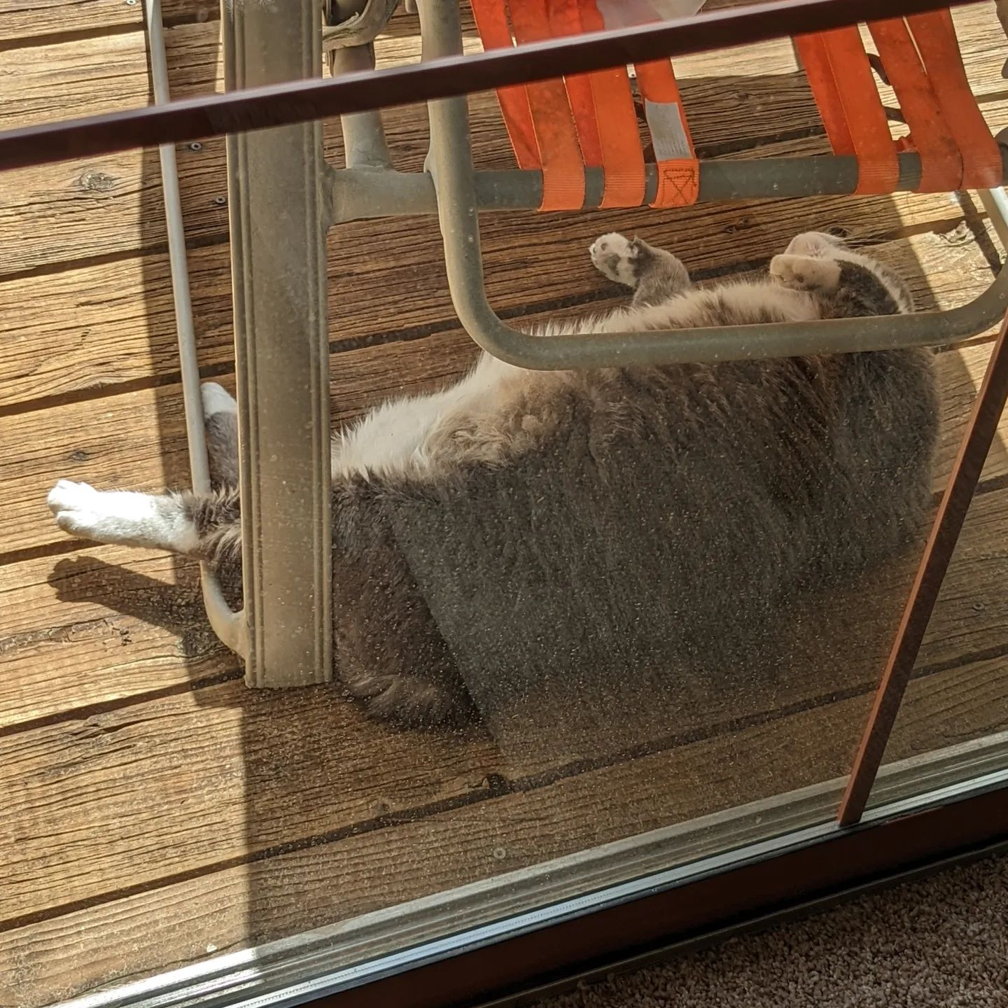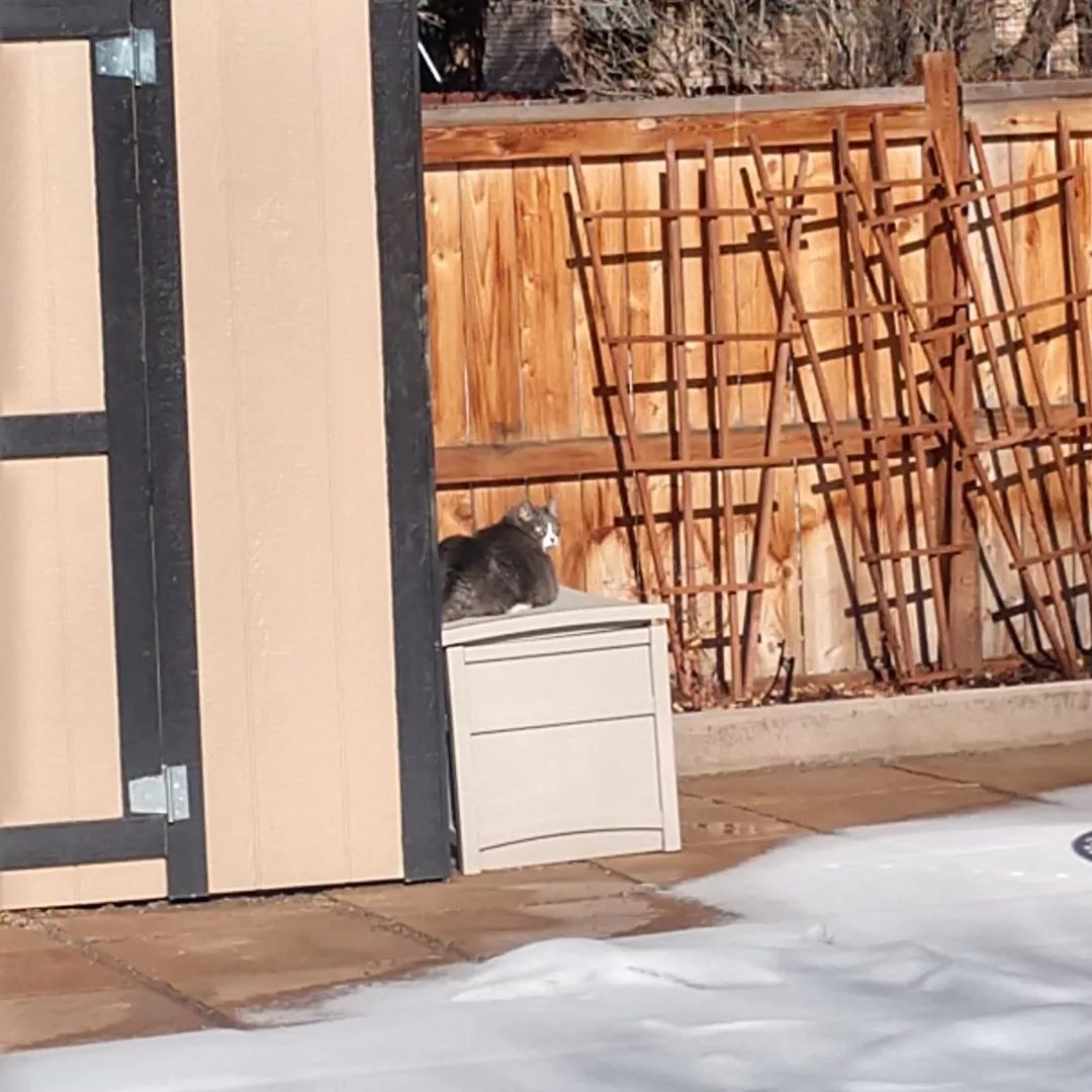 Loafing with a purpose. Ziggy is trying to toast on the woodbox, but it is only 38 deg outside (3.3 C)... but she will try to prove it's great and she doesn't need to come back inside. ????