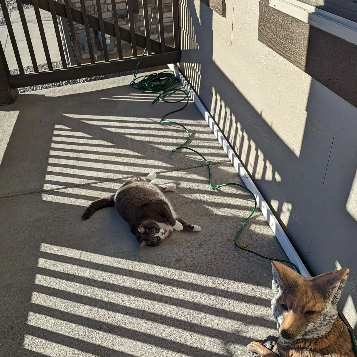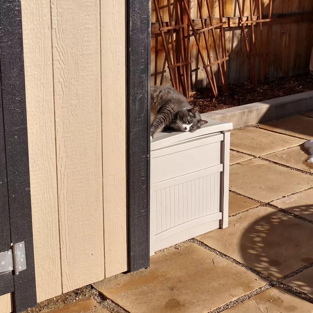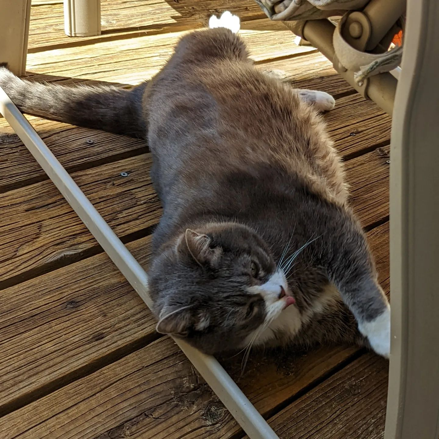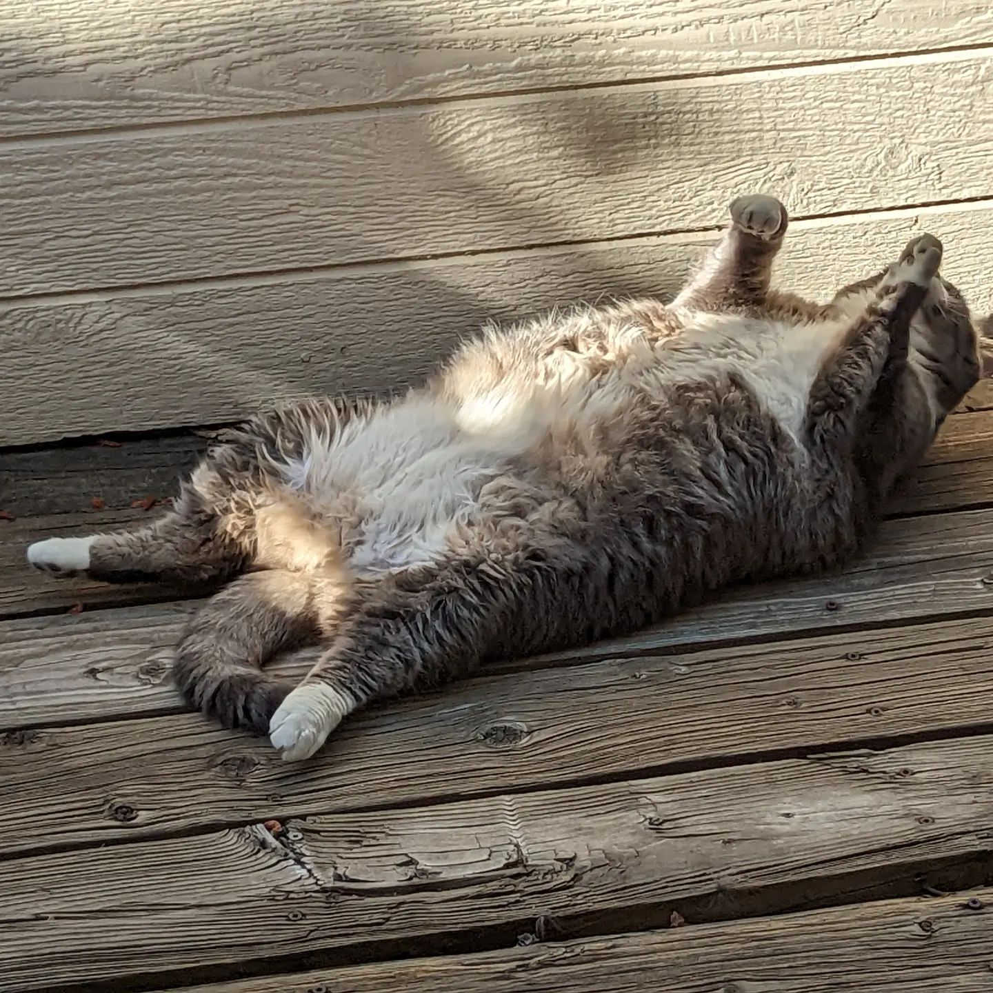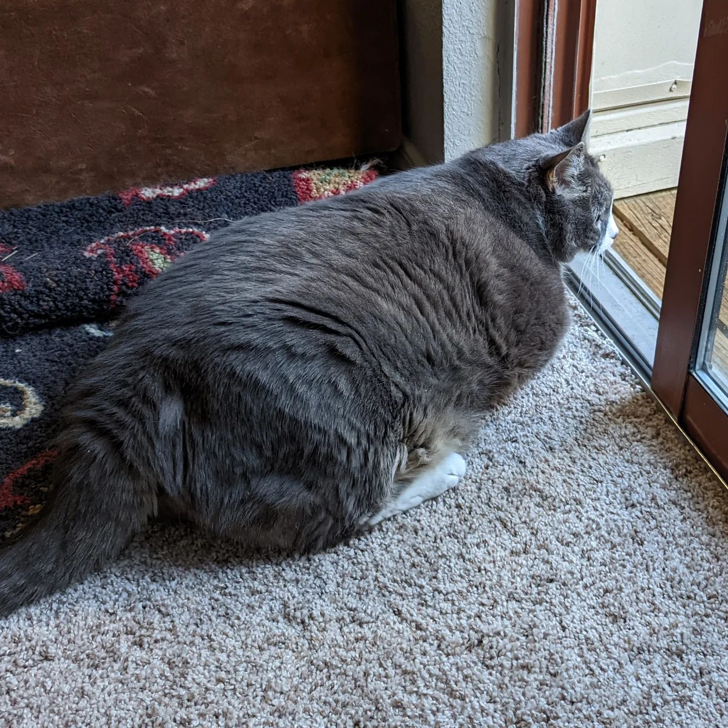 Loafing with a purpose. Ziggy is trying to toast on the woodbox, but it is only 38 deg outside (3.3 C)... but she will try to prove it's great and she doesn't need to come back inside. ????