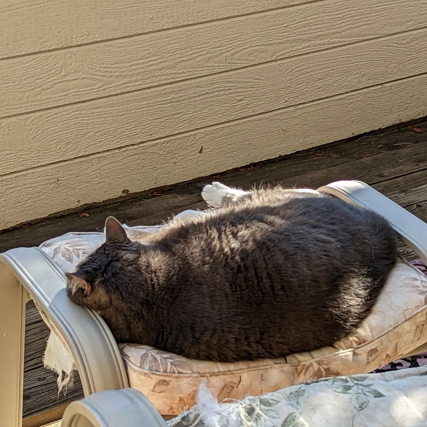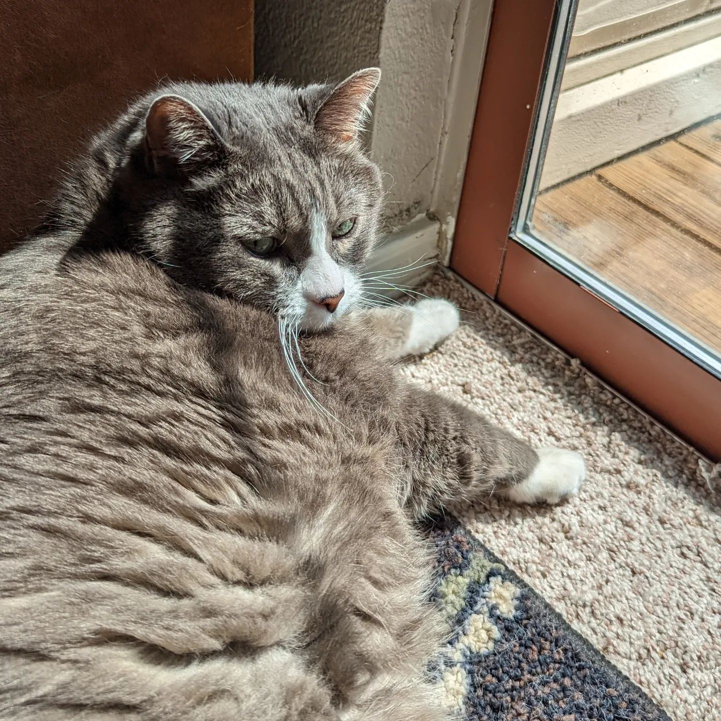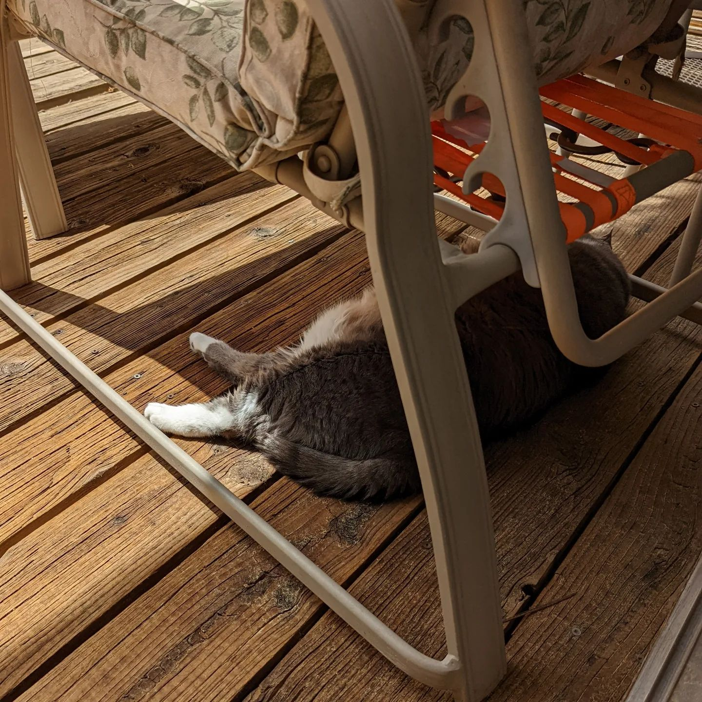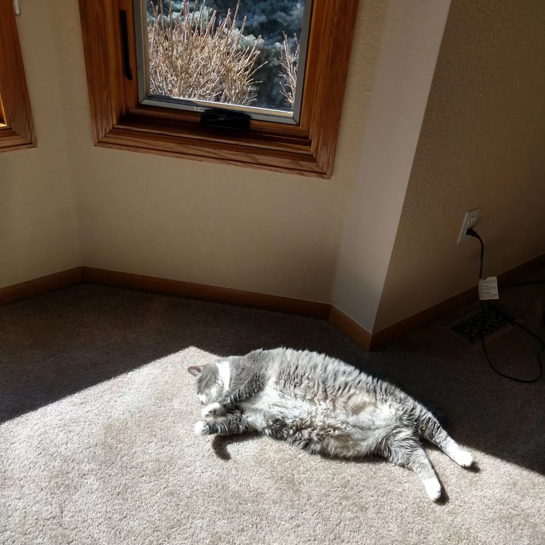 Loafing with a purpose. Ziggy is trying to toast on the woodbox, but it is only 38 deg outside (3.3 C)... but she will try to prove it's great and she doesn't need to come back inside. ????