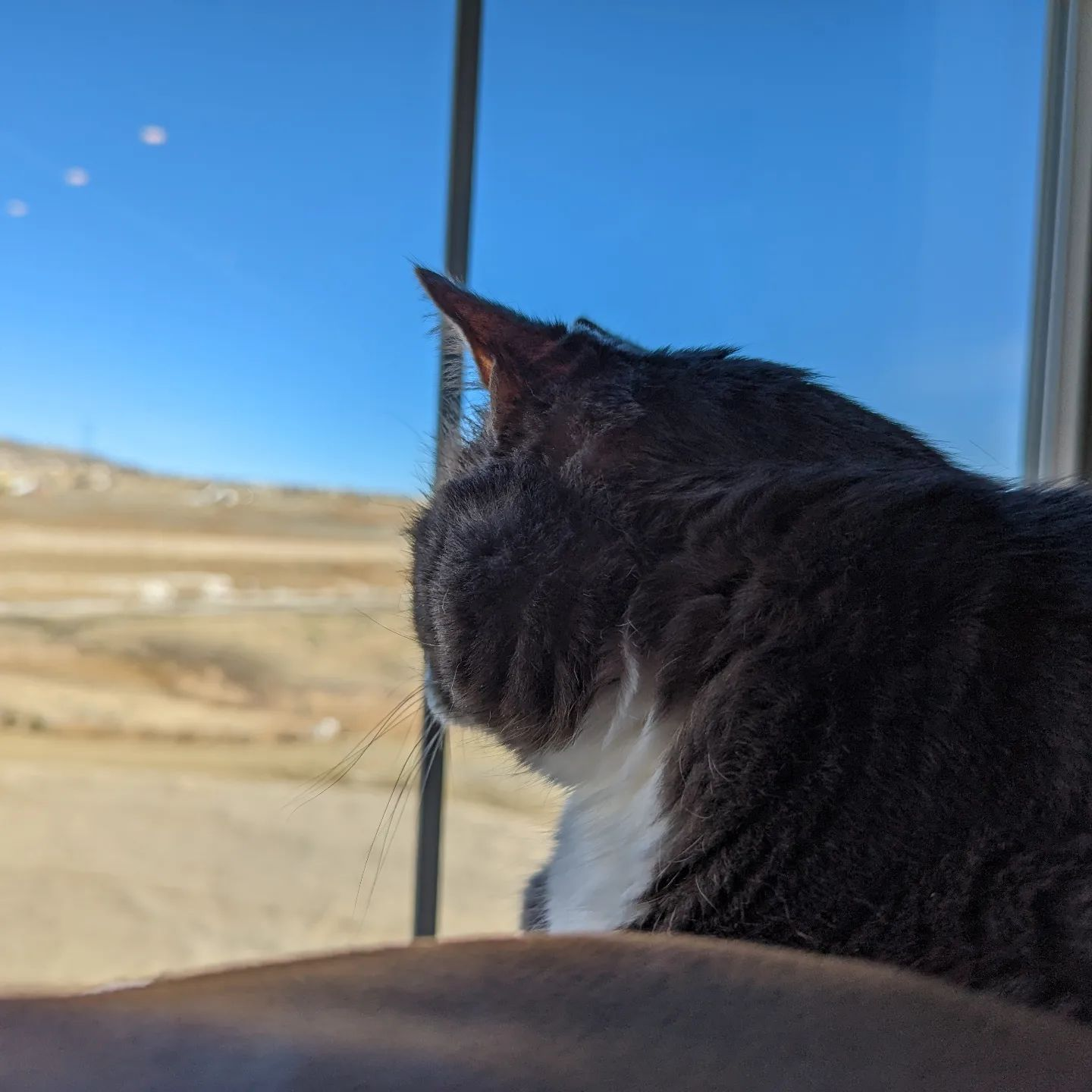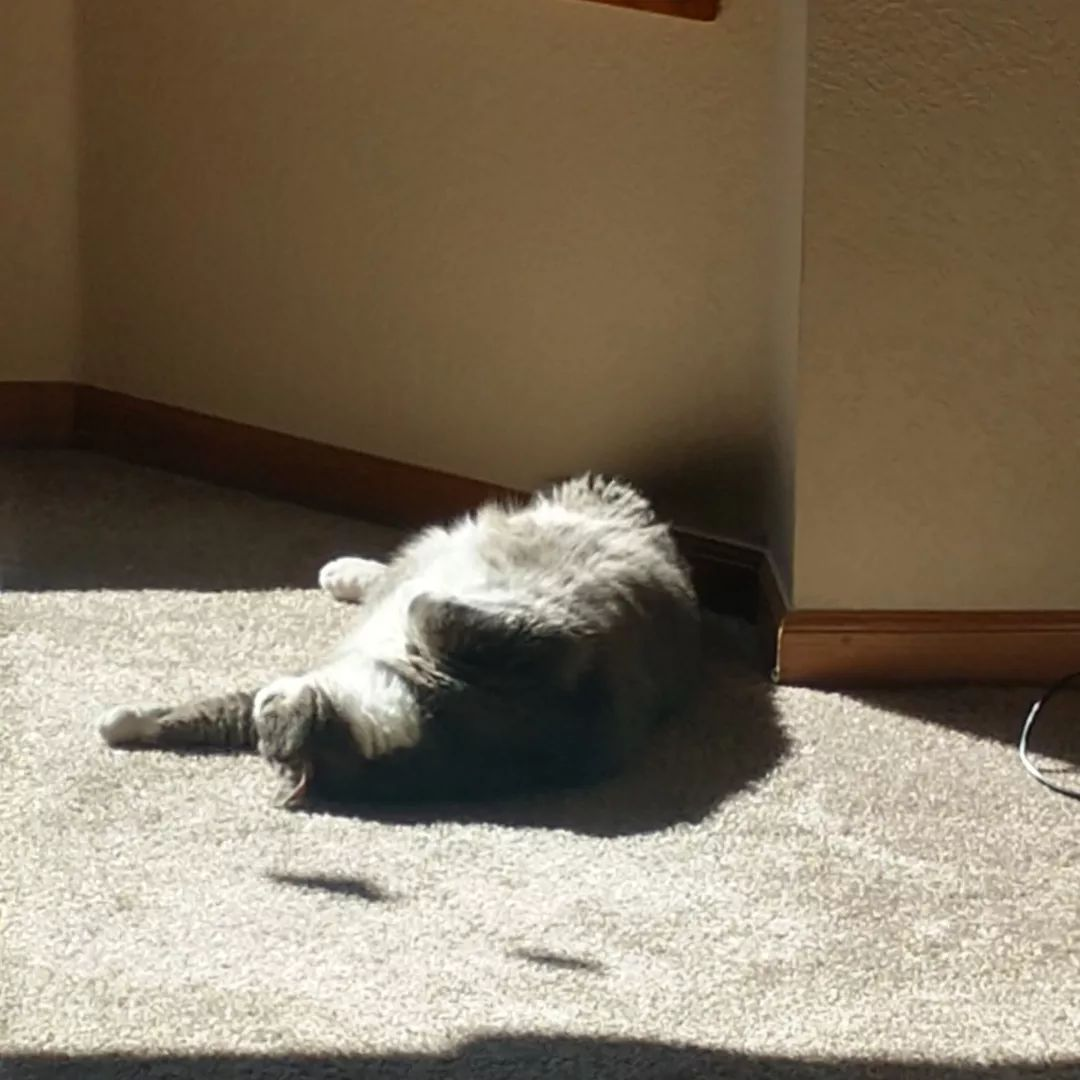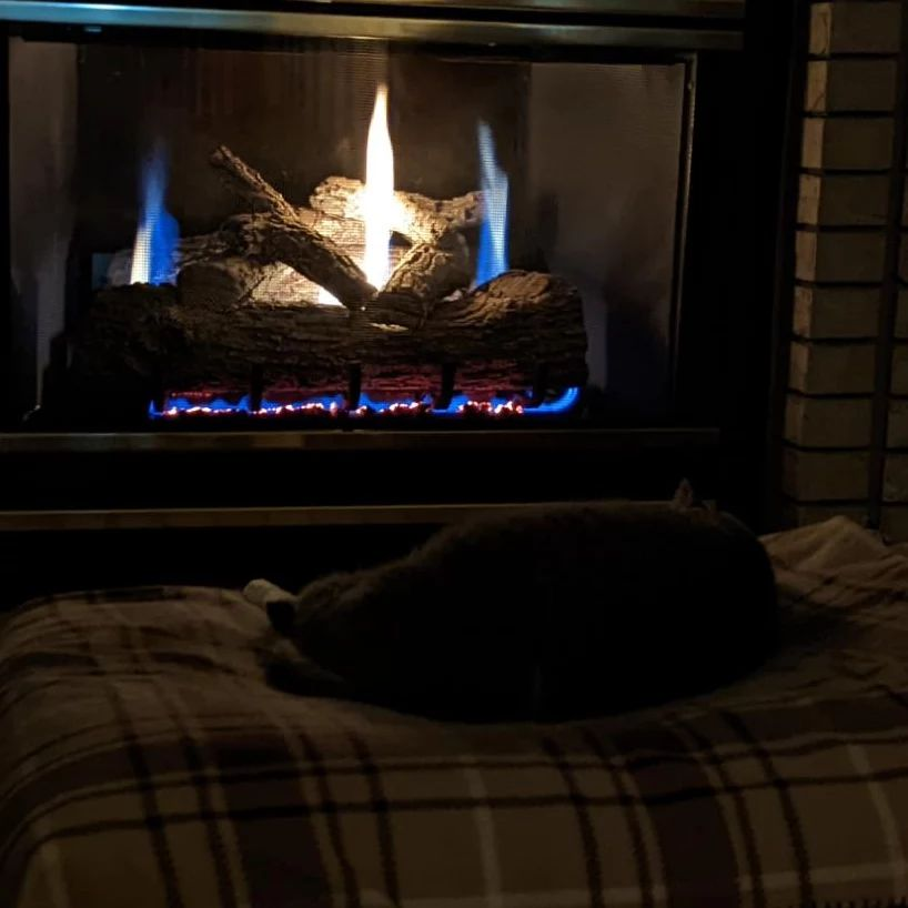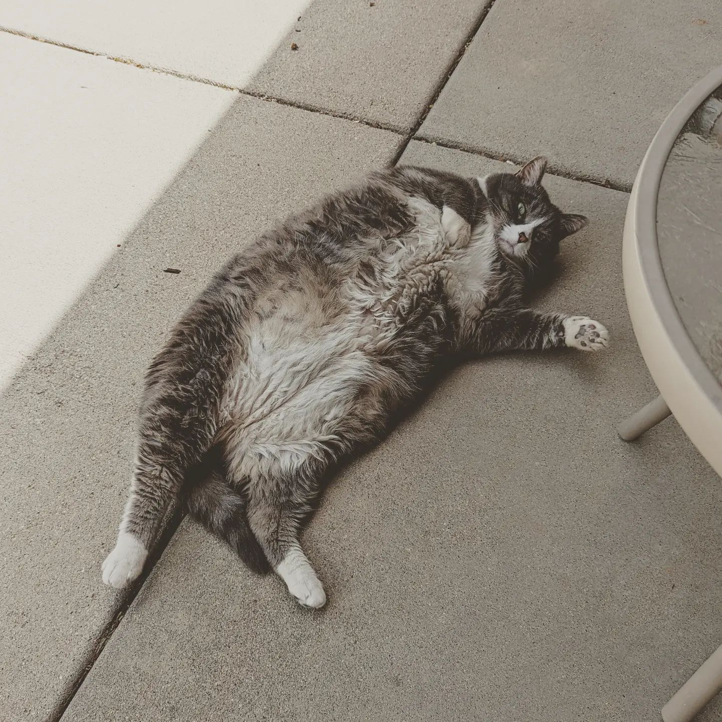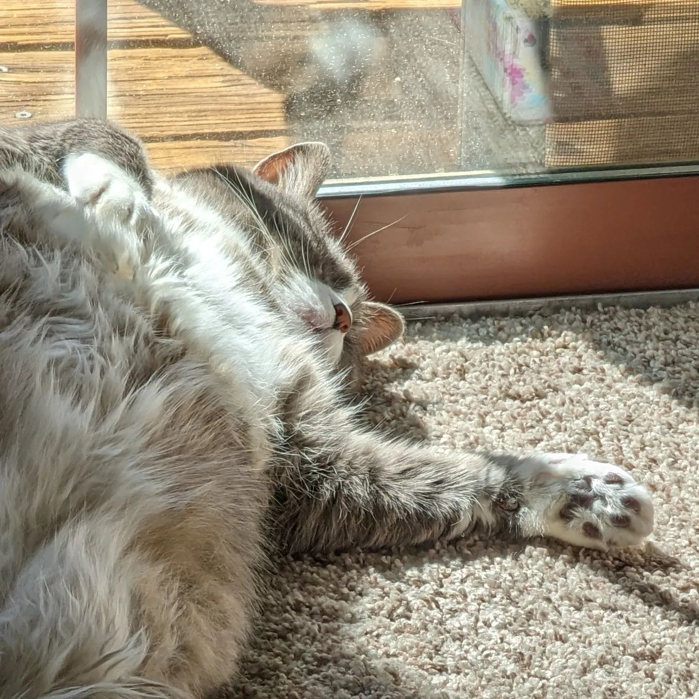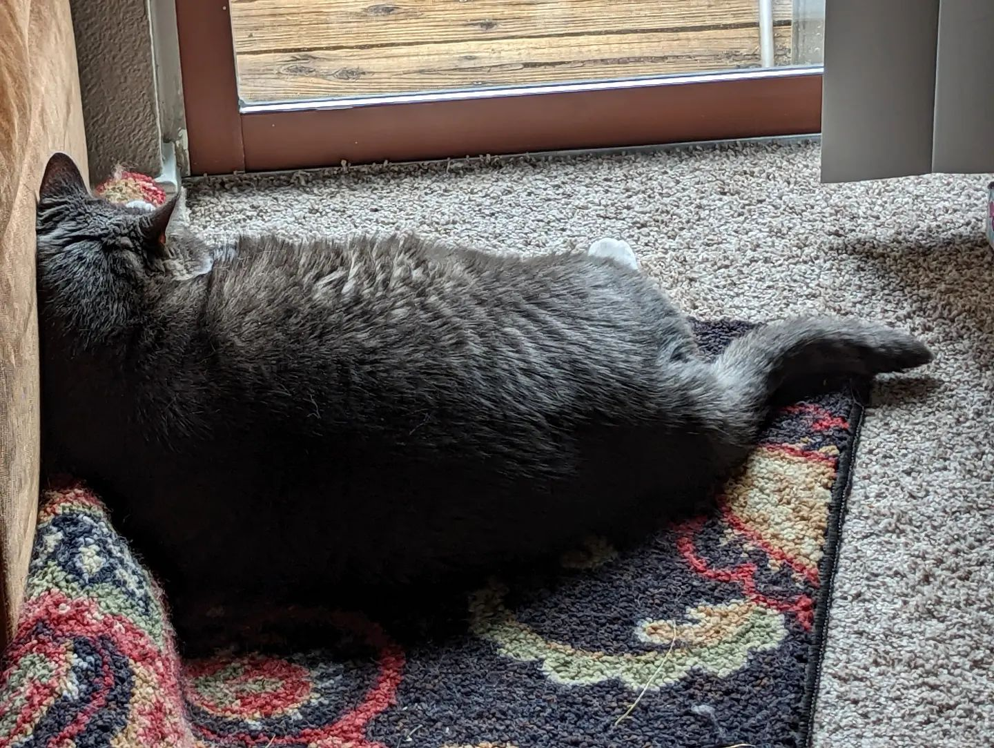 Loafing with a purpose. Ziggy is trying to toast on the woodbox, but it is only 38 deg outside (3.3 C)... but she will try to prove it's great and she doesn't need to come back inside. ????