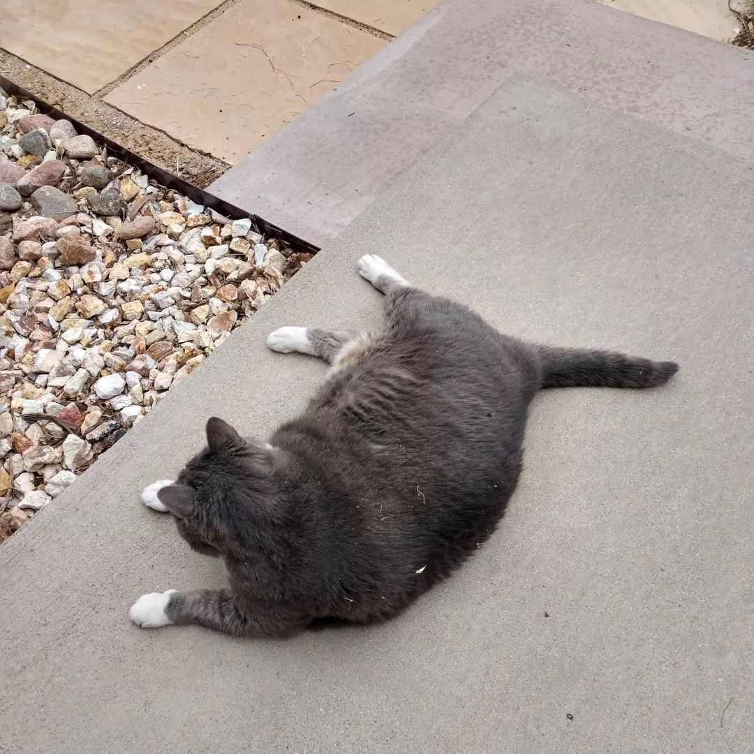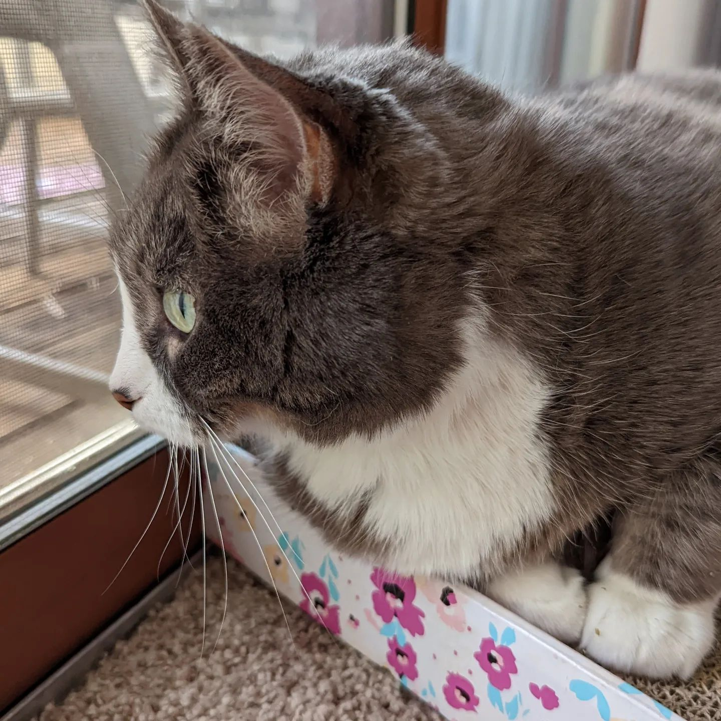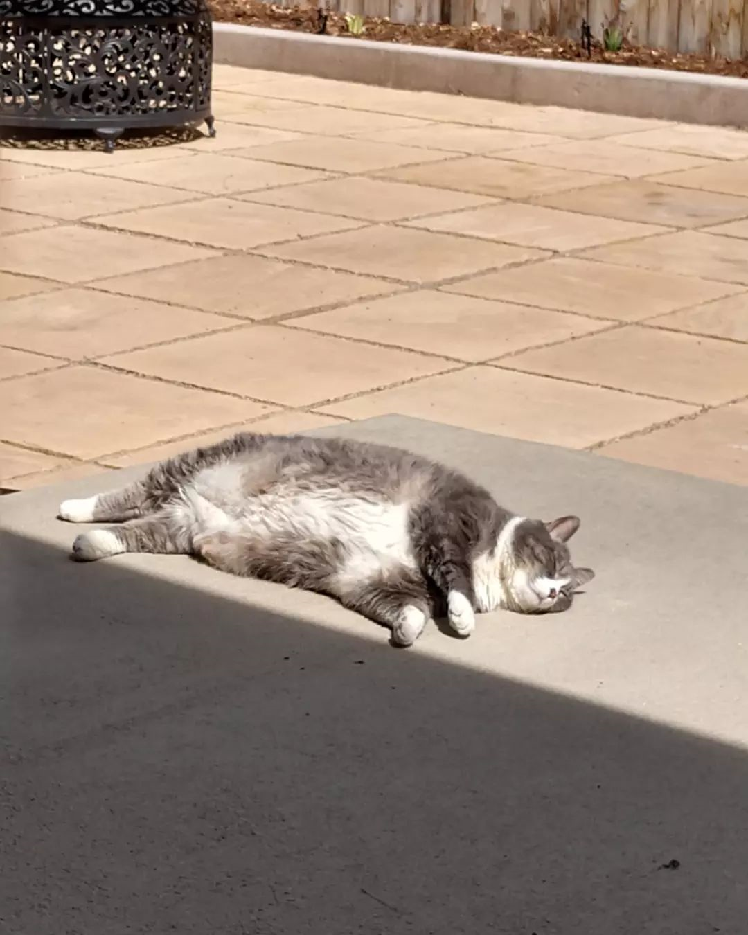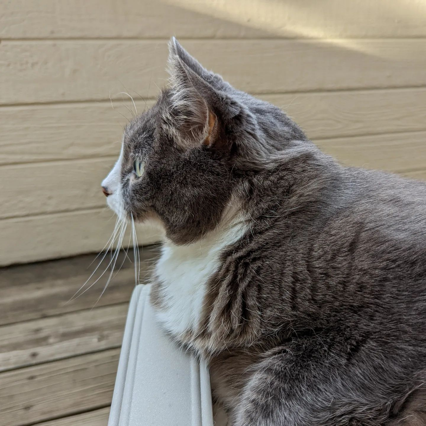 Loafing with a purpose. Ziggy is trying to toast on the woodbox, but it is only 38 deg outside (3.3 C)... but she will try to prove it's great and she doesn't need to come back inside. ????