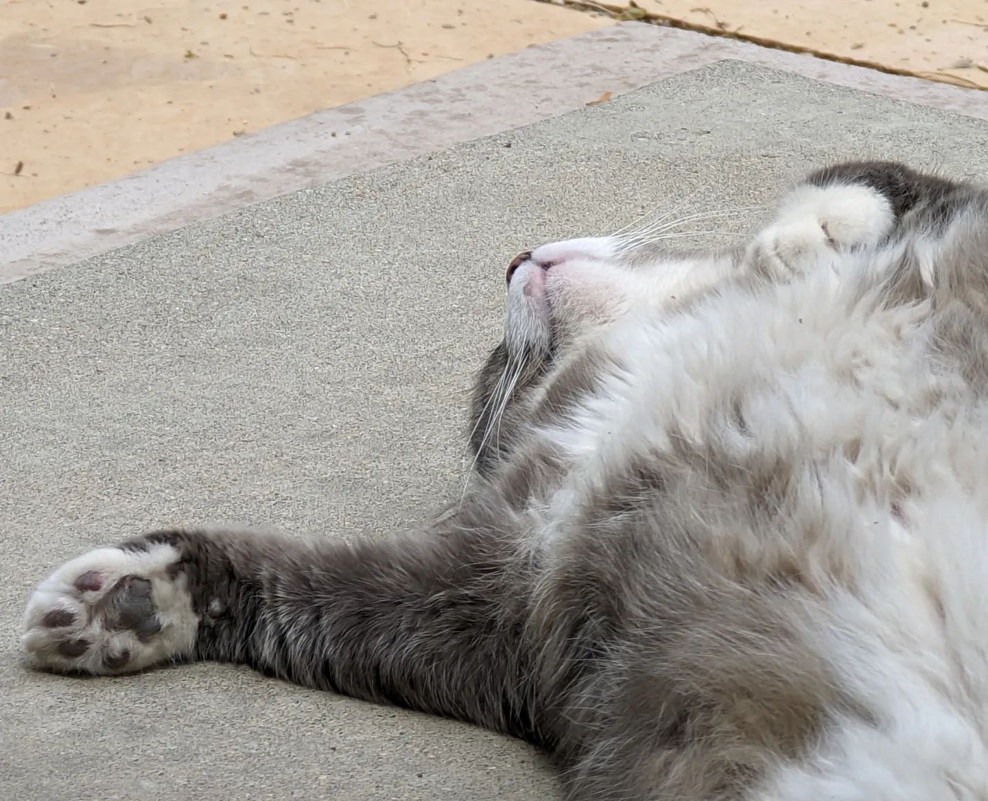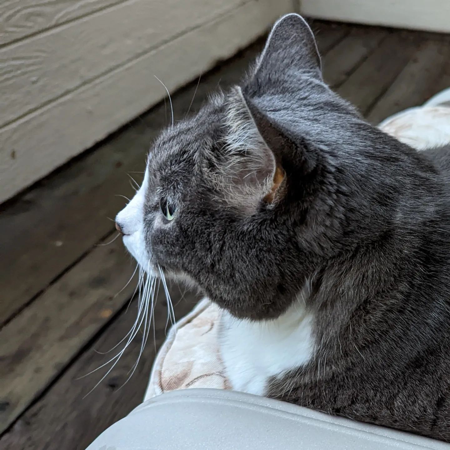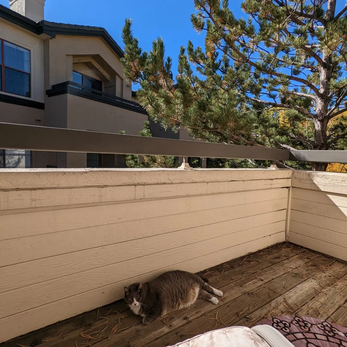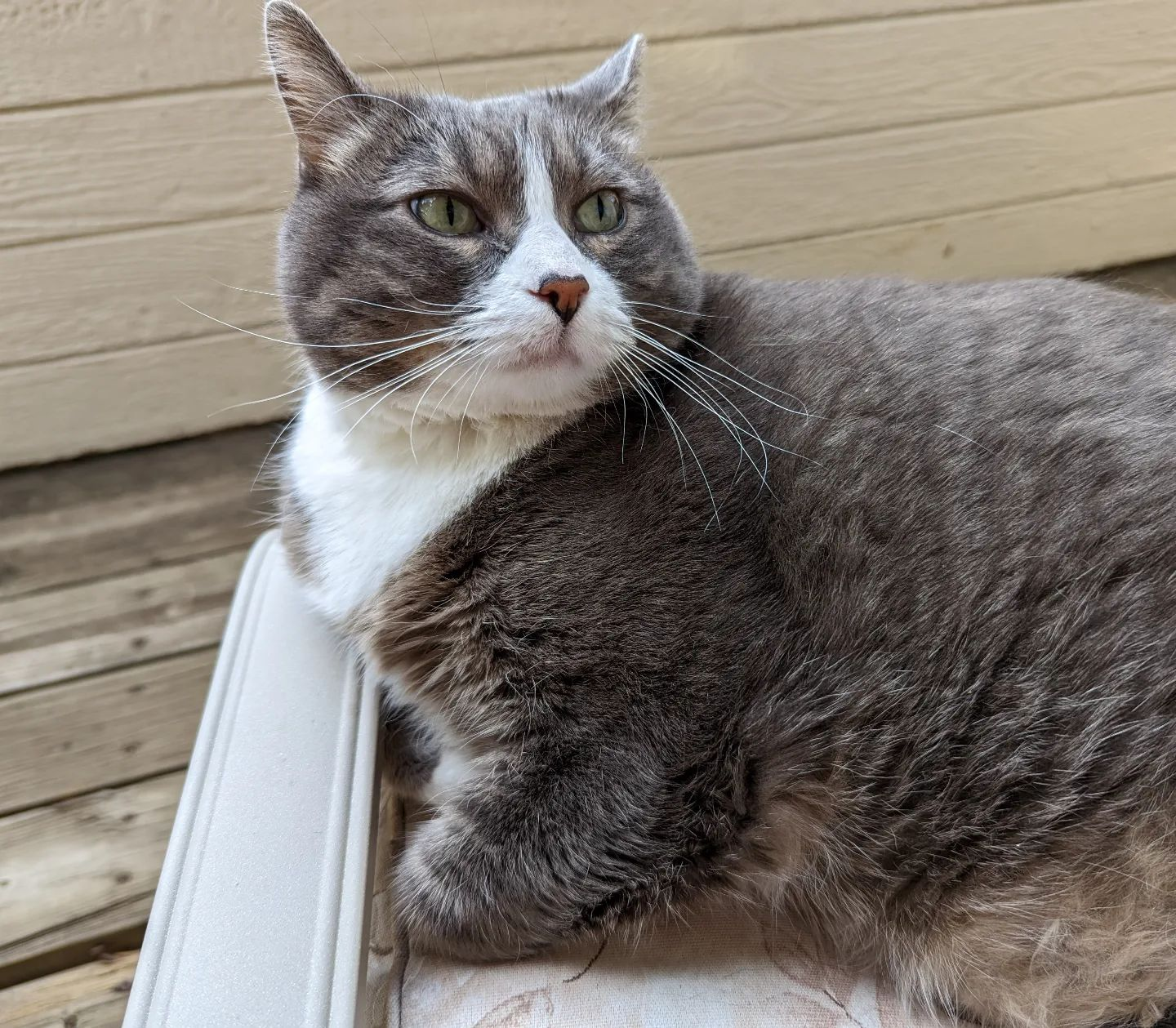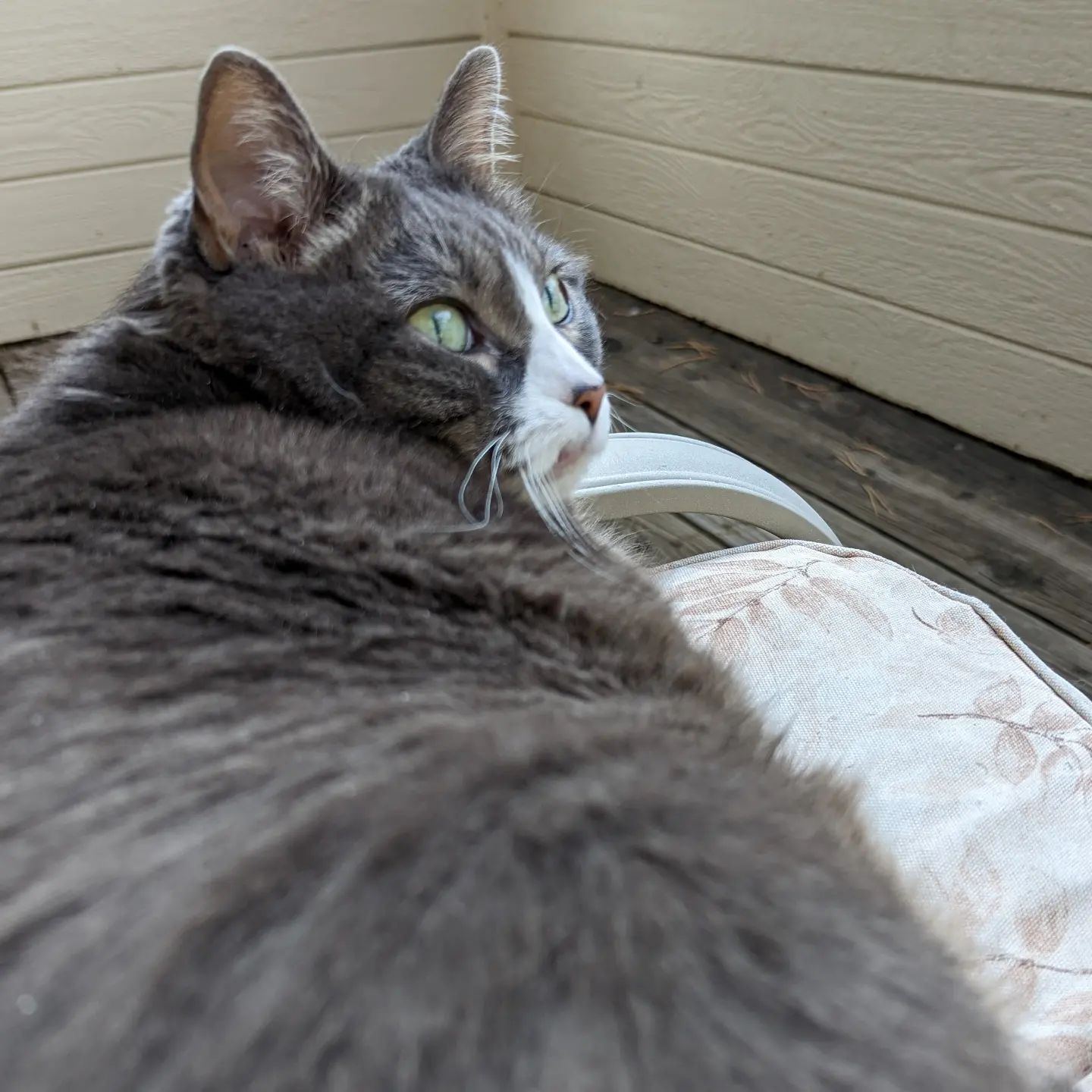 Loafing with a purpose. Ziggy is trying to toast on the woodbox, but it is only 38 deg outside (3.3 C)... but she will try to prove it's great and she doesn't need to come back inside. ????