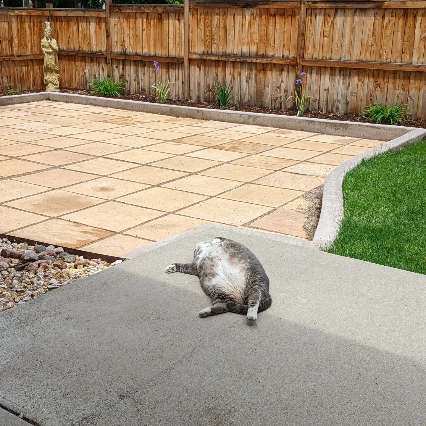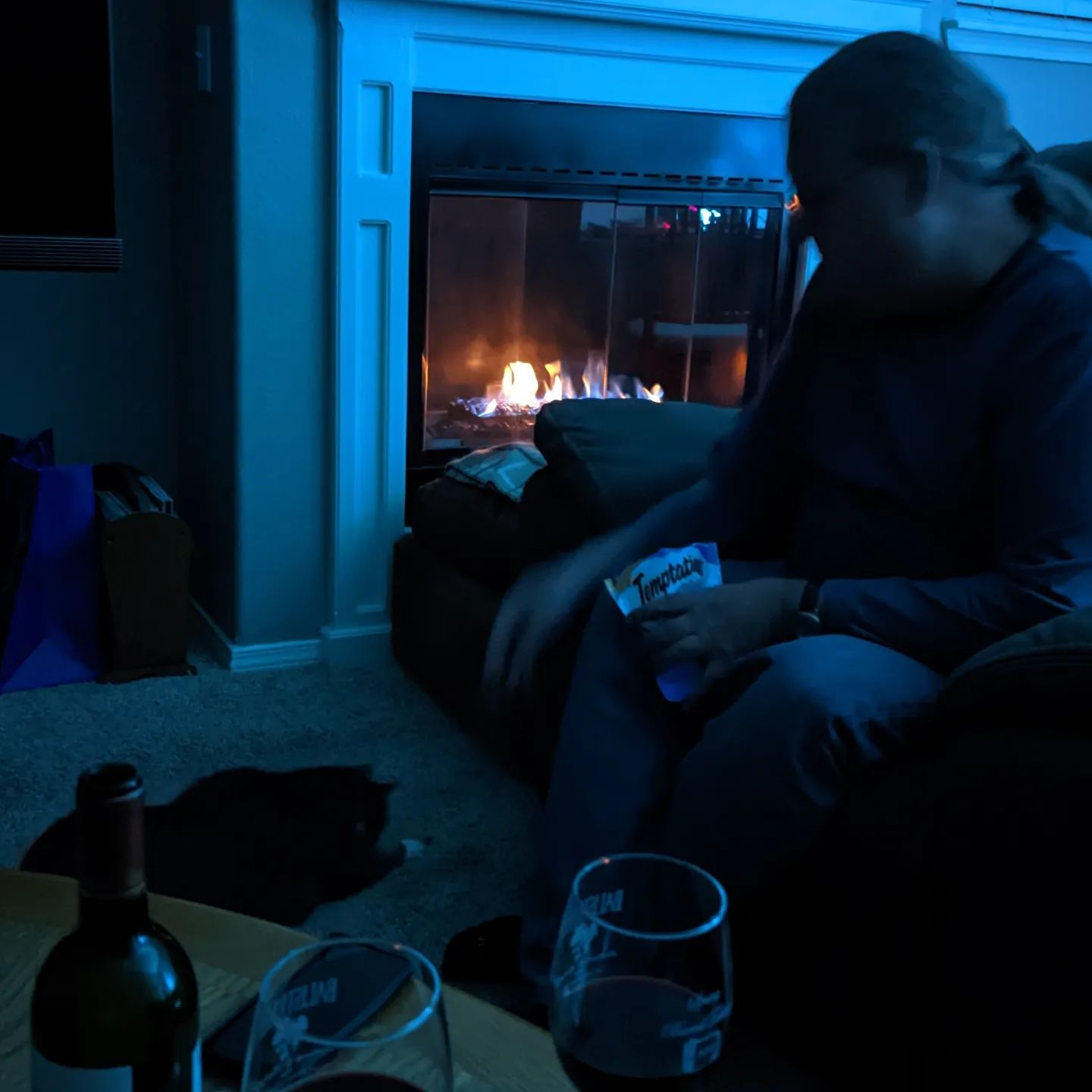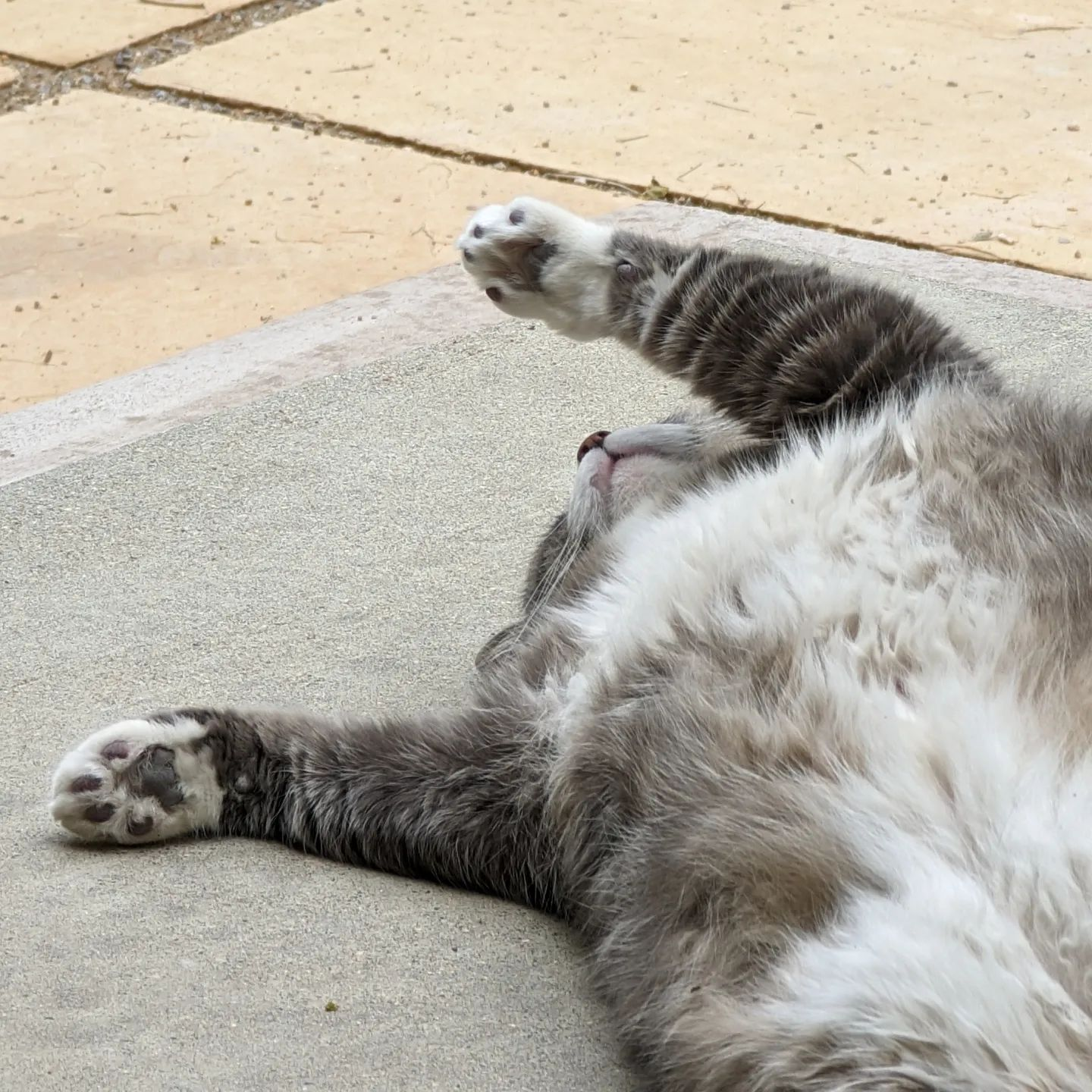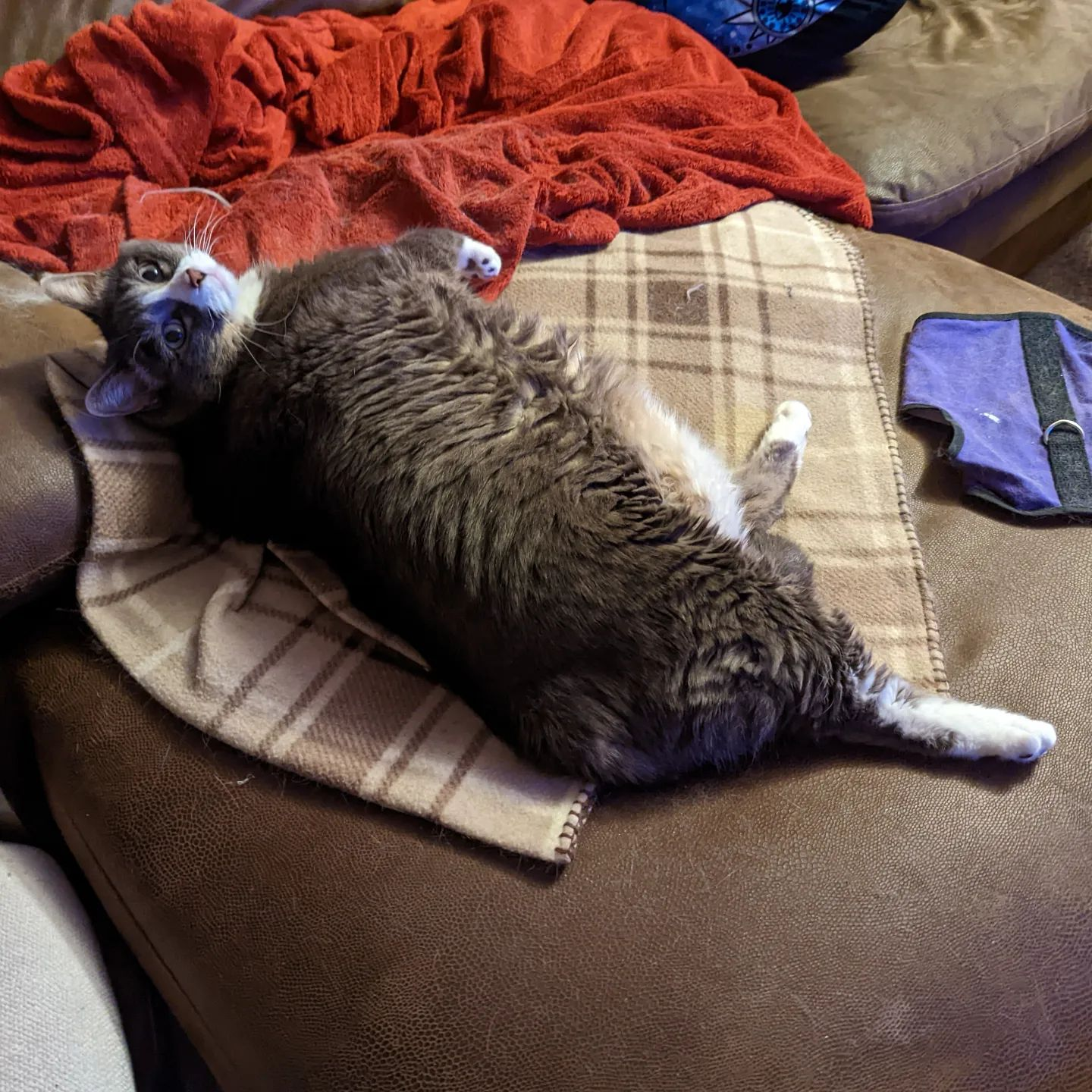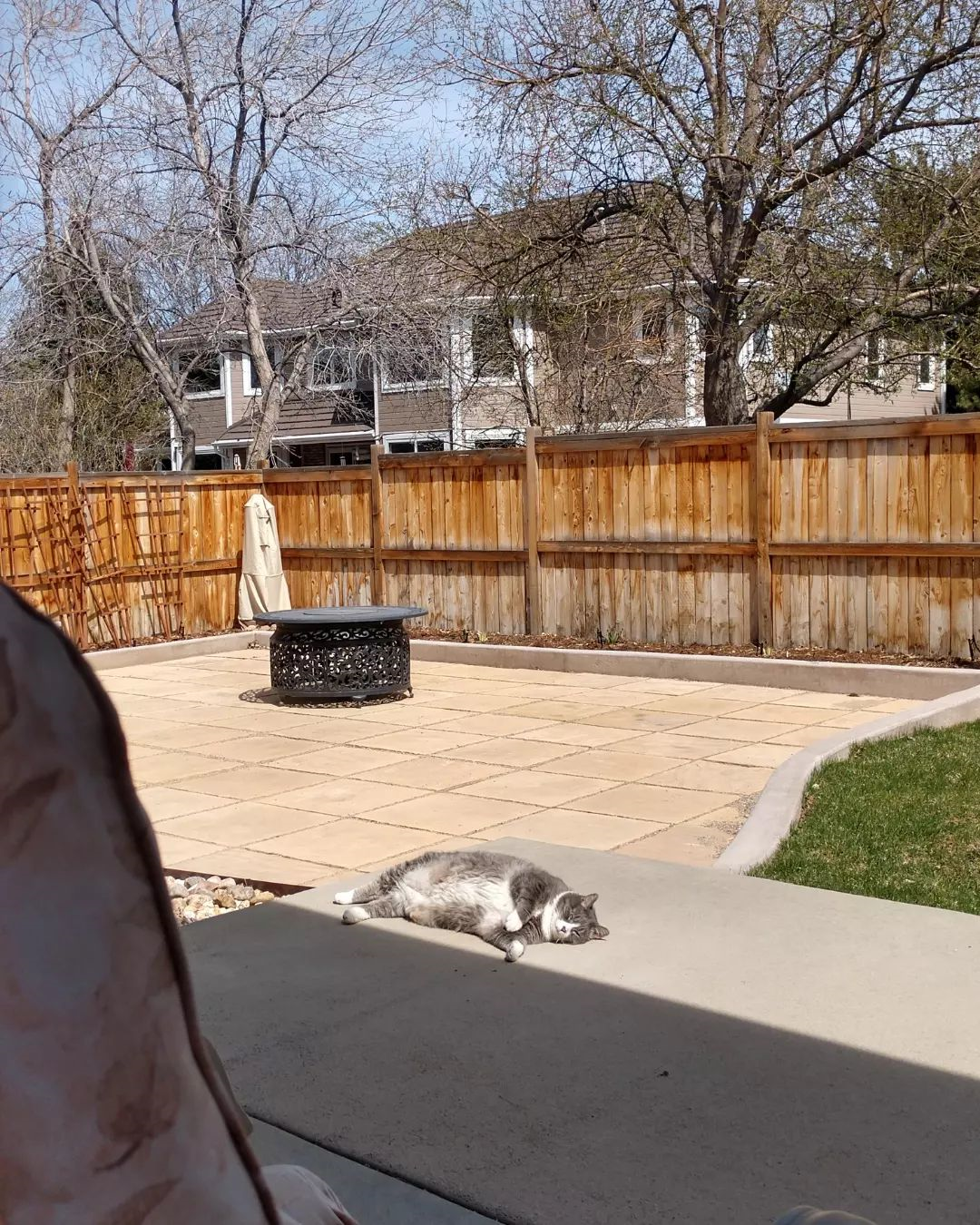 Loafing with a purpose. Ziggy is trying to toast on the woodbox, but it is only 38 deg outside (3.3 C)... but she will try to prove it's great and she doesn't need to come back inside. ????
