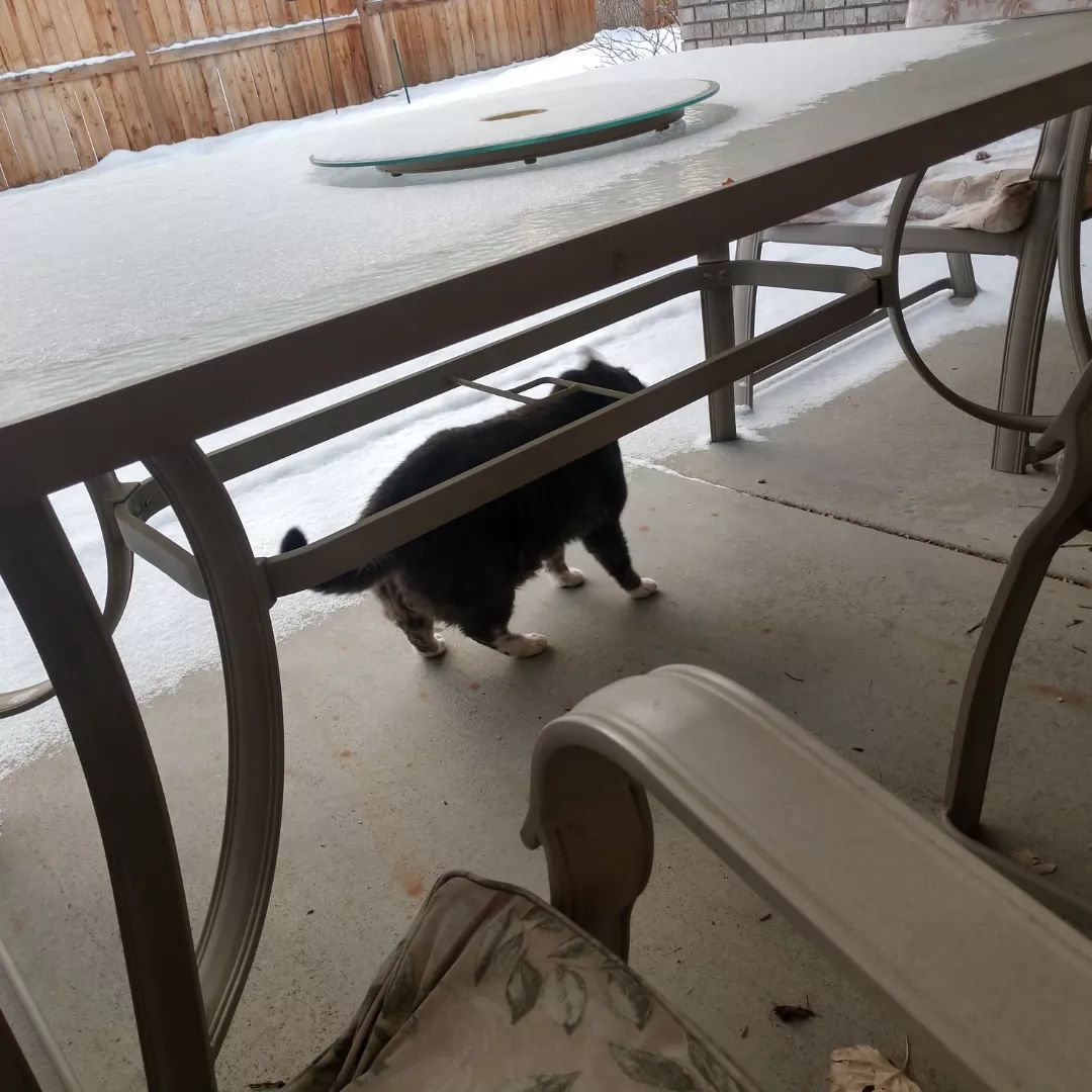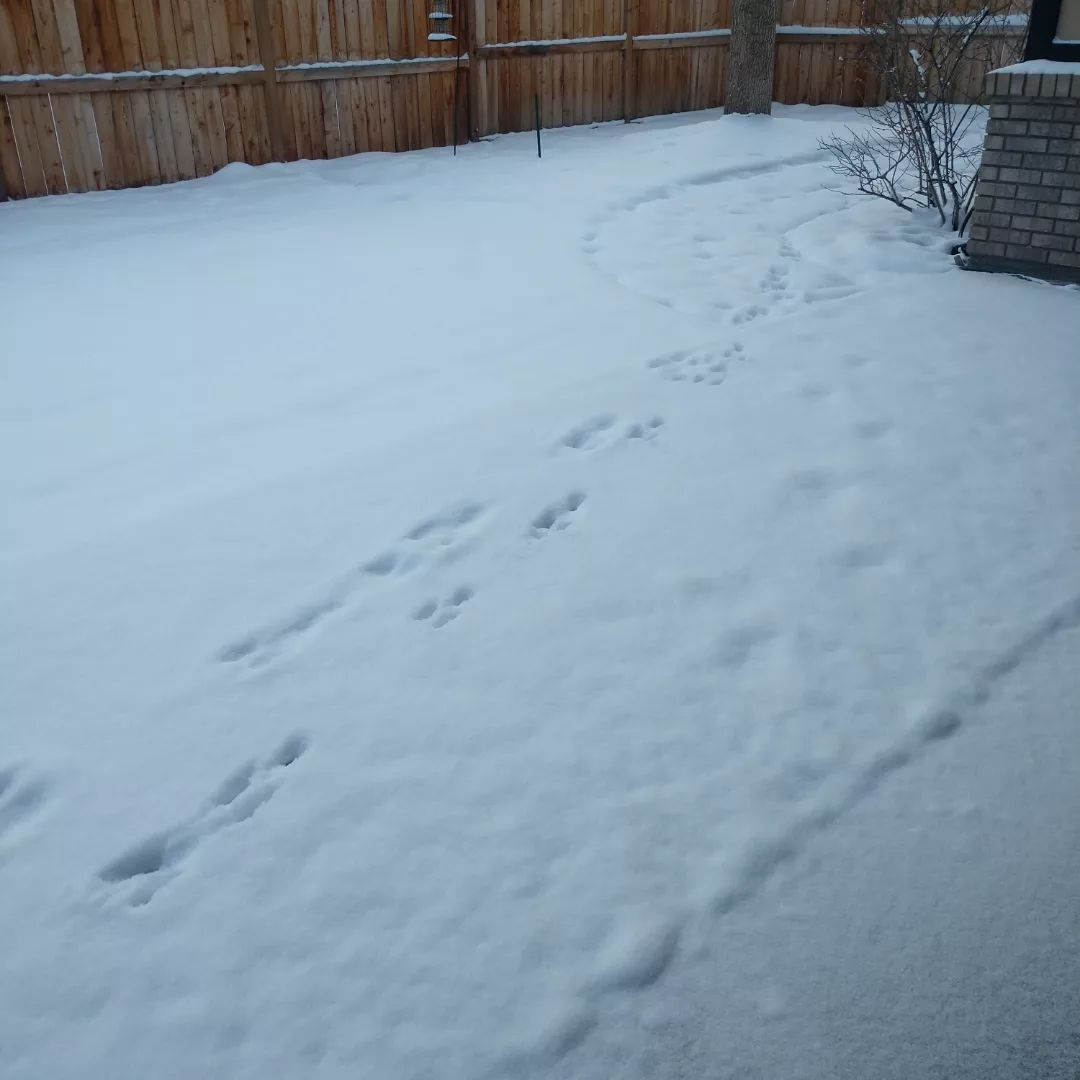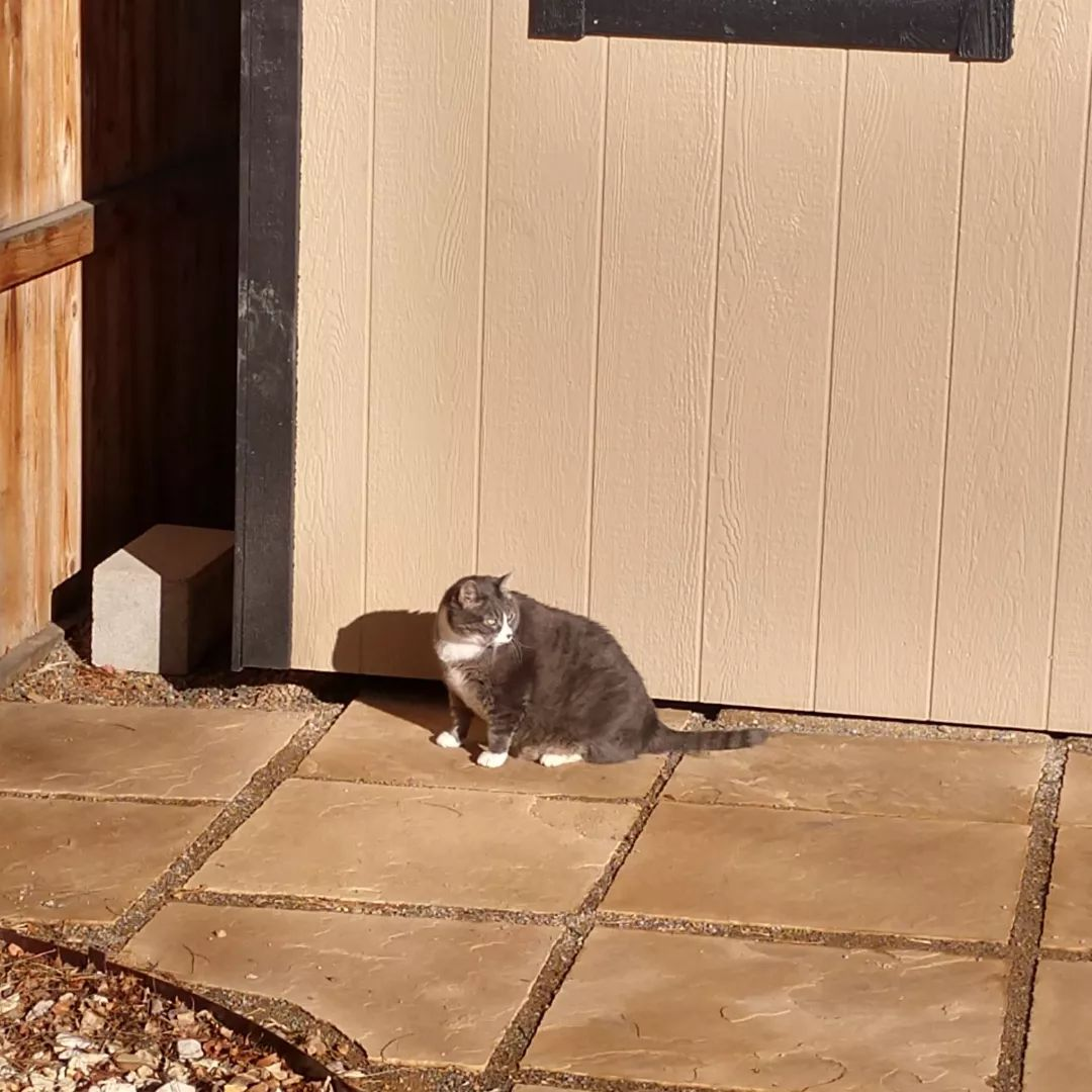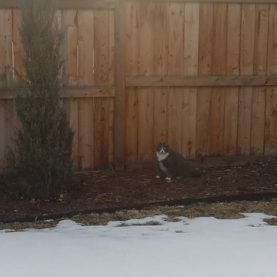 Thankfully, the kittens were in their home during the recent snowy and cold weather. The brave kitten came back this evening. Guard duty - high alert!
