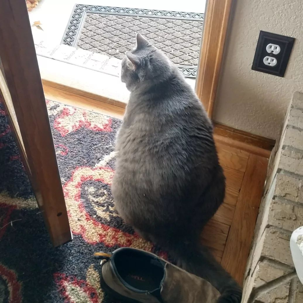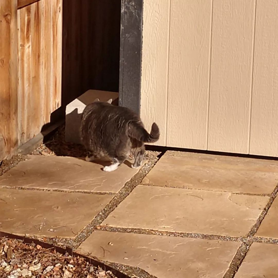 The brave kitten came by to visit this morning. Ziggy looks forward to seeing him every morning but isn't yet interested in having him inside.