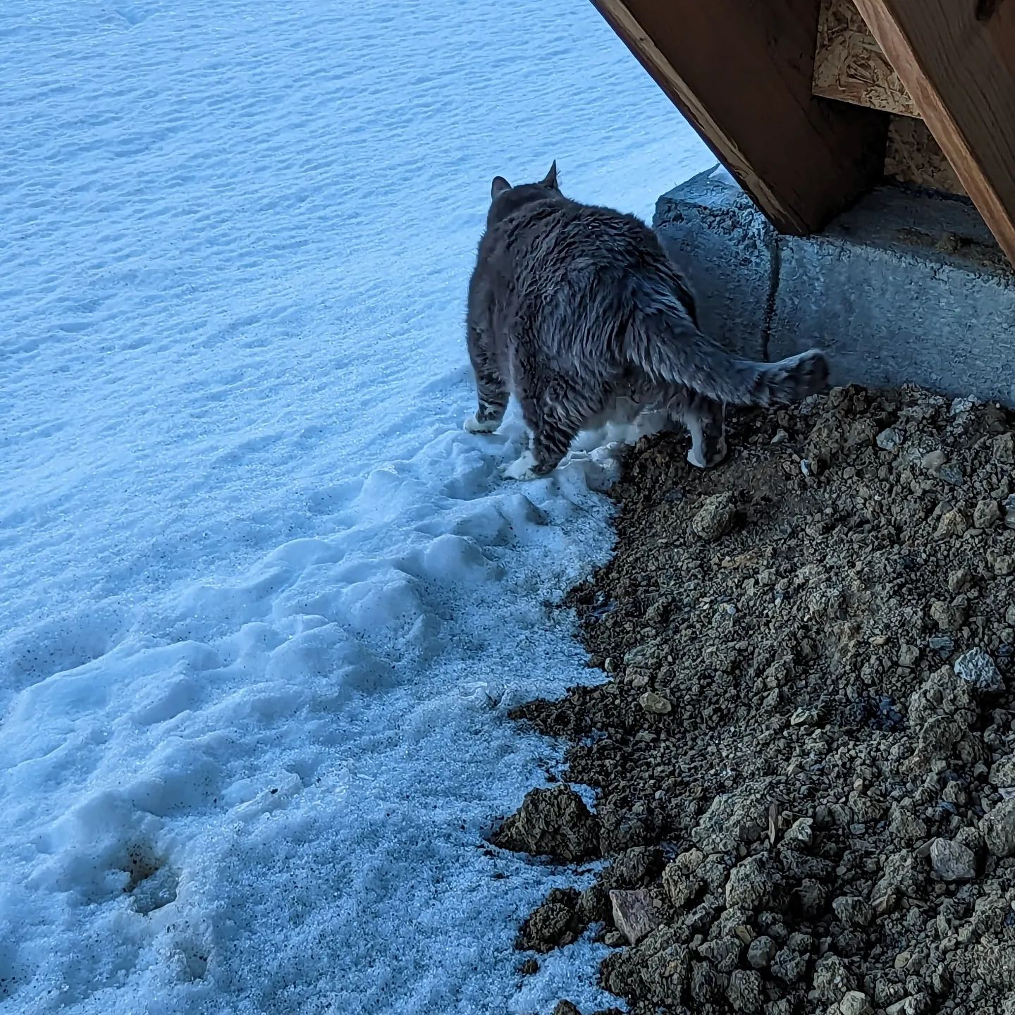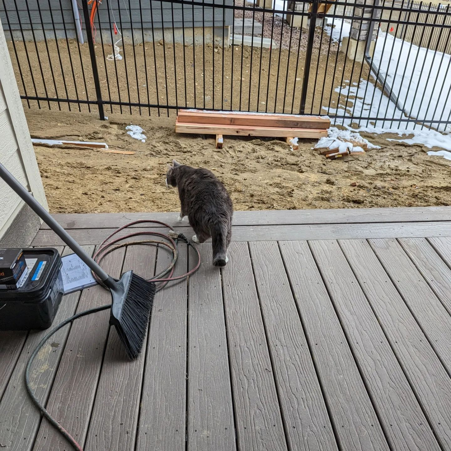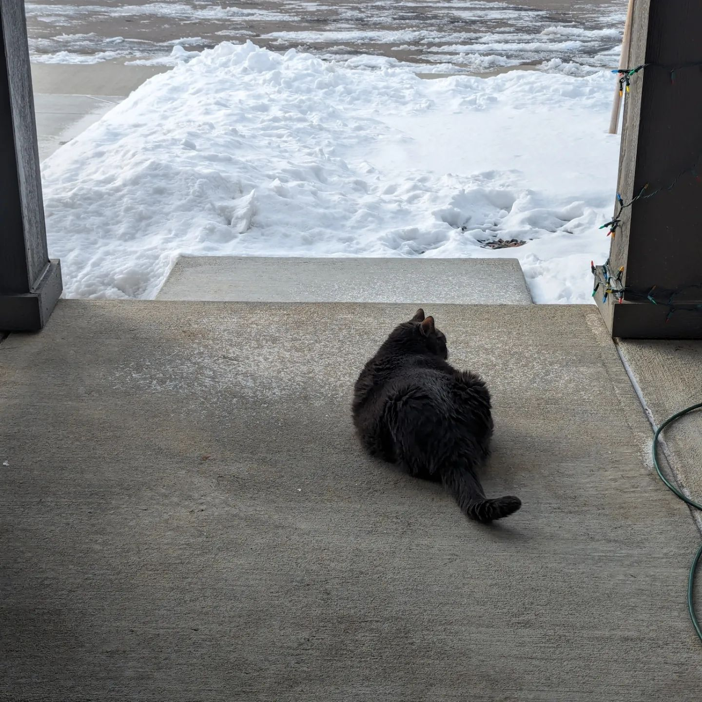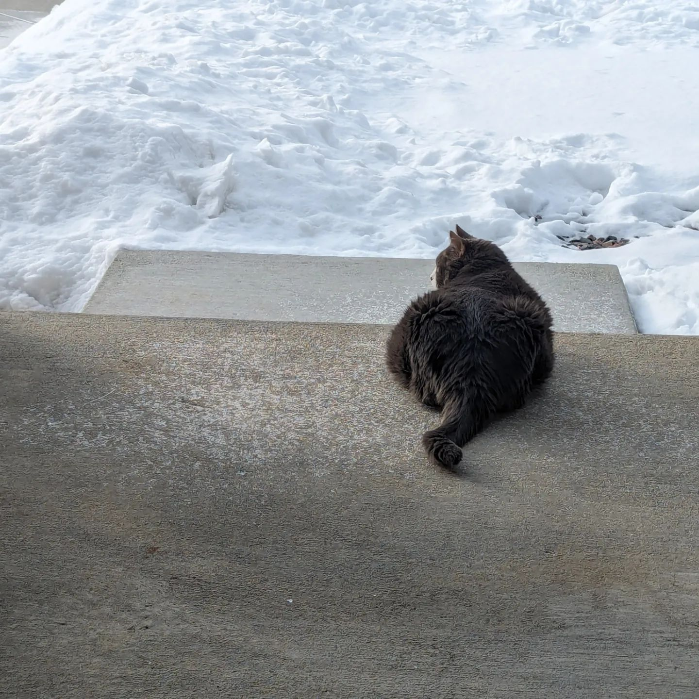 Outdoor adventure, part 2.... Checking on the infinity stair project. Our walkout basement door and our main floor patio door are connected by stairs. Ziggy is determined to go out one door and in through the other ... Well, not if the stairs are snowy.