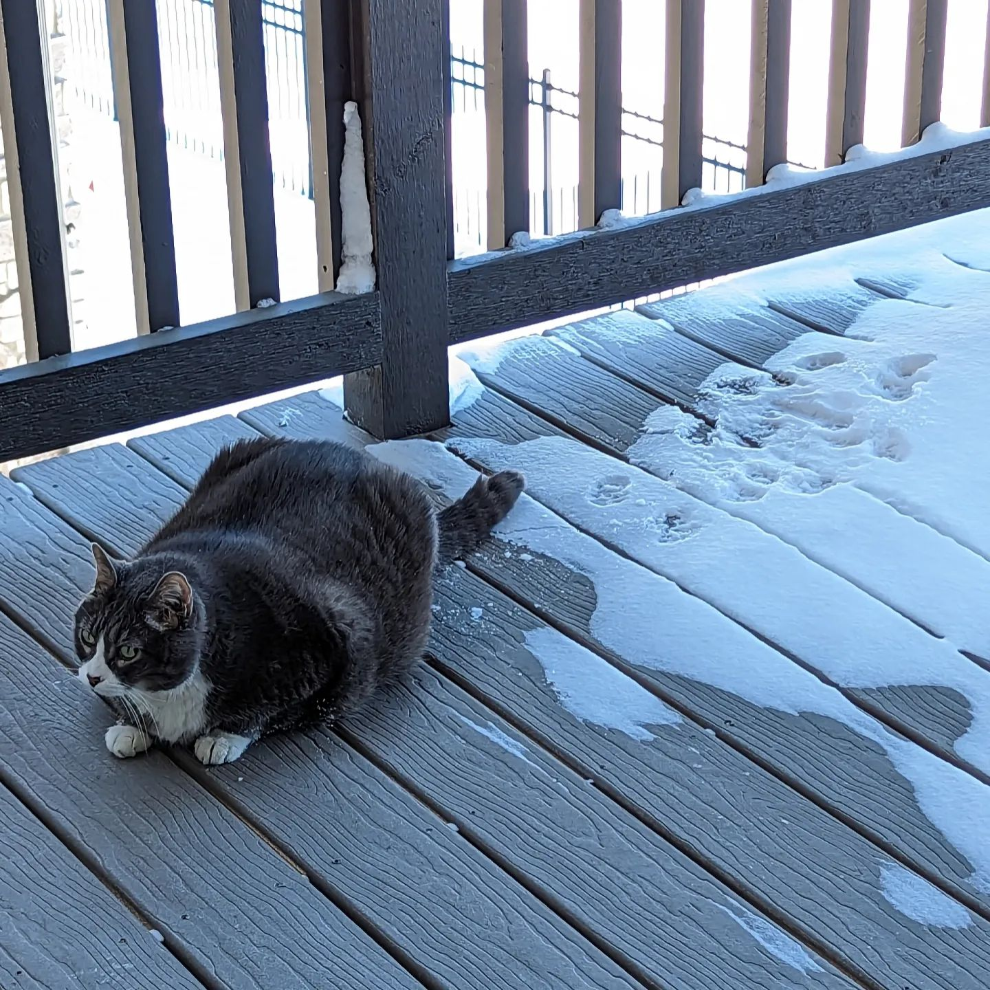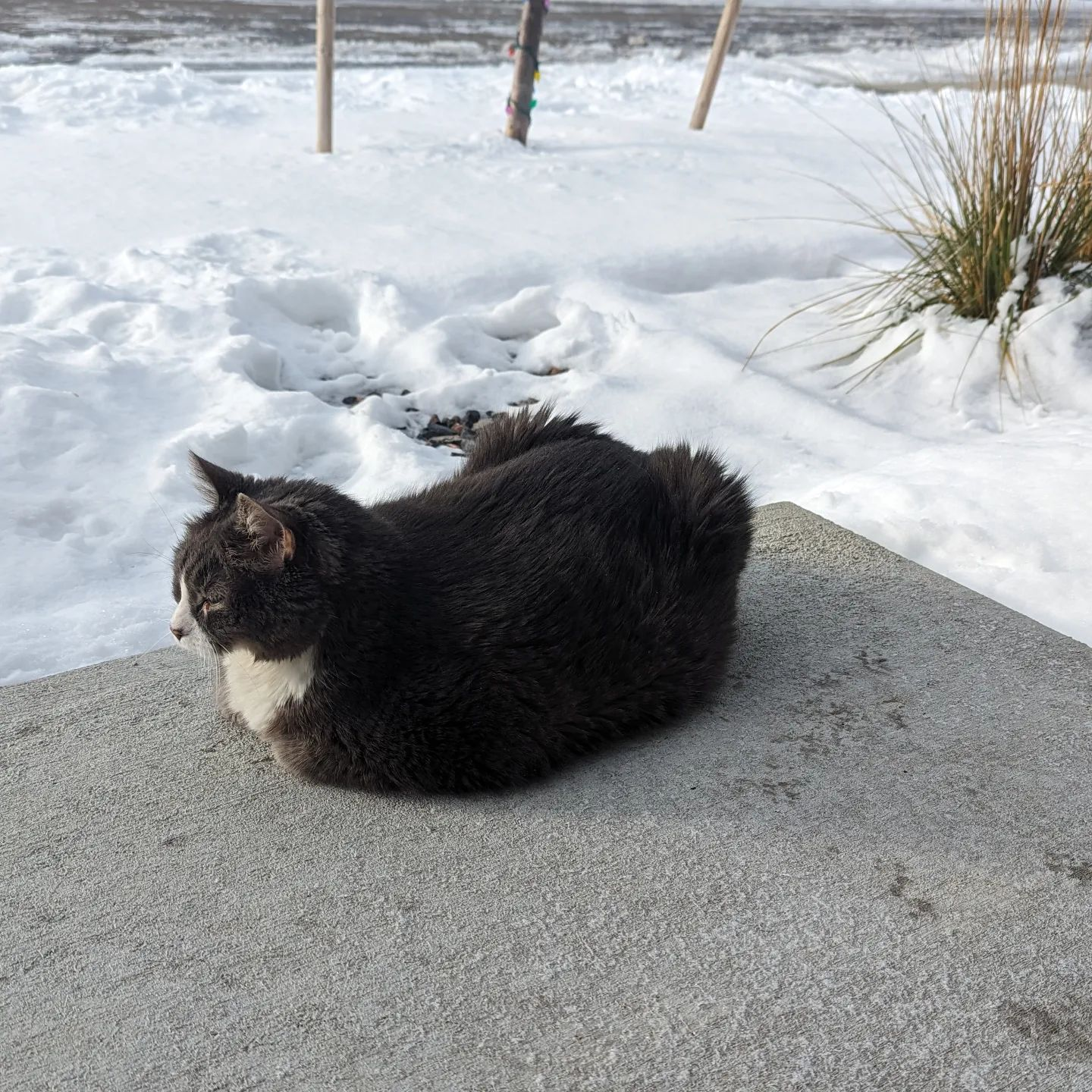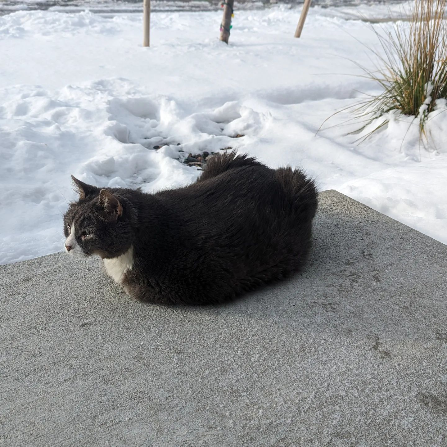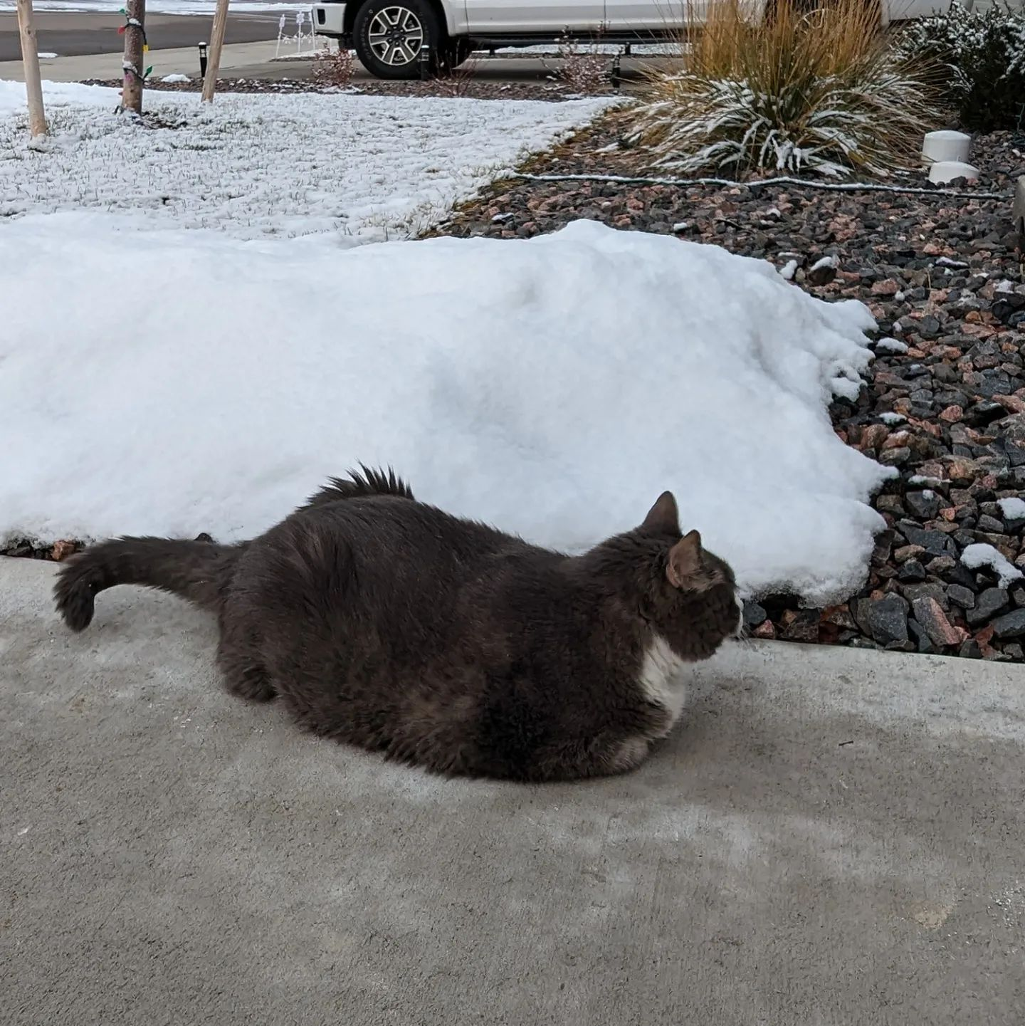 Happy Won't Look Whisker Wednesday from a proper cat loaf! Swipe for snowy sunrise over the neighborhood.