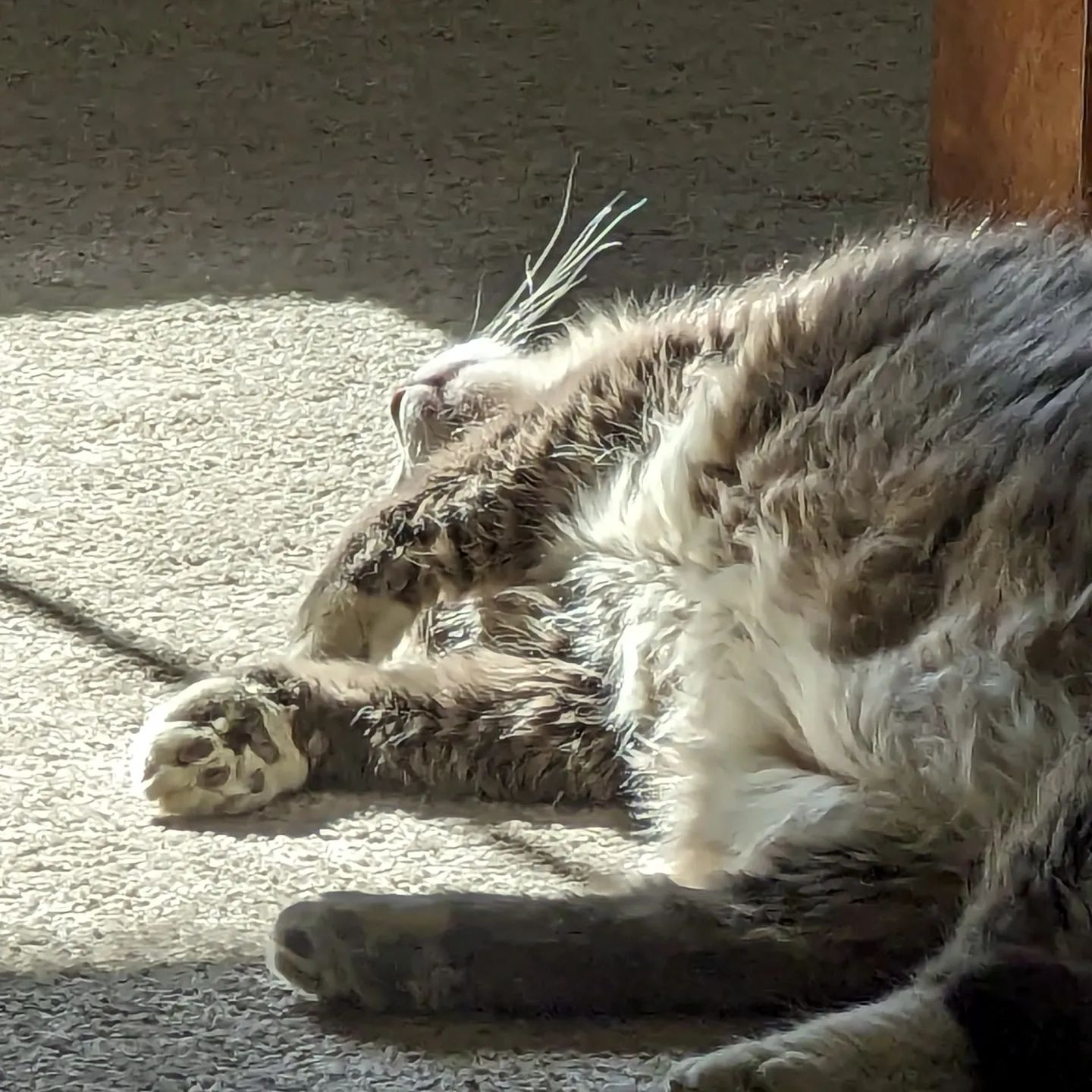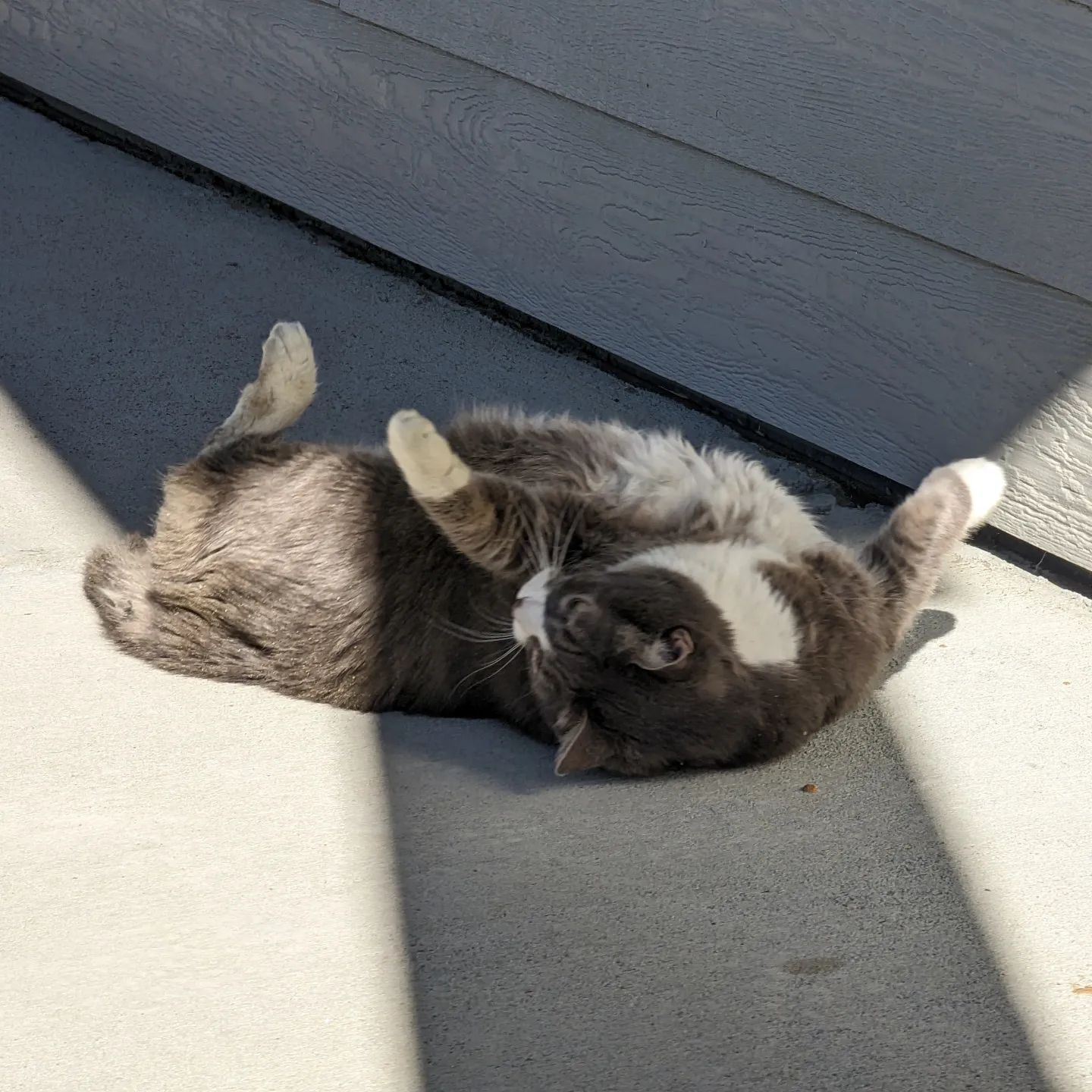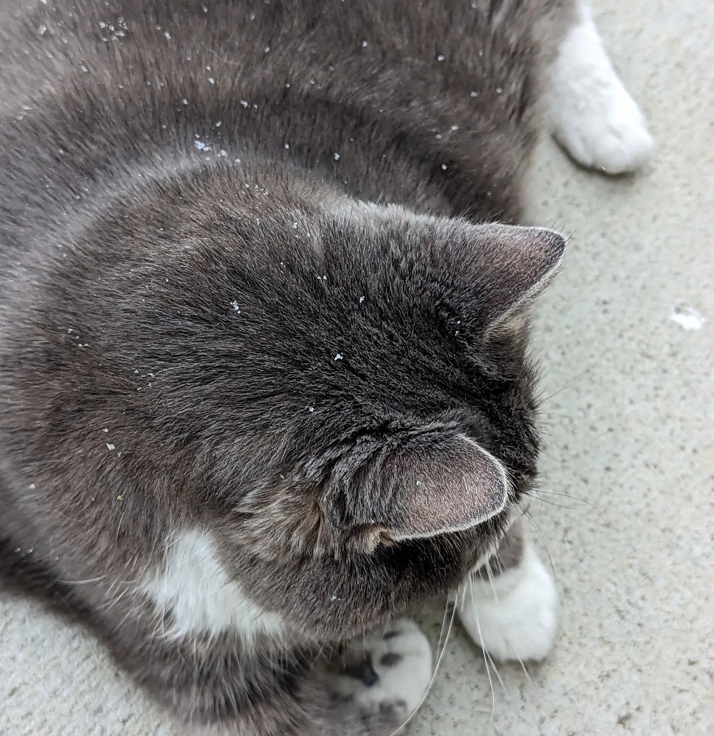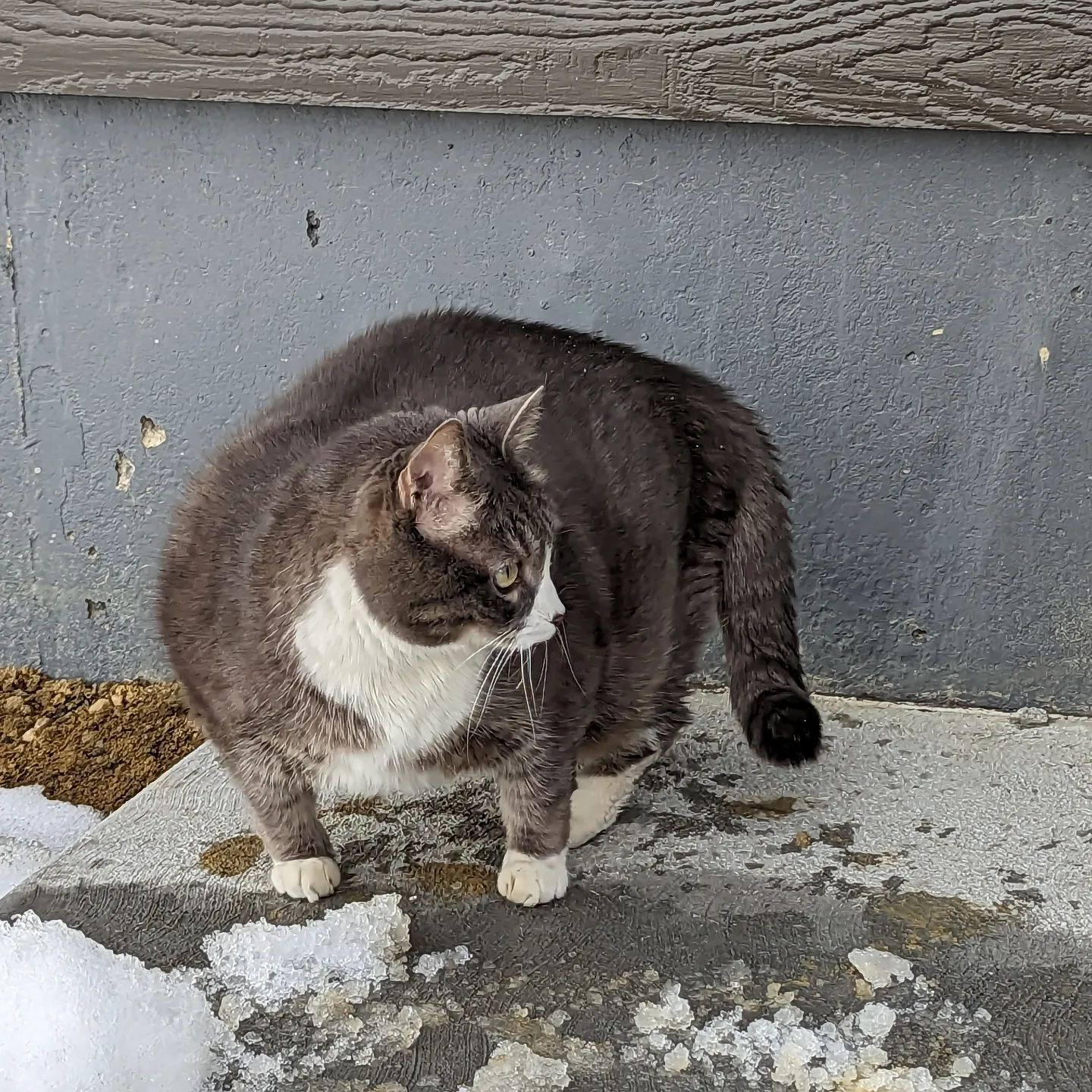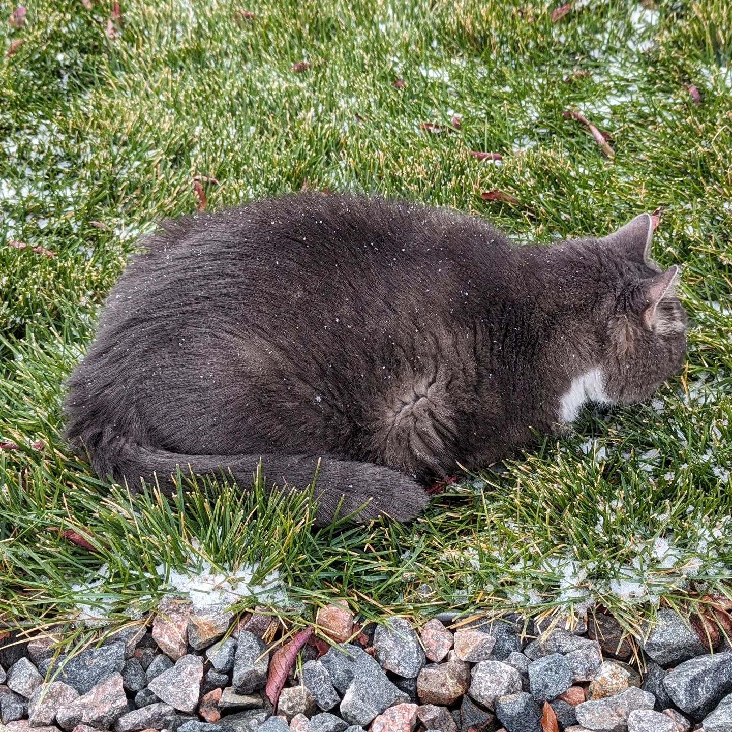 Happy Won't Look Whisker Wednesday from a proper cat loaf! Swipe for snowy sunrise over the neighborhood.