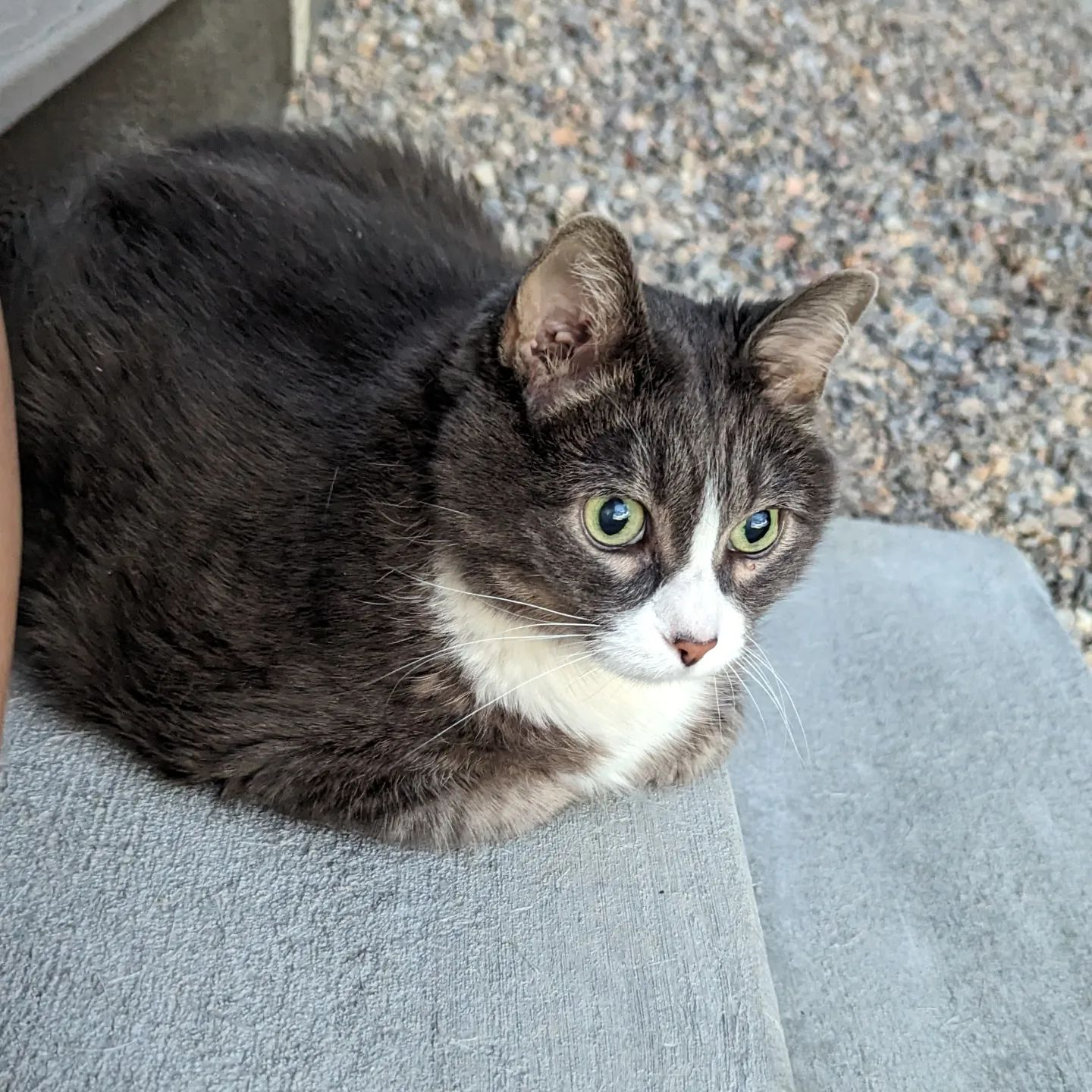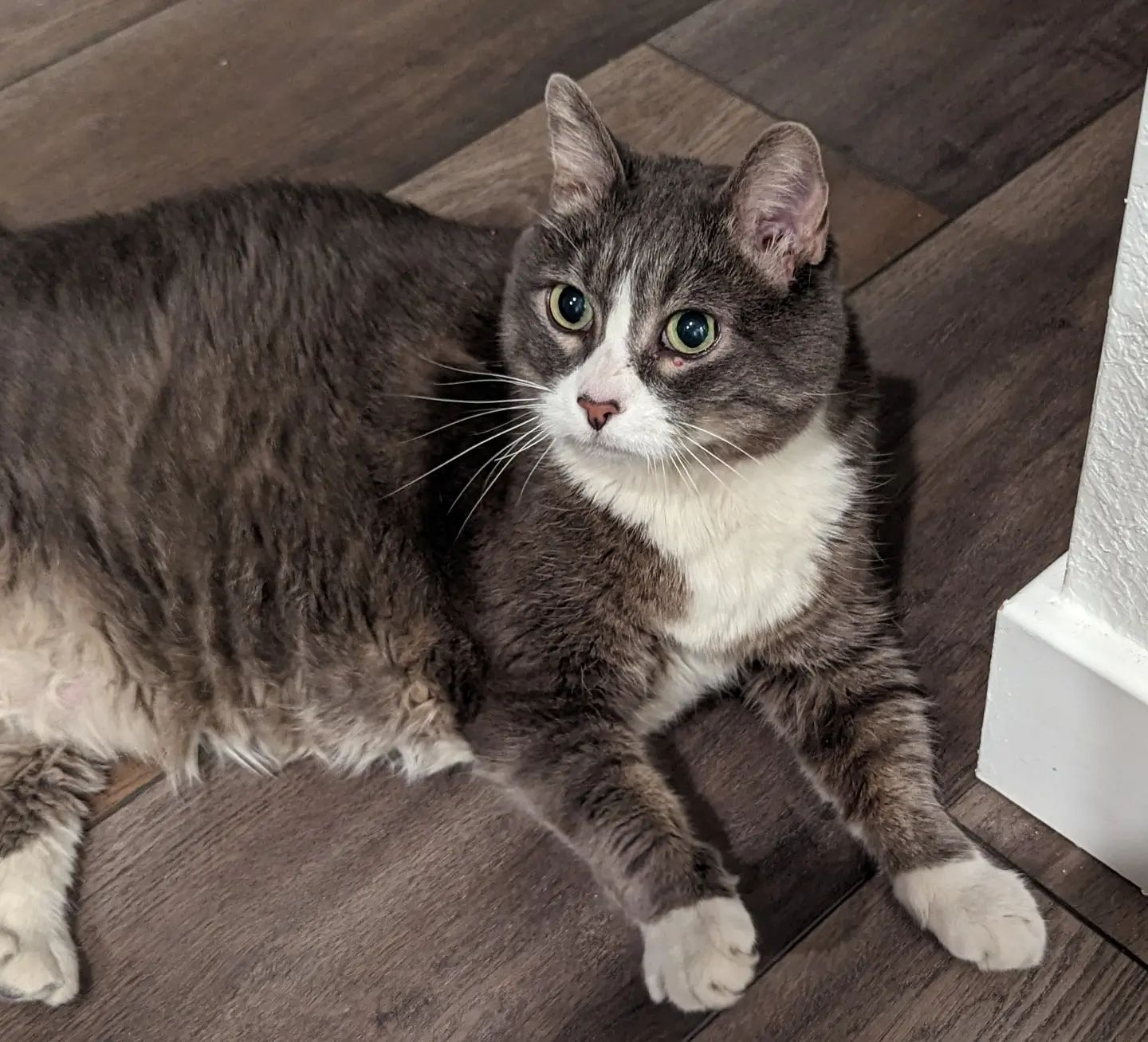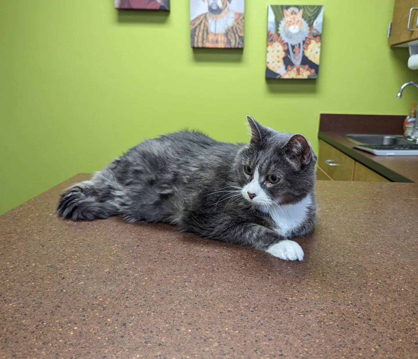 We went to the regular vet today. They did some chest x-rays and drew blood to test for pancreatitis. Results early next week. The X-rays revealed an arthritis hitch in her back. So, they did a laser pain therapy session on that and another water pack. She has definitely perked up and resumed normal eating and litter habits. The pain treatment is supposed to last 3 days.
