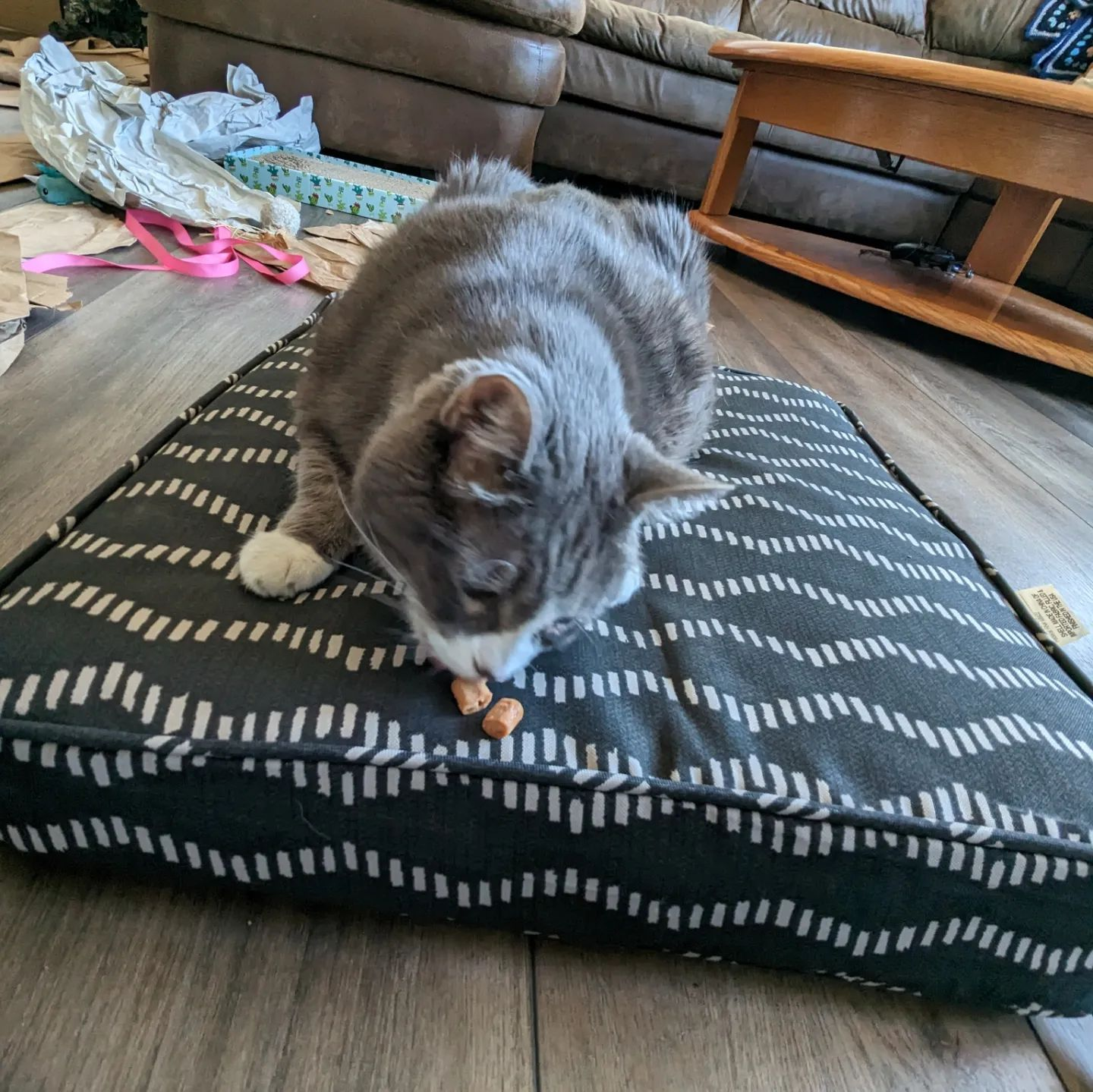 Ready for bedtime treats....not really sure how this became the preferred delivery spot.