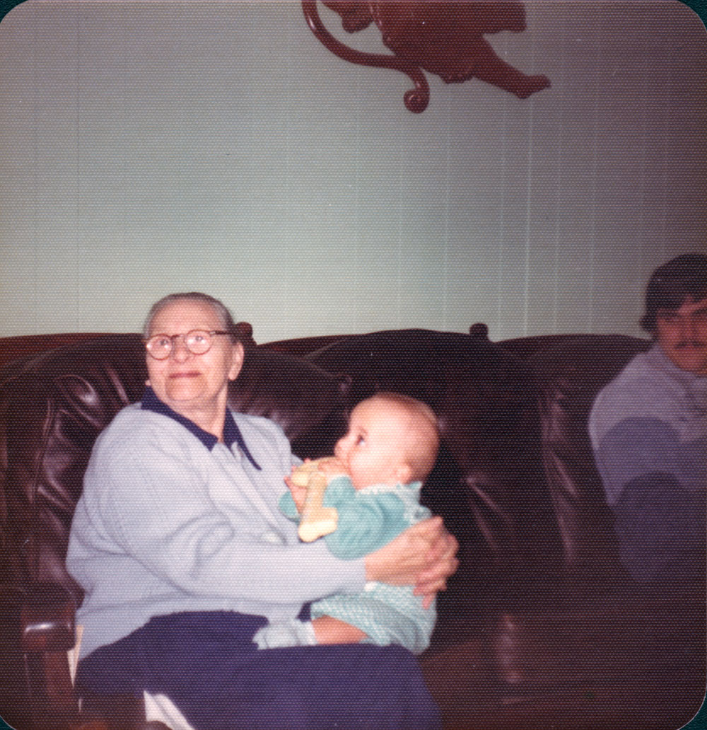 Here I am in my grandparents' living room with my great grandmother (dad's mom's mom), Priscilla Lucyshyn: