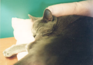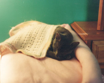 This is my cat, Smoeky, sleeping in what was my room in my parents' house. She's sleeping on a pink bed I made for her - a bed she has since outgrown.