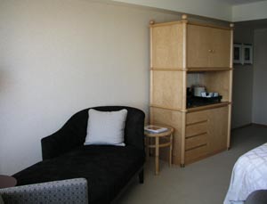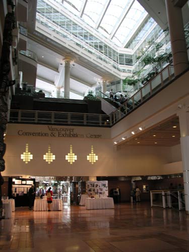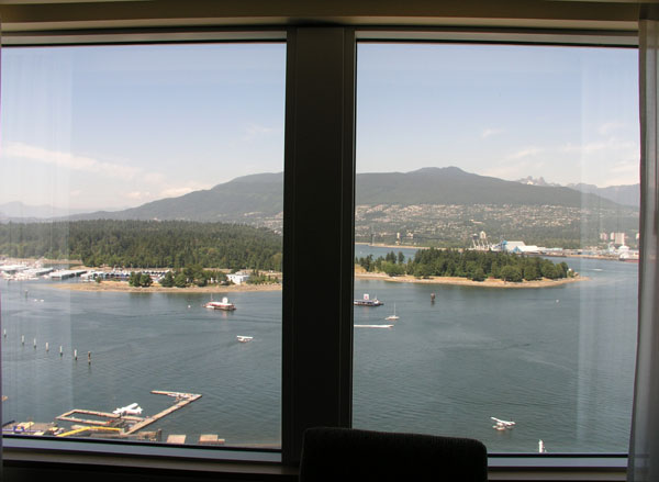 "The Dome of Doom: The Dome of Doom on top of the five-diamond Pan Pacific Hotel exerts a powerful influence on the city of Vancouver. Coming into the city along the Stanley Park causeway, it's the first thing that appears: 12 metres high, 19 metres around, a great green hemisphere riding high above the sails. When the recent Cola Harbour development was designed, entire skyscrapers were moved about just to preserve this corridor unobstructed. So what's inside the dome to make it worth such a fuss? Dust, elevator equipment, and a fully functional but now incomprehensible computer that used to run the light show that used to blaze out from the dome across the city. Oh, and some pigeons.Here's thew lobby of the Pan Pacific. The check in, shops, buffet restaurant, and outdoor bar are on the second floor. The Five Sails restaurant is on the third floor. Our room was on the 22nd floor.The Pan Pacific gets its fair share of the beautiful people..... For its greatest examples of customer service, the hotel prepares little anecdotes for internal circulation. The following are actual examples, given in the hotels own words: