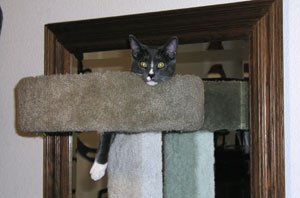 They have a new kitten, Charcoal or "Charcky", who was being quite wild. Here he is at the top of his cat tower.