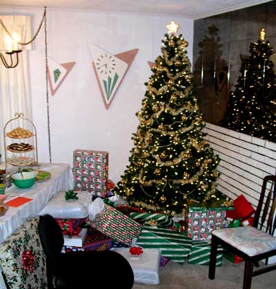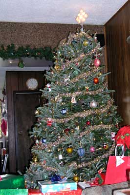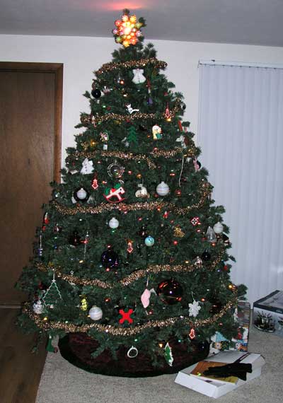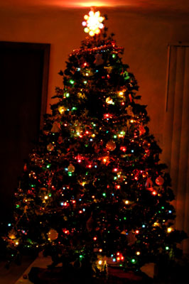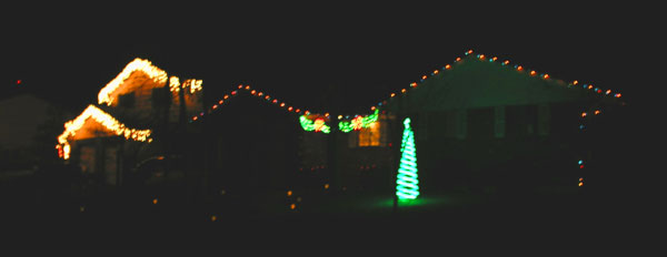 We put up some lights outside - but not as many as we would have liked. Next year, there will be more! as well as a Calvin & Hobbes theme with Mike's painting of Calvin and Hobbes sledding as well as some of the famous snowmen, assuming we figure out how we would make them. You can see our house as well as the lights from the house next door. Additions to the light collections included green "swag" with red bows and the UFO tree - which lights up the entire north half of the front yard and the laundry room with an eerie green glow.
