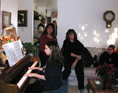 After dinner, we spent some time watching Sarah play piano. From left to right, Sarah, Bella's sister Bobbi, Bella, and Bobbi's son. Terry and Mark are in the kitchen.