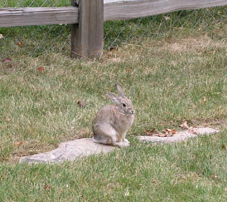 Our new neighbors include a group of three rabbits that frequent our yard. I greatly enjoy having them around, because they're just so cute! When they think you see them, they'll often try to sit very still with their ears back - a pose I call "being a rock"..... e.g., "No one here but us rocks! You might as well be on your way!"