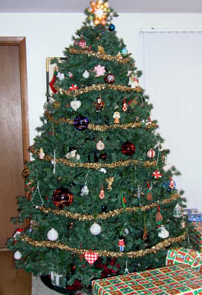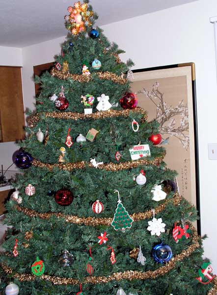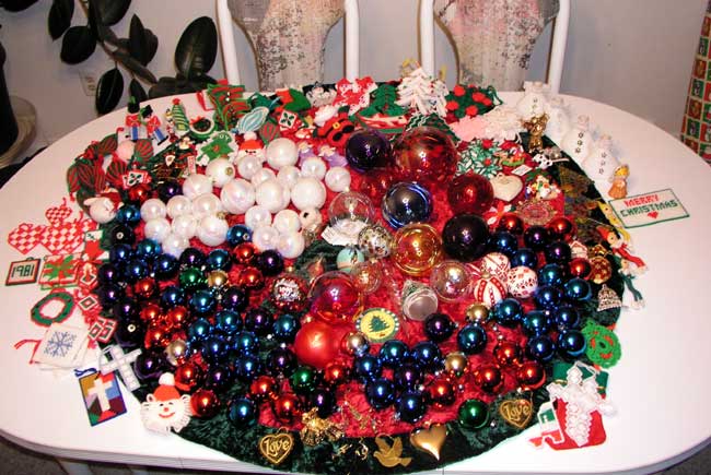 Here is the ornament collection before it was put on the tree. The hand-made ornaments were made by my Grandma.