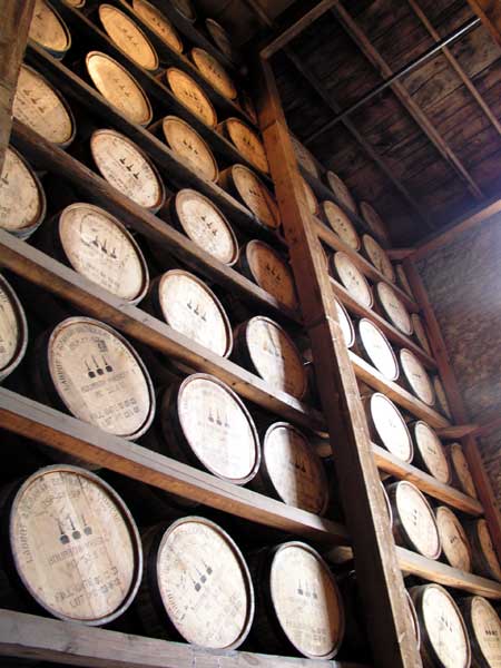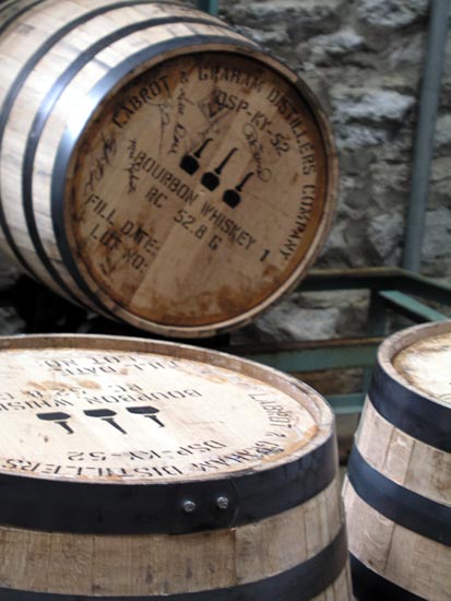 "This is Warehouse C, the oldest surviving stone aging house in the U.S., built in the late 1880's. Warehouses are where we mature our whiskey and where the "magic" of turning whiskey into Bourbon takes place. The whiskey in the barrels goes into the warehouses clear and leaves some years later a rich amber liquid called Bourbon. How does this happen? During our hot Kentucky summers the whiskey in the barrel expands, forcing its way through the toasted and charred layers of the barrel and into the wood where it stays until the cold winters cause the whiskey to contract. When this happens, the liquid is pulled back through the layers a second time. This passage in and out of the wood is referred to as a "cycle." With each cycle the product in the barrel picks up more color, aroma and taste. Normally Mother Nature gives you 4-5 cycles a year."