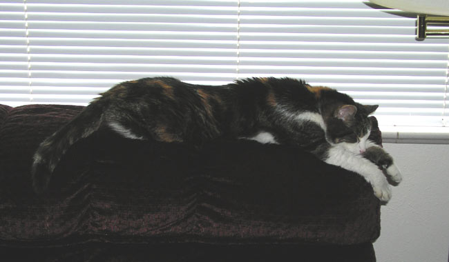 Phoebe stayed in the kennel at the vet's office, so they could administer her meds, etc. Mike's mom picked her up before we got home on Saturday, so she was there waiting for us. By Sunday, everything seemed back to normal, but it was obvious the whole process had worn out a little cat we know....