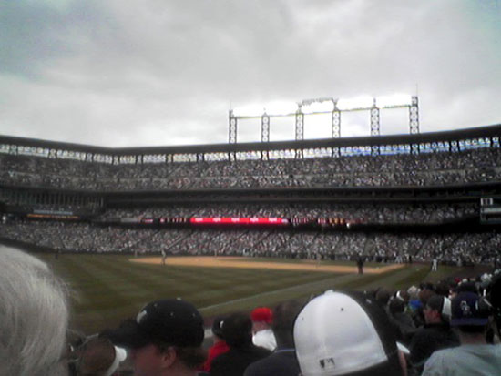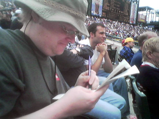 Mike and Jarl continued their tradition of attending opening day at Coors Field. Mike took these pictures with his cell phone. Here's Jarl working hard on the score-keeping. ;>)