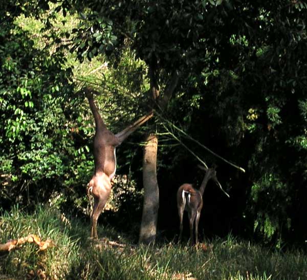 Prefers small mixed herds of 2-5 animals. All have horns, though females' horns are straighter, thinner, and slightly shorter. Can stand on hind legs to browse.