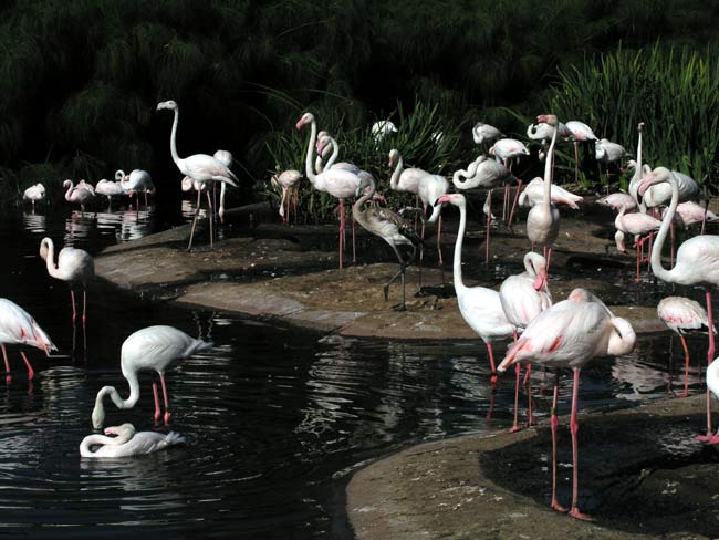 Smaller and pinker than greater flamingos. Largest colony numbers over one million pairs!