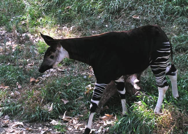 shy and well camouflaged - explains why okapi wasn't discovered until this (20th) century. Stripes on hind quarters similar to zebra - actually a member of the giraffe family.