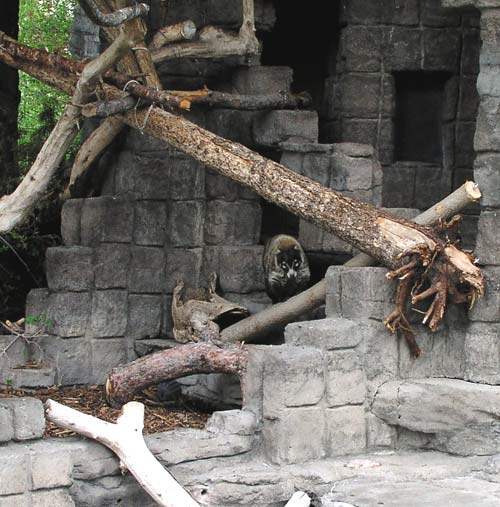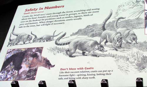 Coatis (ko-WAH-teez) roam through the forest, scratching and nosing about for food. Females and young travel in groups, so there are many eyes on the lookout for predators such as snakes, jaguars, birds of prey, and humans. When danger threatens, coatis usually take to the trees, but will fight if necessary.Don't mess with Coatis. Like their racoon relatives, coatis can put up a fearsome fight - spitting, hissing, lashing their tails, and biting with sharp teeth.