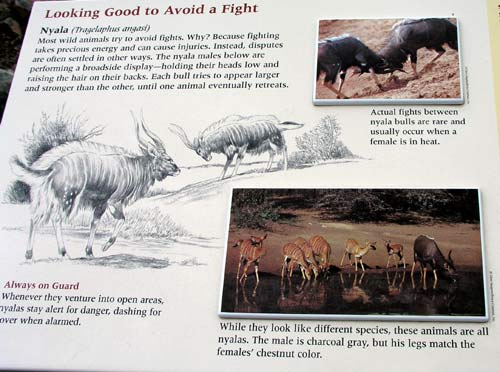 Most wild animals try to avoid fights. Why? Because fighting takes precious energy and can cause injuries. Instead, disputes are often settled in other ways. The nyala males below are performing a broadside display - holding their heads low and raising the hair on their backs. Each bull tries to appear larger and stronger than the other, until one animal eventually retreats.Actual fights between nyala bulls are rare and usually occur when a female is in heat.