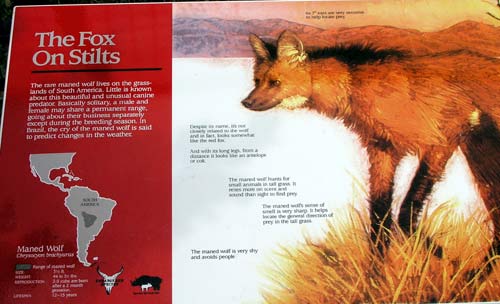 The Fox on StiltsThe rare maned wolf lives on the grasslands of South America. Little is known about this beautiful and unusual canine predator. Basically solitary, a male and female may share a permanent range, going about their business separately except during the breeding season. In Brazil, the cry of the maned wolf is said to predict changes in weather.