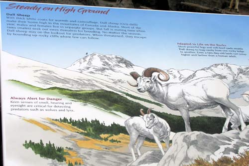 Short powerful legs and soft hoof pads enable Dall sheep to leap easily from one rocky ledge to another. Even a two-day-old lamb can jump higher and farther than a human adult.