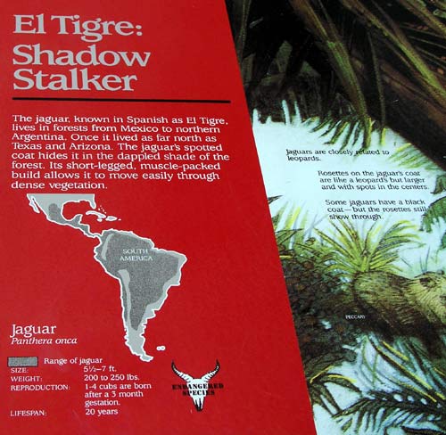 El Tigre: Shadow StalkerThe Jaguar, known in Spanish as El Tigre, lives in forests from Mexico to northern Argentina. Once it lived as far north as Texas and Arizona. The jaguar's spotted coat hides it in the dappled shade of the forest. Its short-legged, muscle-packed build allows it to move easily through dense vegetation.