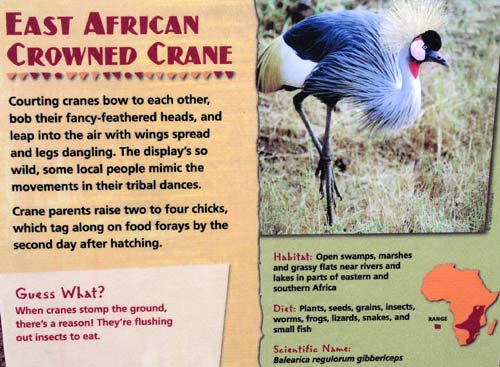 "East African Crowned CraneCourting cranes bow to each other, bob their fancy-feathered heads, and leap into the air with wings spread and legs dangling. This display's so wild, some local people mimic the movements in their tribal dances. Crane parents raise two to four chicks, which tag along on food forays by the second day after hatching.