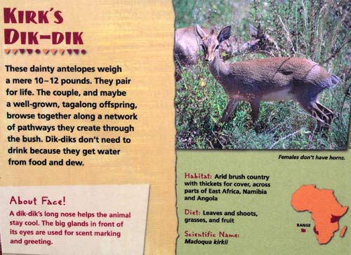Kirk's Dik-DikThese dainty antelopes weigh a mere 10-12 pounds. They pair for life. The couple, and maybe a well-grown, tagalong offspring, browse together through a network of pathways they create through the bush. Dik-dik's don't need to drink because they get water from food an dew.