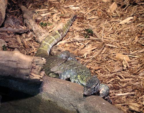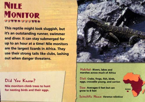 Nile MonitorThis reptile may look sluggish, but it's an outstanding runner, swimmer, and diver. It can stay submerged for up to an hour at a time! Nile monitors are the largest lizards in Africa. They use their strong tails like clubs, lashing out when danger threatens.