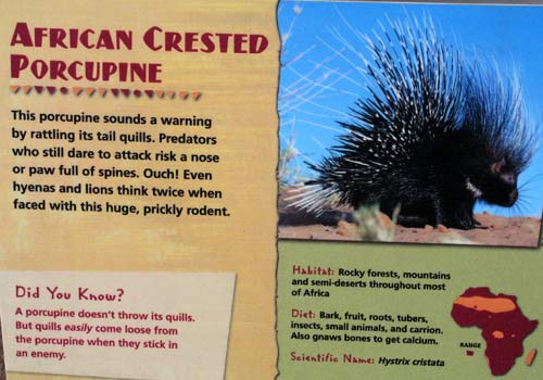 African Crested PorcupineThis porcupine sounds a warning by rattling its tail quills. Predators who still dare to attack risk a nose or paw full of spines. Ouch! Even hyenas and lions think twice when faced with this huge, prickly rodent.