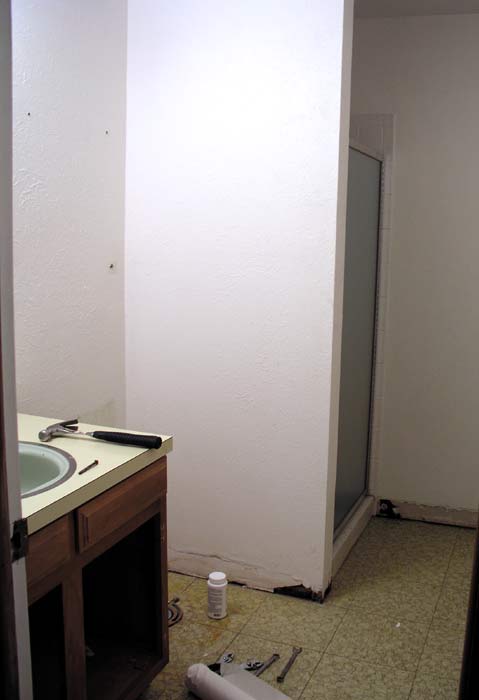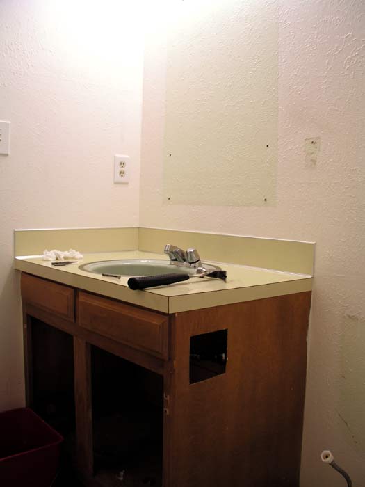 This all started when the sewer line backed up. With the help of my dad, who was on the phone, we discovered that the seal at the base of the toilet in the bathroom was bad. When Terry and Mike took the toilet off, the damage from years of water leaks was evident. I said "Since we have to re-do the seal and replace the toilet, why don't we buy a new toilet?" which led to "This room would look a lot better with a fresh coat of paint" which led to the current project - new toilet, new sink, paint the whole thing yellow with new white trim, new white floor tiles, new mirror, new faucet, new towel racks, new light, new switches and outlet, and new aqua accessories. We are not replacing the vanity, shower, nor are we gutting the whole thing in order to repair the water damage. Had to draw the line somewhere.