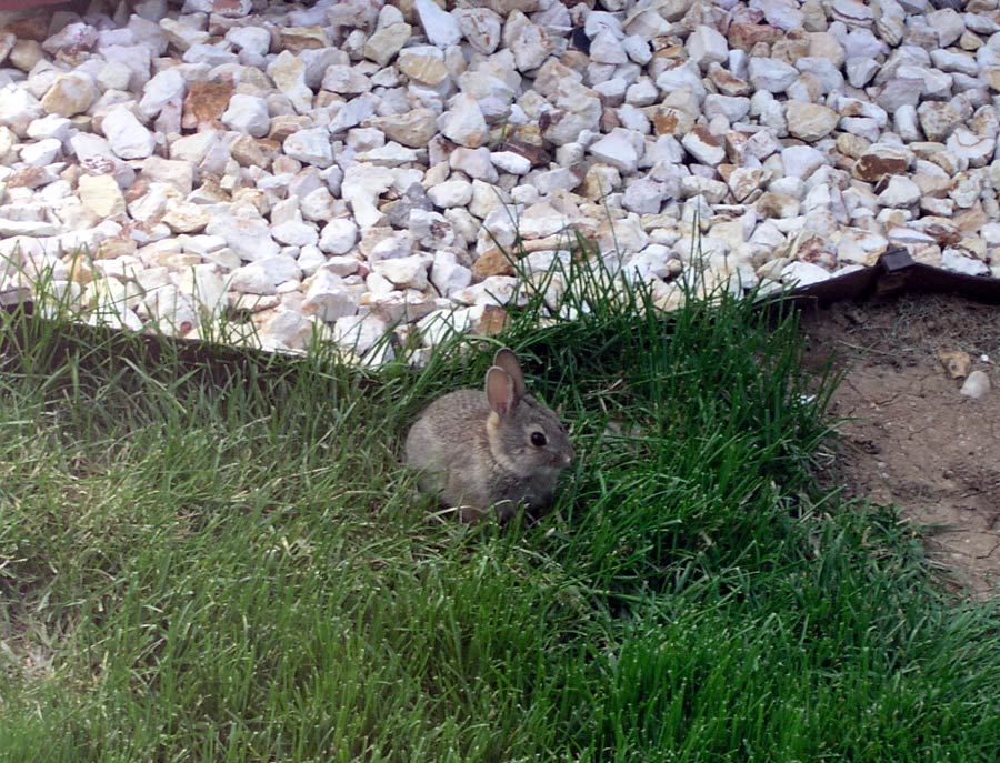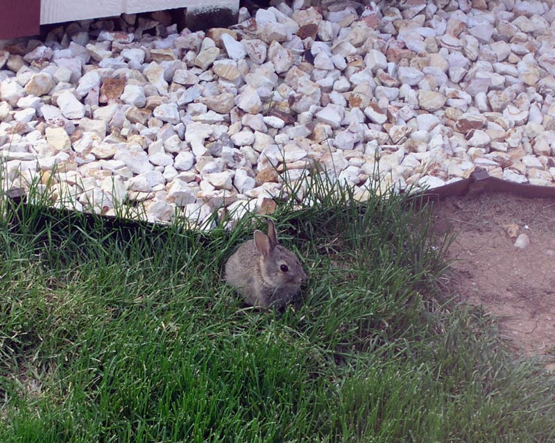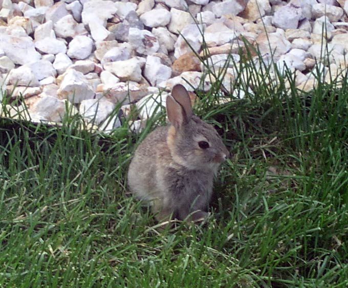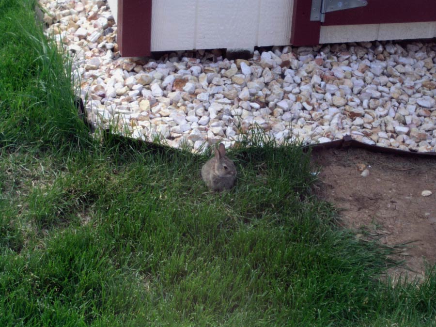 There is this teeny tiny little handful of bunny that has been showing up by our shed. Mike got some pictures of him through the bedroom window today.