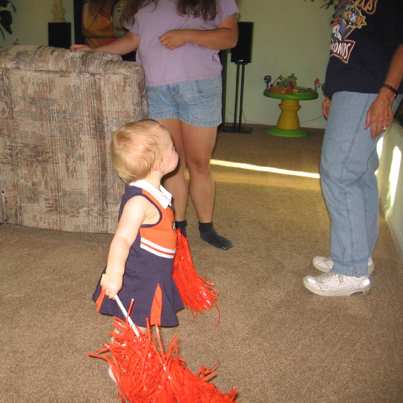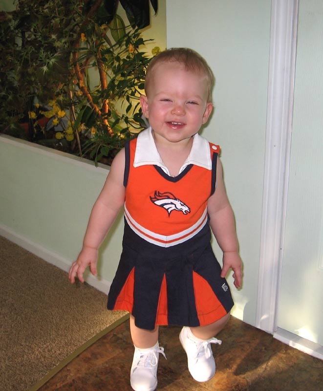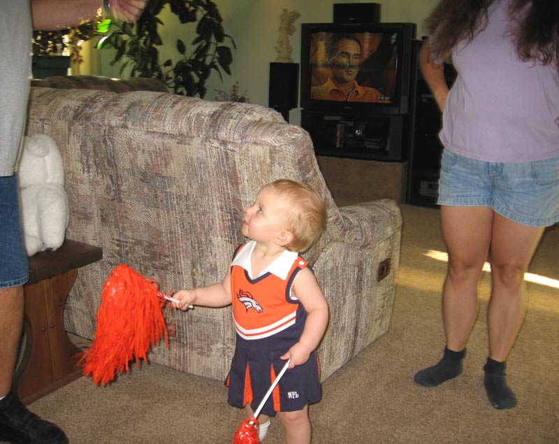 Here's Maddie getting ready to watch the Broncos game at her grandparents' house, with me and Mike's mom in the background: with me and Mike's dad in the background:
