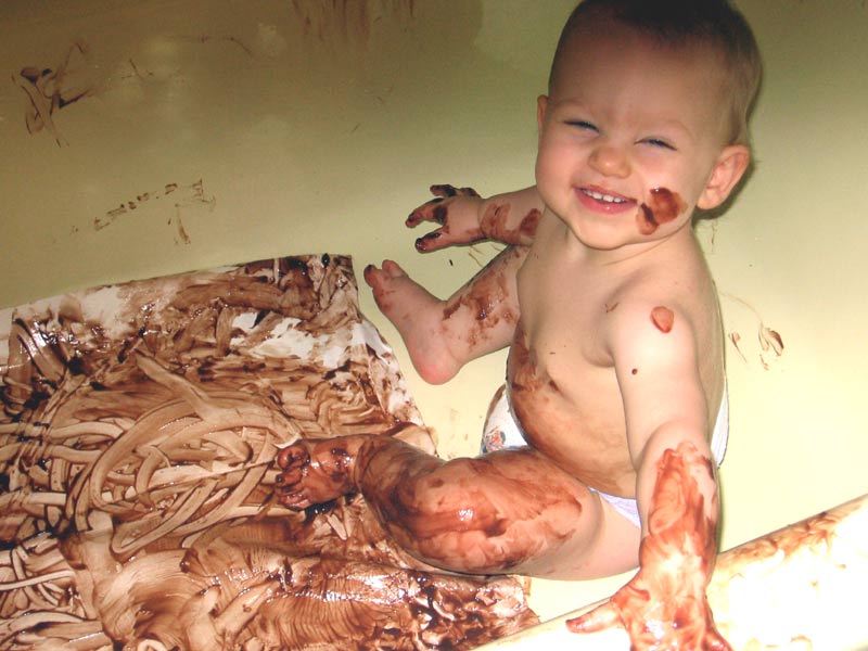 Here are some pictures Rannae and Rob sent of Maddie: Rannae calls this one "Pudding Picasso": (finger painting with pudding in the tub before bath time)