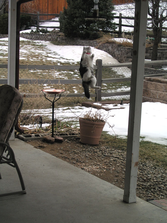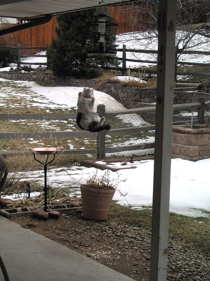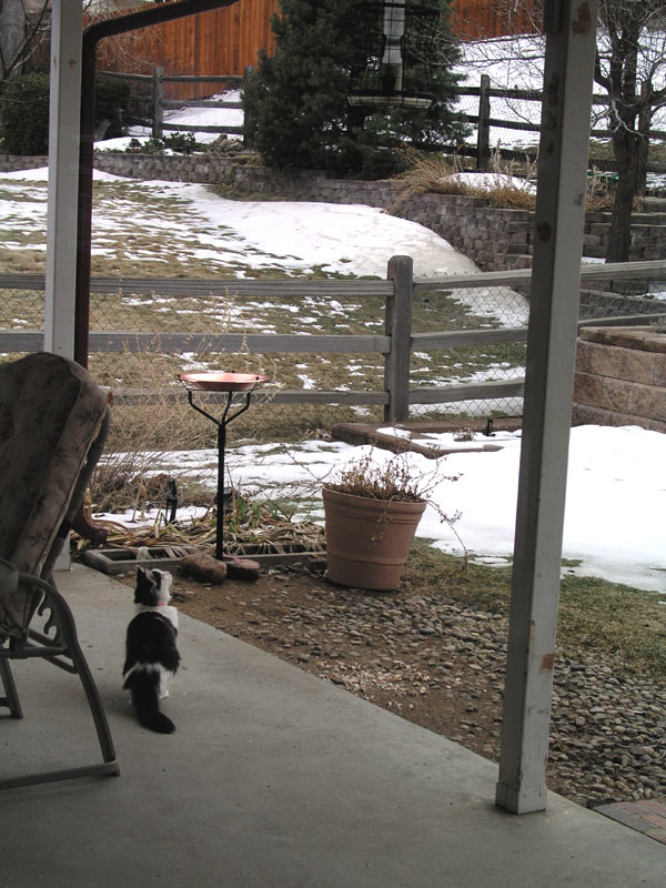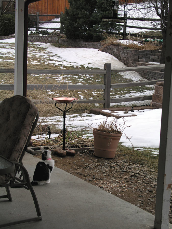 braver about sitting on the patio...and wait? There's a bird in the birdfeeder? Oh, that's it. Months