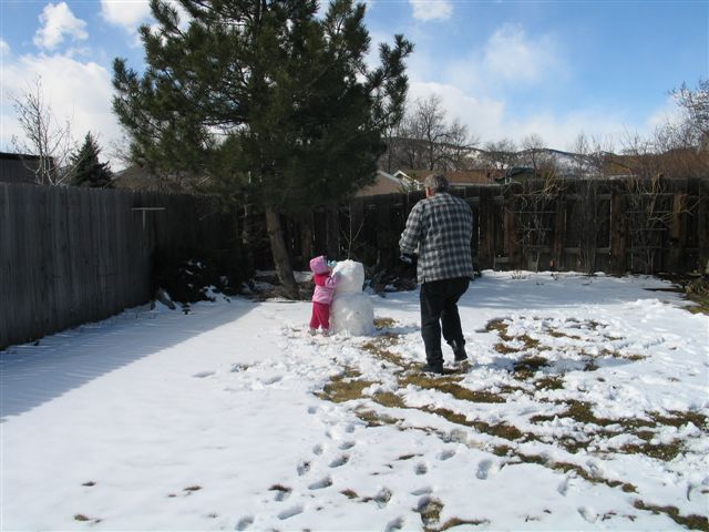 Madeline is enjoying Grandpa's retirement. Today she and Grandpa collaborated and made her first SNOWMAN. Maddie really wanted to throw the snowballs and was a bit puzzled that Grandpa made them so big because she didn't yet know that they would become a Snow being.