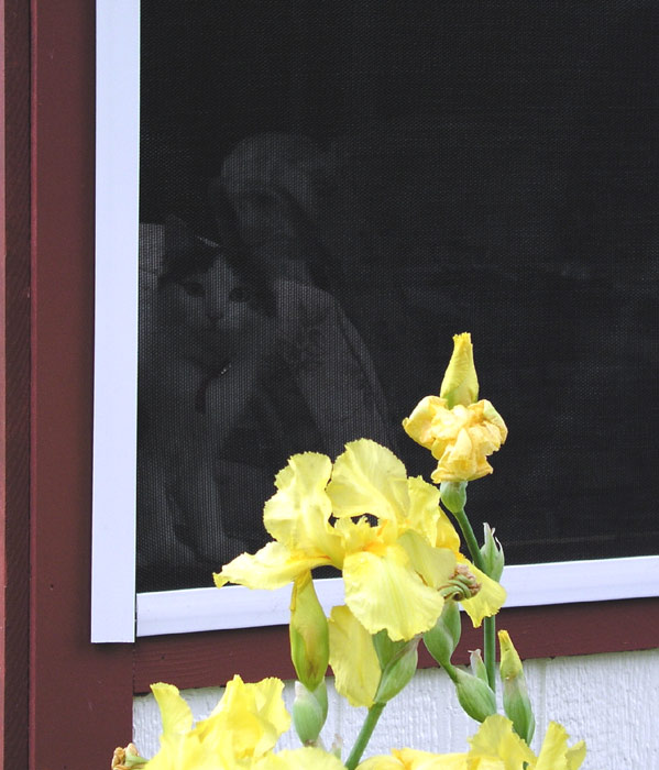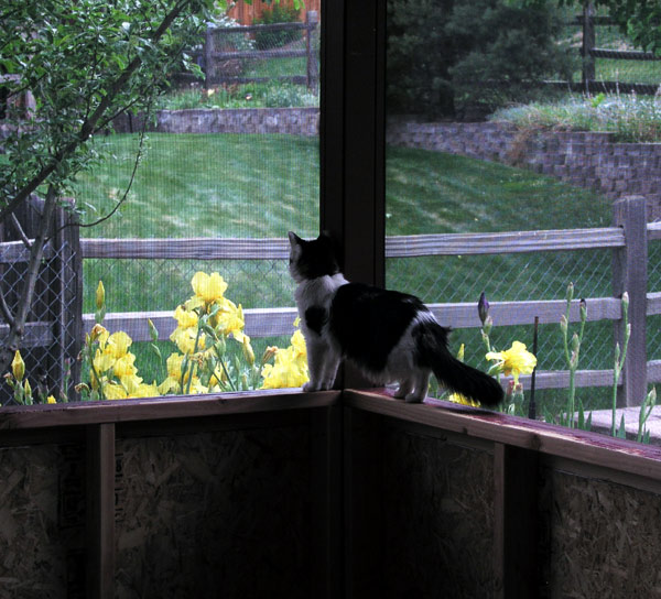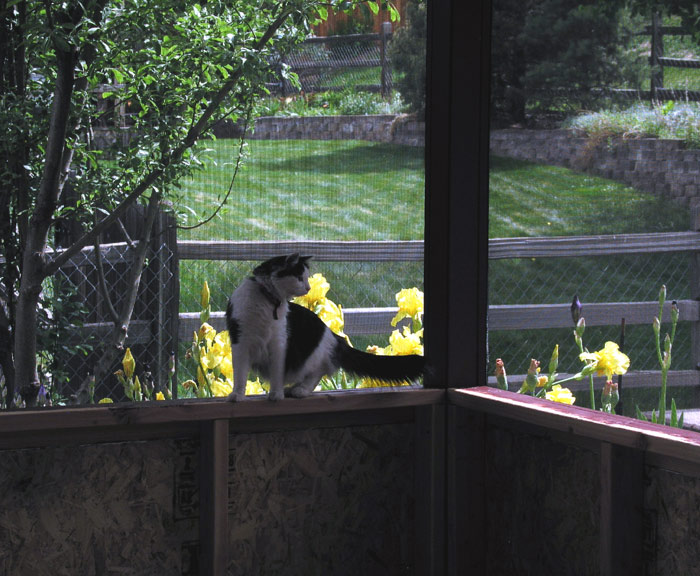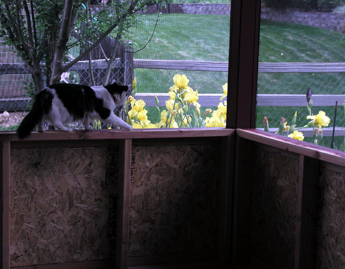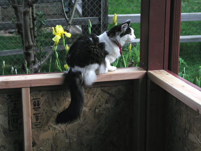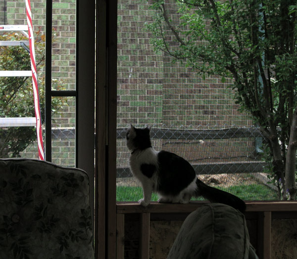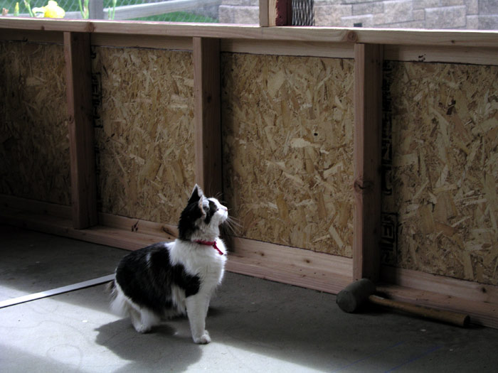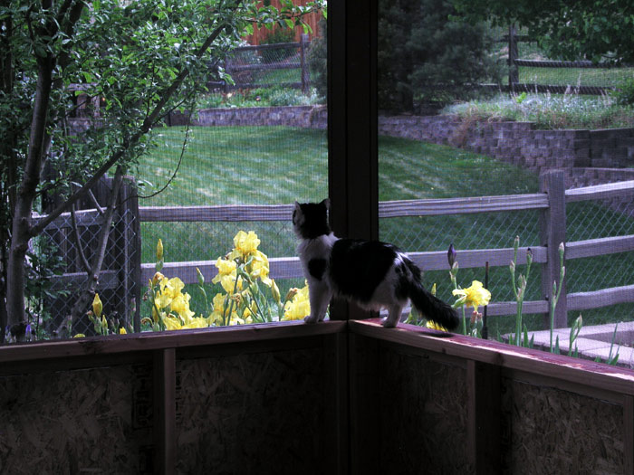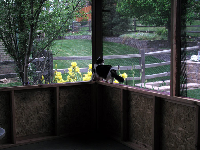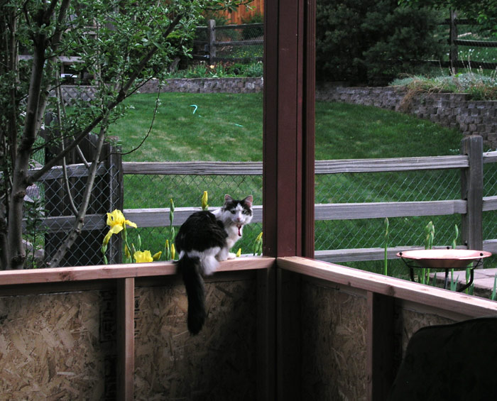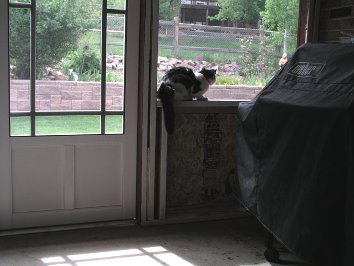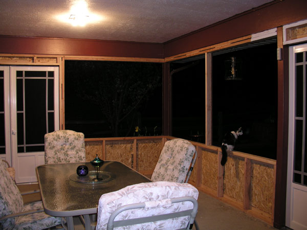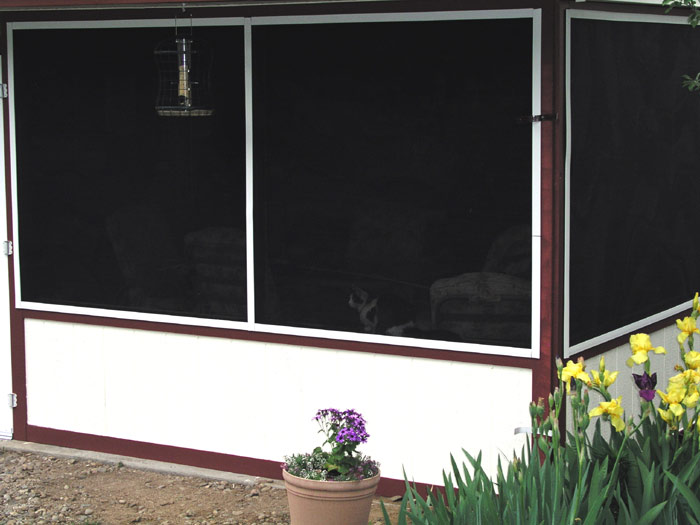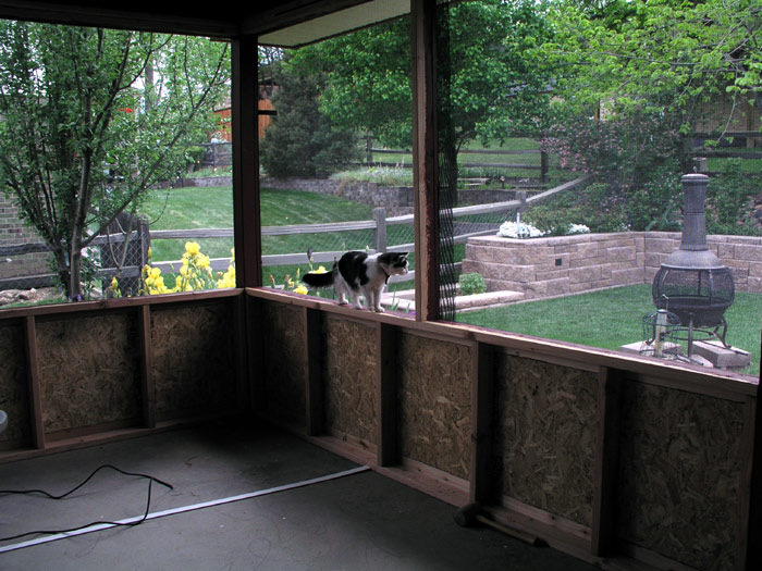 We've been working on a project to enclose the patio - to give us a nice bug free place to sit and to have a place where Chloe can be "outside" unattended. To the latter goal, we bought "pet screen" which is a vinyl-coated fiberglass and much stronger than normal screen. Once we're sure she is properly adjusted and can't get out, we plan to add a pet door, so she'll be able to go in and out at 4 am in the morning by herself...